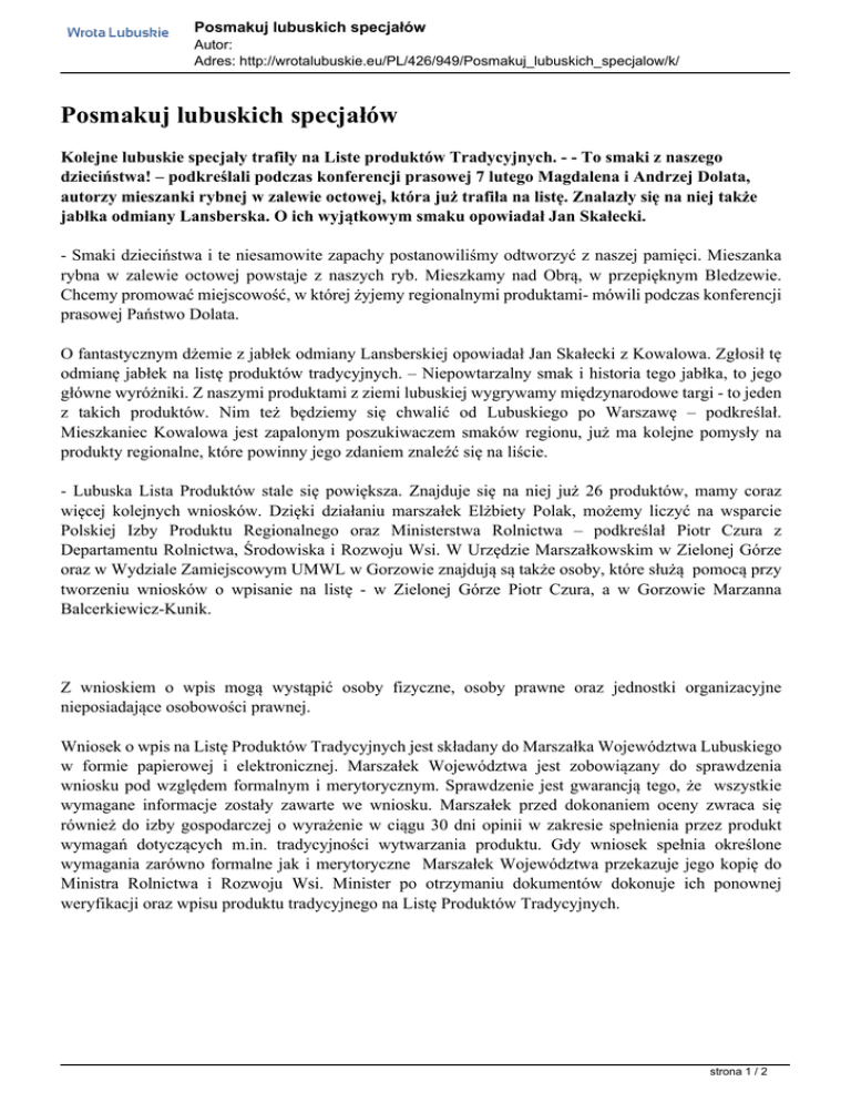 Posmakuj lubuskich specjałów Autor: Adres: http://wrotalubuskie.eu/PL/426/949/Posmakuj_lubuskich_specjalow/k/ Posmakuj lubuskich specjałów Kolejne lubuskie specjały trafiły na Liste produktów Tradycyjnych. - - To smaki z naszego dzieciństwa! – podkreślali podczas konferencji prasowej 7 lutego Magdalena i Andrzej Dolata, autorzy mieszanki rybnej w zalewie octowej, która już trafiła na listę. Znalazły się na niej także jabłka odmiany Lansberska. O ich wyjątkowym smaku opowiadał Jan Skałecki. - Smaki dzieciństwa i te niesamowite zapachy postanowiliśmy odtworzyć z naszej pamięci. Mieszanka rybna w zalewie octowej powstaje z naszych ryb. Mieszkamy nad Obrą, w przepięknym Bledzewie. Chcemy promować miejscowość, w której żyjemy regionalnymi produktami- mówili podczas konferencji prasowej Państwo Dolata. O fantastycznym dżemie z jabłek odmiany Lansberskiej opowiadał Jan Skałecki z Kowalowa. Zgłosił tę odmianę jabłek na listę produktów tradycyjnych. – Niepowtarzalny smak i historia tego jabłka, to jego główne wyróżniki. Z naszymi produktami z ziemi lubuskiej wygrywamy międzynarodowe targi - to jeden z takich produktów. Nim też będziemy się chwalić od Lubuskiego po Warszawę – podkreślał. Mieszkaniec Kowalowa jest zapalonym poszukiwaczem smaków regionu, już ma kolejne pomysły na produkty regionalne, które powinny jego zdaniem znaleźć się na liście. - Lubuska Lista Produktów stale się powiększa. Znajduje się na niej już 26 produktów, mamy coraz więcej kolejnych wniosków. Dzięki działaniu marszałek Elżbiety Polak, możemy liczyć na wsparcie Polskiej Izby Produktu Regionalnego oraz Ministerstwa Rolnictwa – podkreślał Piotr Czura z Departamentu Rolnictwa, Środowiska i Rozwoju Wsi. W Urzędzie Marszałkowskim w Zielonej Górze oraz w Wydziale Zamiejscowym UMWL w Gorzowie znajdują są także osoby, które służą pomocą przy tworzeniu wniosków o wpisanie na listę - w Zielonej Górze Piotr Czura, a w Gorzowie Marzanna Balcerkiewicz-Kunik. Z wnioskiem o wpis mogą wystąpić osoby fizyczne, osoby prawne oraz jednostki organizacyjne nieposiadające osobowości prawnej. Wniosek o wpis na Listę Produktów Tradycyjnych jest składany do Marszałka Województwa Lubuskiego w formie papierowej i elektronicznej. Marszałek Województwa jest zobowiązany do sprawdzenia wniosku pod względem formalnym i merytorycznym. Sprawdzenie jest gwarancją tego, że wszystkie wymagane informacje zostały zawarte we wniosku. Marszałek przed dokonaniem oceny zwraca się również do izby gospodarczej o wyrażenie w ciągu 30 dni opinii w zakresie spełnienia przez produkt wymagań dotyczących m.in. tradycyjności wytwarzania produktu. Gdy wniosek spełnia określone wymagania zarówno formalne jak i merytoryczne Marszałek Województwa przekazuje jego kopię do Ministra Rolnictwa i Rozwoju Wsi. Minister po otrzymaniu dokumentów dokonuje ich ponownej weryfikacji oraz wpisu produktu tradycyjnego na Listę Produktów Tradycyjnych. strona 1 / 2 Posmakuj lubuskich specjałów Autor: Adres: http://wrotalubuskie.eu/PL/426/949/Posmakuj_lubuskich_specjalow/k/ Jabłka odmiany Landsberska – Jan Skałecki Jabłka odmiany Landsberska, zwana czasami Renetą Landsberską, została wyhodowana przez sadownika amatora, radcę prawnego – Theodora Heinrich Otto Burchardta z Gorzowa Wielkopolskiego, syna nadburmistrza miasta Davida Christiana Otto Burchardta. Rodzina ta posiadała podmiejski majątek połączony z okazałym sadem, gdzie Burchardt – syn prowadził doświadczenia pomologiczne. Jabłoń odmiany Landsberska wyhodował w 1840 r., ale pierwsze owoce zrodziła ona dopiero w 1852 r. (tuż przed śmiercią hodowcy). Formalnie za odmianę jabłoni uznano ją po kolejnych kilkunastu latach. W Polsce jabłoń Landsberska uchodzi za zabytek przyrodniczy i nie jest powszechnie uprawiana. Pojedyncze drzewa tej odmiany najczęściej można spotykać w ogródkach przydomowych. Pierwszy założony po wojnie w Gorzowie sad renety landsberskiej powstał na terenie Zespołu Szkół Ogrodniczych w Zieleńcu w 2009 r. Dzięki tej inicjatywie postanowiono popularyzować odmianę jabłoni, która została wyhodowana ponad 170 lat temu na tym terenie. Owoce jabłoni odmiany Landsberska osiągają dojrzałość zbiorczą w ostatniej dekadzie września i w chłodni mogą poleżeć jedynie do połowy grudnia. Jabłka tej odmiany są dość duże z soczystym, wyraźnie winnym miąższem, bogate w sole mineralne i witaminy. Są to owoce deserowe, mające także zastosowanie w przetwórstwie. Jabłka te są dobre do jedzenia na surowo, doskonałe jako dodatek do mięs, zwłaszcza do drobiu, wyśmienite do racuchów, nadają się też na dżemy, moszcz i do jabłecznika. Mieszanka Rybna w zalewie octowej – Magdalena i Andrzej Dolata „Dolatówka” Mieszanka rybna w zalewie octowej przygotowywana jest z rożnego rodzaju mięsa ryb pozyskanych z akwenów wodnych województwa lubuskiego, w szczególności akwenów wodnych mieszczących się na terenie gminy Bledzew takich jak: jezioro Cisie, jezioro Chycińskie czy Zalew Bledzewski, który położony jest w zalesionym wąwozie. Zalew zasilają dwie rzeki - Obra i Struga Jeziorna. Charakteryzuje się on czystością wody, wolnej od zanieczyszczeń przemysłowych, co zdecydowanie przekłada się na niepowtarzalne walory smakowe pozyskiwanych z niego ryb. Przepis według którego przyrządza się ryby w zalewie octowej jest wykorzystywany w tym regionie od bardzo dawna. Ryby po oczyszczeniu z łusek, wypatroszeniu i umyciu należy usmażyć (małe w całości, duże po podzieleniu na kawałki). Usmażone ryby należy włożyć do słoja i zalać wcześniej przygotowaną zalewą z octu, wody, cukru, soli, ziela angielskiego, liści laurowych i cebuli. Tak przygotowany słoik po wystudzeniu należy przenieść do chłodnego miejsca (piwnicy). Mieszanka rybna w zalewie octowej podawana jest na stół przy każdej oka