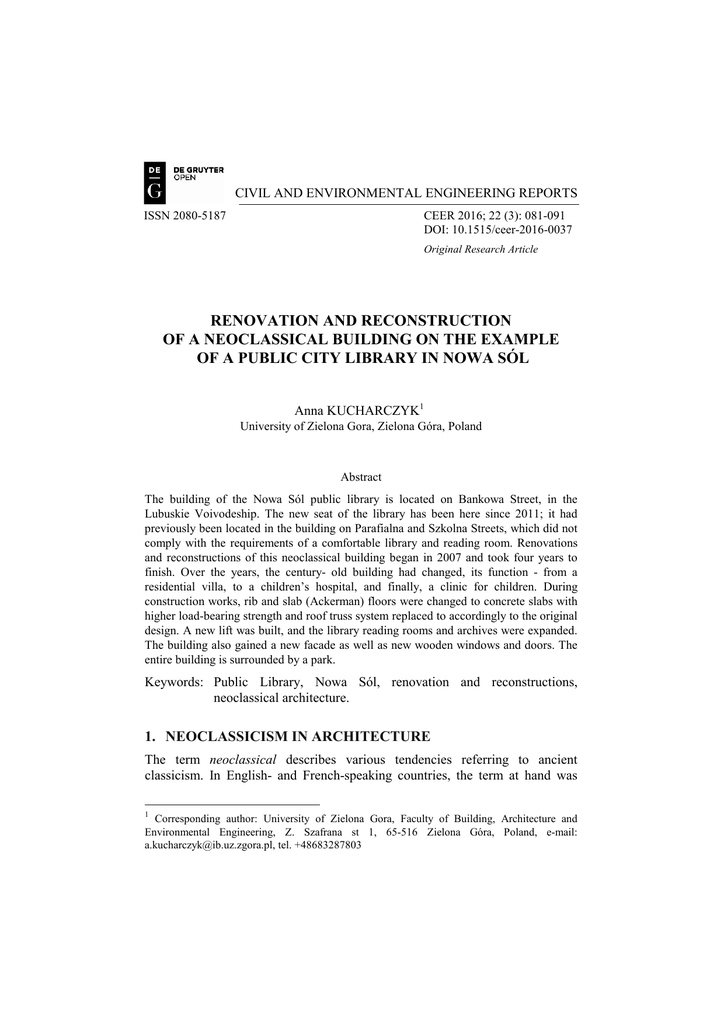 CIVIL AND ENVIRONMENTAL ENGINEERING REPORTS ISSN 2080-5187 CEER 2016; 22 (3): 081-091 DOI: 10.1515/ceer-2016-0037 Original Research Article RENOVATION AND RECONSTRUCTION OF A NEOCLASSICAL BUILDING ON THE EXAMPLE OF A PUBLIC CITY LIBRARY IN NOWA SÓL Anna KUCHARCZYK1 University of Zielona Gora, Zielona Góra, Poland Abstract The building of the Nowa Sól public library is located on Bankowa Street, in the Lubuskie Voivodeship. The new seat of the library has been here since 2011; it had previously been located in the building on Parafialna and Szkolna Streets, which did not comply with the requirements of a comfortable library and reading room. Renovations and reconstructions of this neoclassical building began in 2007 and took four years to finish. Over the years, the century- old building had changed, its function - from a residential villa, to a children’s hospital, and finally, a clinic for children. During construction works, rib and slab (Ackerman) floors were changed to concrete slabs with higher load-bearing strength and roof truss system replaced to accordingly to the original design. A new lift was built, and the library reading rooms and archives were expanded. The building also gained a new facade as well as new wooden windows and doors. The entire building is surrounded by a park. Keywords: Public Library, Nowa Sól, renovation and reconstructions, neoclassical architecture. 1. NEOCLASSICISM IN ARCHITECTURE The term neoclassical describes various tendencies referring to ancient classicism. In English- and French-speaking countries, the term at hand was 1 Corresponding author: University of Zielona Gora, Faculty of Building, Architecture and Environmental Engineering, Z. Szafrana st 1, 65-516 Zielona Góra, Poland, e-mail: [email protected], tel. +48683287803 82 Anna KUCHARCZYK applied interchangeably to classicism in the middle of the XVIII century as a movement in direct opposition to baroque architecture. The neoclassical school made the biggest impact in areas where the not popular enough opulence of rococo or baroque began to be replaced with solutions typical of antique architecture, stemming mainly from ancient Greece. Here, the mentioned replacement took the form of simplicity and moderation connected with the lightness of the entire building. The main characteristics of the neoclassical movement [1]: • applying the orders of ancient architecture, • modeled on buildings of Greek and Roman architecture, • buildings constructed on the compact layout of a circle or rectangle, • application of colonnades and column porticos, • aiming to achieve the effect of harmony, symmetry and a balanced composition, • linear facades, • limited ornamentation. 2. HISTORICAL BACKGROUND OF THE CITY PUBLIC LIBRARY BUILDING IN NOWA SÓL Nowa Sól is the third in terms of size district (poviat) city in the Lubuskie voivodeship, located on the strip of the Trzebnicki Embankment, on the left bank of the Odra River. The city is currently inhabited by approx. 40 thousand people [7] (demographic data as of December 2014), of which approx. 25% are under working age. Industry is the dominant role in the region, with culture being poorly developed and insufficiently financed. The young society is revealing increasing needs in terms of education and culture. The City Public Library (Miejska Biblioteka Publiczna - MBP) building is located on Bankowa 3 Street, with the land property reference number of 604. The former building of the MBP did not guarantee free and comfortable access to its collection. The available area was too small and the reading rooms did not fulfill the needs of the large numbers of readers who used scientific literature, magazines and multimedia [5]; it also lacked space for computer workstations with access to the internet. On top of this, there were many architectural obstacles that posed a problem for the disabled. RENOVATION AND RECONSTRUCTION OF A NEOCLASSICAL BUILDING ON THE EXAMPLE OF A PUBLIC CITY LIBRARY IN NOWA SÓL 83 2.1. Historical background of City Public Library building in Nowa Sól The building of the City Public Library in Nowa Sól was constructed in the years 1900-1914. The first owner of the villa was the chief executive officer of the thread factory Gruschwitz Textilwerke - Karl Janson. A city park was created on land properties west of the building that had not been developed, in the years 1927-1930. During World War II, the building was severely damaged; following the war, it was adapted, completely changing the spatial layout of the interior, to a children's ward of the city hospital, which was closed down in 1980. Over the next two years, the building was subjected to renovation work and adapted to serve as a children's specialist clinic and next, non-government health care centers and private residences [3]. Besides documentation in the form of postcards, no documents concerning the design and construction of the building remain. In 2007, the European Union project to transfer the City Public Library was commenced and reconstruction and renovation works on the building were initiated. The construction works were finished in 2010, and on 1 January 2011, the library began to operate from its new location. Fig. 1. View of the building from the direction of the city park. Postcard from the 30's of the XX century. Source: Collection of the City Museum in Nowa Sól. 84 Anna KUCHARCZYK 3. ARCHITECTURE OF THE BUILDING PRIOR TO RENOVATON AND RECONSTRUCTION The building had been constructed in a neoclassical style. Along with the surrounding park, it fit the urban landscape of the city on the verge of the XIX and XX centuries ideally, representing a group of residences inhabited by the Nowa Sól factory owners. The 2-axis northern elevation is divided into fields with pilasters. A 2-axis inset adorned with volutes and crowned with a triangular peak is found in the roof slope. The entry doors are found on the east elevation of the building, along w