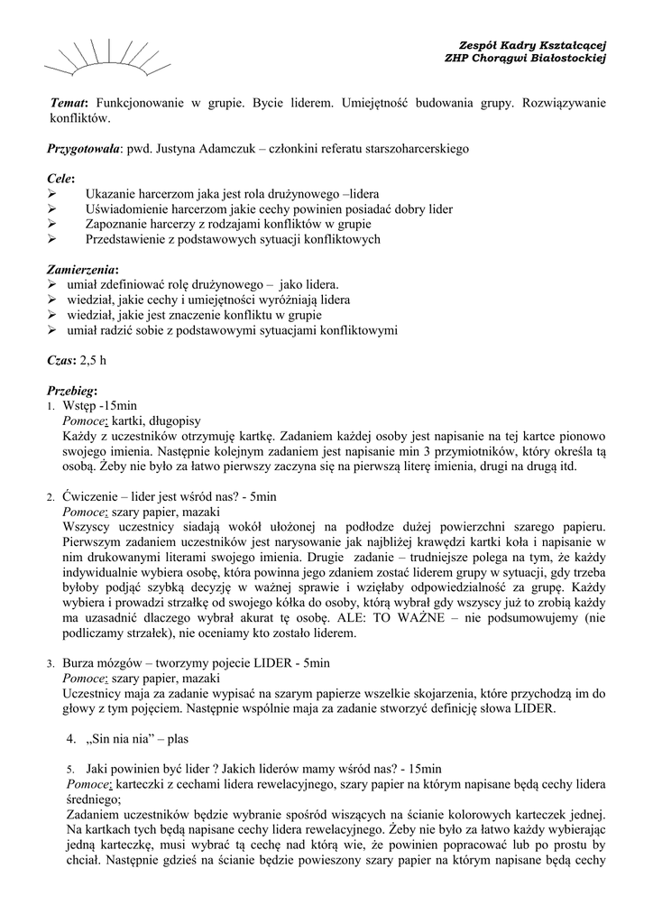 Zespół Kadry Kształcącej ZHP Chorągwi Białostockiej Temat: Funkcjonowanie w grupie. Bycie liderem. Umiejętność budowania grupy. Rozwiązywanie konfliktów. Przygotowała: pwd. Justyna Adamczuk – członkini referatu starszoharcerskiego Cele: Ukazanie harcerzom jaka jest rola drużynowego –lidera Uświadomienie harcerzom jakie cechy powinien posiadać dobry lider Zapoznanie harcerzy z rodzajami konfliktów w grupie Przedstawienie z podstawowych sytuacji konfliktowych Zamierzenia: umiał zdefiniować rolę drużynowego – jako lidera. wiedział, jakie cechy i umiejętności wyróżniają lidera wiedział, jakie jest znaczenie konfliktu w grupie umiał radzić sobie z podstawowymi sytuacjami konfliktowymi Czas: 2,5 h Przebieg: 1. Wstęp -15min Pomoce: kartki, długopisy Każdy z uczestników otrzymuję kartkę. Zadaniem każdej osoby jest napisanie na tej kartce pionowo swojego imienia. Następnie kolejnym zadaniem jest napisanie min 3 przymiotników, który określa tą osobą. Żeby nie było za łatwo pierwszy zaczyna się na pierwszą literę imienia, drugi na drugą itd. 2. Ćwiczenie – lider jest wśród nas? - 5min Pomoce: szary papier, mazaki Wszyscy uczestnicy siadają wokół ułożonej na podłodze dużej powierzchni szarego papieru. Pierwszym zadaniem uczestników jest narysowanie jak najbliżej krawędzi kartki koła i napisanie w nim drukowanymi literami swojego imienia. Drugie zadanie – trudniejsze polega na tym, że każdy indywidualnie wybiera osobę, która powinna jego zdaniem zostać liderem grupy w sytuacji, gdy trzeba byłoby podjąć szybką decyzję w ważnej sprawie i wzięłaby odpowiedzialność za grupę. Każdy wybiera i prowadzi strzałkę od swojego kółka do osoby, którą wybrał gdy wszyscy już to zrobią każdy ma uzasadnić dlaczego wybrał akurat tę osobę. ALE: TO WAŻNE – nie podsumowujemy (nie podliczamy strzałek), nie oceniamy kto zostało liderem. 3. Burza mózgów – tworzymy pojecie LIDER - 5min Pomoce: szary papier, mazaki Uczestnicy maja za zadanie wypisać na szarym papierze wszelkie skojarzenia, które przychodzą im do głowy z tym pojęciem. Następnie wspólnie maja za zadanie stworzyć definicję słowa LIDER. 4. „Sin nia nia” – plas Jaki powinien być lider ? Jakich liderów mamy wśród nas? - 15min Pomoce: karteczki z cechami lidera rewelacyjnego, szary papier na którym napisane będą cechy lidera średniego; Zadaniem uczestników będzie wybranie spośród wiszących na ścianie kolorowych karteczek jednej. Na kartkach tych będą napisane cechy lidera rewelacyjnego. Żeby nie było za łatwo każdy wybierając jedną karteczkę, musi wybrać tą cechę nad którą wie, że powinien popracować lub po prostu by chciał. Następnie gdzieś na ścianie będzie powieszony szary papier na którym napisane będą cechy 5. Zespół Kadry Kształcącej ZHP Chorągwi Białostockiej lidera średniego. Zadaniem uczestników będzie przyklejenie obok cech lidera średniego cech przeciwstawnych o których powinien każdy dobry lider pamiętać i nad nimi pracować. Portret lidera – podsumowanie - 20min. Pomoce: kolorowe czasopisma, kleje, mazaki, brystole W grupach (według karteczek z poprzedniego ćwiczenia) harcerze mając do dyspozycji czasopisma, mazaki itp. Maja za zadanie stworzyć portret Lidera sumując dotychczasowe wiadomości. Oraz wypisać umiejętności jakie ich zdaniem drużynowy powinien posiadać w celu zbudowania mocnej, zgranej grupy. Prezentacja. 6. 7. Nigdy nie… - zabawa 8. Pojęcie konfliktu - 10min Pomoce: kolorowe karteczki, długopisy Prowadzący wysypuje na środek kolorowe karteczki. Uczestnicy maja za zadanie wypisać na nich swoje definicje konfliktu. Następnie prosi chętnych o odczytanie. I sam przyczepia na planszy definicje: „Konflikt to zjawisko powszechne, nieuchronnie związane z życiem społecznym. Pojęcie konfliktu można rozpatrywać w różnych aspektach np. jako proces, w którym jednostka lub grupa dąży do osiągnięcia własnych celów przez wyeliminowanie, podporządkowanie sobie bądź zniszczenie jednostki lub grupy dążącej do celów podobnych lub identycznych. Występująca sprzeczność interesów powoduje walkę, jakieś starcie przeciwstawnych sobie sił.” 9. Przyczyny konfliktów - 10min. Pomoce: drogowskazy z sygnałami nadchodzących konfliktów Prowadzący mówi: „Konflikt nigdy nie pojawia się znienacka. Poprzedzają go liczne sygnały, które jeśli zaczniemy je dostrzegać mogą pomóc nam w jego zrozumieniu i wykorzystaniu do transformacji. Pewne Sygnały dosyć łatwo wychwycić. Należy sobie zdawać sprawę, że im wcześniej je zauważymy tym łatwiej jest nam dany konflikt przekształcić. Osoba, która będzie chciała się tym zająć nie może opowiadać się za żadną ze stron. Inaczej : powinna umieć opowiedzieć się za każdą. Konflikt jest sygnałem do transformacji, do zmiany punktu widzenia, do otworzenia się na nowe idee i pomysły, do dostrzeżenia porządku w chaosie, do podniesienia świadomości i poczucia odpowiedzialności. Konflikt nie musi kończyć się ofiarami lub " zwycięstwem " jednej ze stron, jeżeli nauczymy się wszyscy w pewien sposób " umierać ". Oznacza to umiejętność nie przywiązywania się do swojego poczucia ważności i odrębności.” Prowadzący pokazuje wcześniej przygotowane drogowskazy na których znajdują się sygnały: Zakłócona komunikacja - ludzie nie mówią o wszystkim, są zamknięci lub przesadnie uprzejmi. Pojawia się plotka - ludzie plotkują potajemnie na różne tematy Tworzą się grupy - ludzie w sposób mniej lub bardziej widoczny dzielą się na obozy i frakcje, które stopniowo się od siebie oddalają. Pojawia się sabotaż - człowiek lub grupa ludzi świadomie lub nieświadomie sabotuje działania i pomysły większości. Pojawia się tyran - lider lub większość próbują zaprowadzić porządek stosując jawne lub ukryte represje. Nadchodzi burza - wszyscy