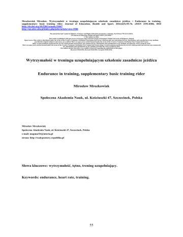 Mrozkowiak Mirosław. Wytrzymałość w treningu uzupełniającym szkolenie zasadnicze jeźdźca = Endurance in training, supplementary basic training rider. Journal of Education, Health and Sport. 2016;6(5):55-76. eISSN 2391-8306. DOI http://dx.doi.org/10.5281/zenodo.51047 http://ojs.ukw.edu.pl/index.php/johs/article/view/3508 The journal has had 7 points in Ministry of Science and Higher Education parametric evaluation. Part B item 755 (23.12.2015). 755 Journal of Education, Health and Sport eISSN 2391-8306 7 © The Author (s) 2016; This article is published with open access at Licensee Open Journal Systems of Kazimierz Wielki University in Bydgoszcz, Poland Open Access. This article is distributed under the terms of the Creative Commons Attribution Noncommercial License which permits any noncommercial use, distribution, and reproduction in any medium, provided the original author(s) and source are credited. This is an open access article licensed under the terms of the Creative Commons Attribution Non Commercial License (http://creativecommons.org/licenses/by-nc/4.0/) which permits unrestricted, non commercial use, distribution and reproduction in any medium, provided the work is properly cited. This is an open access article licensed under the terms of the Creative Commons Attribution Non Commercial License (http://creativecommons.org/licenses/by-nc/4.0/) which permits unrestricted, non commercial use, distribution and reproduction in any medium, provided the work is properly cited. The authors declare that there is no conflict of interests regarding the publication of this paper. Received: 05.04.2016. Revised 25.04.2016. Accepted: 05.05.2016. Wytrzymałość w treningu uzupełniającym szkolenie zasadnicze jeźdźca Endurance in training, supplementary basic training rider Mirosław Mrozkowiak Społeczna Akademia Nauk, ul. Kościuszki 47, Szczecinek, Polska Mirosław Mrozkowiak Społeczna Akademia Nauk, ul. Kościuszki 47, Szczecinek, Polska e-mail: [email protected] strona: http://wadypostawy.republika.pl Słowa kluczowe: wytrzymałość, tętno, trening uzupełniający. Keywords: endurance, heart rate, training. 55 Streszczenie Wstęp. Publikacji na temat kształtowania wytrzymałości u jeźdźców w dostępnej literaturze jest bardzo mało. W sporcie kwalifikowanym należy zająć się przygotowaniem do zawodów nie tylko konia ale również jeźdźca. Cel. Wykazanie skuteczności zastosowanego wysiłku fizycznego w doskonaleniu poziomu wytrzymałości ogólnej jeźdźców WKKW. Materiał i metodyka. Badania przeprowadzono na 10 zawodnikach wąskiej kadry jeźdźców WKKW podczas zgrupowania sportowo-rehabilitacyjnego. Wysiłek standardowy to bieg ciągły na dystansie 1 km w czasie 5 min. Pomiary tętna przeprowadzane były w pierwszych i ostatnich dniach zgrupowania po obciążeniu standardowym. Wyniki. Największe odchylenie stanowiące górną granicę w stosunku do wartości średniej tętna powysiłkowego posiada zawodnik nr 9: 30 uderzeń, a najmniejsze zawodnik nr 7: 25 uderzeń przy średniej 24,3. Żaden z zawodników podczas 1 i 2 pomiaru (10 i 20 sekunda) nie posiada wartości niższych od wartości średniej. Wnioski. 1. Zmiany jakie zaszły pomiędzy 1 i 2 badaniem zwiększyły adaptacje organizmu do wysiłku wytrzymałościowego. 2. Częstość pracy serca przy obciążeniu stosowanym podczas zgrupowania jest wielkością zmienną i indywidualną. 56 3. Doskonalenie pracy układu sercowo- naczyniowego rozwinęła się u poszczególnych badanych indywidualnie. 4. Należy obiektywnymi metodami badawczymi sprawdzić przydatność tego treningu wytrzymałości w jeździeckich zawodach sportowych. Abstract Introduction publications on shaping the endurance riders in the open literature is very little. In the sport of certified professional preparation should be addressed not only the horse but also a rider. Goal. To demonstrate the effectiveness of applied physical exertion in the improvement of the level of the overall strength of the three-day event riders. Material and methods. The study was conducted on 10 players a narrow cadre of eventing riders during rehabilitation and sports camps. The effort is a continuous run at standard 1 km at a time 5 min. Pulse Measurements are carried out in the first and last days of the grouping after the workload standard. The results. The largest deviation being the upper limit in relation to the average pulse rate after exercise has a player No 9:30 strokes, and the smallest player no. 7:25 strokes with an average 24.3. None of the players during the 1 and 2 (10 and 20 second) does not have a value lower than the value of the average. Conclusions. Changes that have taken place 57 between 1 and 2 test increased adaptations to endurance exercise. Heart rate with a load of used when grouping is the size of the variable and the individual. Improvement of the work of the cardiovascular system has evolved in each test individually. You need objective research methods to check the usefulness of the training in equestrian sports competitions. 1. Wstęp Publikacji na temat kształtowania wytrzymałości u jeźdźców w dostępnej literaturze jest bardzo mało. W sporcie kwalifikowanym należy zająć się przygotowaniem do zawodów nie tylko konia ale również jeźdźca. Fizjologia wysiłku fizycznego wypowiada się na temat tętna u sportowców uprawiających dyscypliny typowo wytrzymałościowe: biegi długie, średnie, pływanie, kolarstwo i wieloboje. Brouha podaje, że częstość skurczów serca w czasie pracy i po jej zakończeniu w wystarczający sposób odzwierciedla fizjologiczny stan ustroju. Andriew G. M., Gularia W. D. na przykładzie dwóch grup dzieci uprawiających pływanie oraz na zespole niezaangażowanym w żadnej dyscyplinie sportowej wykazali, że trening pływacki powoduje zmniejszenie częstości tętna. Mc Avdlew W. D. [1990], Glaser R. G. i Magiel J. R. 58 [1991] porównując omawiane wartości na przykładzie za