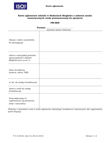 Karta zgłoszenia Karta zgłoszenia udziału w Badaniach Biegłości z zakresu analiz sensorycznych wody przeznaczonej do spożycia PM-SEN Termin:………………………………. (prosimy wpisać właściwy) Nazwa i adres uczestnika: Nr akredytacji: Adres e-mail gdzie przesłać sprawozdanie z Badań Biegłości (patrz punkt 7): Dane do faktury (nazwa, adres, NIP): nr tel. do osoby kontaktowej: Adres e-mail do osoby kontaktowej: Przewidywany/ni wykonawca/cy pomiarów (imię i nazwisko): *Prosimy o przesłanie wraz z kartą zgłoszenia aktualnego świadectwa wzorcowania dla wyposażenia (jeżeli dotyczy). F-4.4.20.02, wyd. II z 20.12.2016 Strona 1 z 2 Karta zgłoszenia Wypełnioną i podpisaną kartę zgłoszenia prosimy przesłać faksem na numer: 58 741 84 97 lub na e-mail: [email protected] Firma Doradcza ISOTOP s.c. A. Wilczyńska-Piliszek, S. Piliszek ul. Gen. J. Sowińskiego 4/6, 80-143 Gdańsk tel: 58 380 36 94, fax: 58 741 84 97 NIP: PL 5833132656 Opłata za uczestnictwo w Badaniach Biegłości przez porównania międzylaboratoryjne wynosi: 350 zł netto + 23% VAT - 1 zestaw (analityk) Dodatkowy zestaw: 150 zł netto + 23% VAT Łącznie: zł netto + 23% VAT Opłatę należy wnieść na podstawie faktury VAT z 14 dniowym terminem płatności wystawionej przez Firmę Doradczą ISOTOP s.c. Faktura VAT zostanie przesłana listem w terminie wysyłki próbek do laboratorium. Wniesienie opłaty jest warunkiem uczestnictwa w Badaniach Biegłości – otrzymania raportu z Badań Biegłości. Za zakończenie usługi uznaje się dzień terminu odsyłania wyników przez Uczestników Badań Biegłości. 1. 2. 3. 4. 5. 6. 7. Sprawozdanie z Badań Biegłości zostanie opracowane i wysłane uczestnikom najpóźniej po upływie 8 tygodni od dnia ich zakończenia. Uczestnik Badań Biegłości ma prawo do złożenia pisemnej reklamacji w terminie 30 dni od daty otrzymania Sprawozdania z Badań Biegłości. Przesłanie wypełnionej Karty Zgłoszeniowej uznaje się za przyjęcie warunków realizacji Badań Biegłości określonych w Karcie Zgłoszenia oraz w Programie. W przypadku zmiany terminu organizacji badań biegłości wyrażam zgodę na przeniesienie zgłoszenia na nowy termin – bez potrzeby ponownego wysyłania karty zgłoszenia oraz dodatkowych dokumentów. Wyrażam zgodę na przetwarzanie przez Firmę Doradczą ISOTOP s.c. danych osobowych uczestników, zgodnie z ustawą o ochronie danych osobowych (Dz. U. 1997 nr 133, poz. 883 z późn. zm.) Rezygnacje przyjmujemy wyłącznie w formie pisemnej jednak nie później niż na 7 dni przed realizacją Badań Biegłości. Po tym terminie zgłaszający poniesie 50% kosztów Badań Biegłości. W przypadku gdy laboratorium chce otrzymać wersję papierową sprawozdania powinno wpisać adres pocztowy w polu „Adres e-mail gdzie przesłać sprawozdanie z Badań Biegłości”, co będzie skutkowało otrzymaniem wersji papierowej. Opłata za papierową wersję sprawozdania z badań biegłości wynosi dodatkowo 120 zł netto (+23% VAT) do ceny udziału w badaniach biegłości. Nie udzielamy rabatów na tę opłatę. ......................................... data i podpis osoby upoważnionej F-4.4.20.02, wyd. II z 20.12.2016 Strona 2 z 2