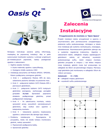 ™ Oasis Qt Zalecenia Instalacyjne Przygotowanie do montażu w ‘Open Space’ Projekt instalacji należy przygotować w oparciu o zwymiarowany plan pomieszczenia uwzględniający położenie sufitu podwieszanego, istniejące w lokalu inne instalacje jak systemy wentylacyjne, zraszające, oświetleniowe. Rozmieszczenie głośników planuje się Niniejsza instrukcja niezbędną do zawiera pełną poprawnej instalacji. informację, Aby w pełni w systemie regularnej głośnikami po-instalacyjnych podwieszanego należy postępować zgodnie z zaleceniami. Zgodnie z zaleceniami tabeli, odległości między sąsiadującymi wykorzystać możliwości systemu i uniknąć uciążliwych poprawek, kratownicy. zależą od sufitu. aktualnej Jeżeli miejsce wysokości montażu głośnika przypada w miejscu / lub blisko miejsca ¾ Ogólne zasady montażu innej instalacji, głośnik może być przesunięty na ◊ Użyte materiały zgodne z specyfikacją, odległość do 60cm od pierwotnego miejsca. Pierwszy ◊ Dostępne źródło zasilania 230V rząd głośników jest montowany w odległości 50cm do ¾ Instalację zaczynamy od Modułu SPS30 / SPS300, 140cm od ściany. Potem podłączamy szeregowo głośniki, Zależność: ◊ Krok 1 – podłączenie Modułu SPS do sieci, D – odległość między głośnikami ustawienie poziomu dźwięku na poziomie max. H = f(D) H – wysokość sufitu podwieszanego ◊ Krok 2 – połączenie kablem CAT3 Modułu SPS z pierwszym głośnikiem, ◊ Krok 3 - połączenie kablami CAT3 kolejnych głośników szeregowo, porządek zachowując gniazdek in/out. Sprawdzić działanie podłączonego poprawne głośnika, przed podłączeniem kolejnego. ◊ Krok 4 – Po zakończeniu montażu, należy sprawdzić pracę wszystkich zainstalowanych głośników, idąc wzdłuż sieci zgodnie z kolejnością montażu. ◊ Krok 5 – Ustawienie poziomu maskowania zgodnie z zaleceniami dla danego typu lokalu. ¾ Problemy instalacyjne - Rozwiązania. W przypadku, kiedy nie działa kolejny montowany głośnik, należy sprawdzić: ◊ Poprawność podłączenia kabla, ◊ Sprawność głośnika H – /cm/ 240 260 280 300 360 D – /cm/ 240 300 300 300 360 Przygotowanie do montażu w gabinetach, 4. Pierwszy głośnik łączymy kablem CAT3 z modułem. pokojach konferencyjnych i korytarzach Rekomendacje dotyczą pomieszczeń zamkniętych, o powierzchni do 55m2. W większych pomieszczeniach stosuje się ten sam model montażu, jak do Open Przygotowane kable Cat 3 Space. Powierzchnia m 2 Ilość Typowy głośników montaż < 16 2 16 - 23 3 23 - 30 4 30 - 39 5 39 - 55 6 Obniżony sufit ściana Moduł sterujący z połączeniem kablowym w otworze ściennym Rys. 1 5. Podłączamy 4 głośniki do modułu kontrolnego. Sprawdzamy czy wszystkie głośniki pracują normalnie. W ten sposób, również sprawdzamy funkcje wszystkich 4 kanałów modułu. 6. UWAGA: podłączając kable CAT3 należy zwrócić uwagę, na oznaczenia każdego z głośników Instalacja w korytarzach Głośniki montujemy zachowując odległość około 3m między głośnikami, w taki sposób, żeby pierwszy i In - ostatni głośnik był oddalony od ściany zamykającej 7. Włożyć baterię do pilota. max. 1,5m. Ilustracja - Diagram A. W zależności od tego, jaki poziom maskowania chcemy osiągnąć w różnych miejscach korytarza, instalujemy jedną lub więcej stref. Chcąc zapewnić maksymalną zamkniętych, prywatność rozmów należy ustawić Out - w biurach maksymalny poziom maskowania w minimum 2 strefach. 8. Przełączając pilotem przez wszystkie poziomy natężenia emisji należy sprawdzić, czy wszystkie głośniki prawidłowo reagują na zmiany. Podczas montażu ustawić najwyższy poziom emisji, co pozwoli na sprawdzenie kolejnych podłączanych głośników, a także pozwoli wykryć ewentualny problem. 9. Zalecana jest instalacja dodatkowego głośnika bezpośrednio w sąsiedztwie modułu kontrolnego. Pozwoli to na łatwą rejestrację zmian poziomu maskowania. 10. Zaleca się umieszczenie etykiet na każdym module kontrolnym, co ułatwia obsługę systemu w sytuacjach, kiedy mamy do czynienia z bardziej skomplikowaną Diagram A: instalacją wielo-strefową. Instalacja Modułu Kontrolnego 1. Należy wybrać odpowiednie miejsce do montażu Instalacja głośników modułu kontrolnego, około 5m od pierwszego głośnika 1. W miarę możliwości, zalecane jest zebranie w jednym (Rys. 1). Z reguły moduły kontrolne umieszcza się w miejscu wszystkich płyt podsufitowych. przylegających pomieszczeniach pomocniczych. 2. Do wycięcia otworów w płytach, należy użyć piłę 2. Jeżeli w jednym pomieszczeniu jest montowanych dołączoną do zestawu. Otwór w płycie, z reguły powinien kilka modułów kontrolnych, należy je montować w się znajdować w centralnym miejscu. W sytuacjach odległości montażowych, gdzie nie sufitów podwieszanych, używamy >30cm jeden od drugiego. W innym przypadku występuje ryzyko komunikacji pilota z mocowań innego typu. niewłaściwym modułem kontrolnym. informacji 3. Moduł należy montować w pobliżu gniazdka 230V. Przykładowe propozycje nietypowych montaży głośników - prosimy o W celu kontakt uzyskania z dokładnej dystrybutorem. 3. Przed montażem głośnika, należy przekręcić pierścień mocujący ruchem przeciwnym do wskazówek zegara i odłączyć go od głośnika. Następnie wkładamy głośnik do otworu w płycie tak, aby był skierowany na przestrzeń biura. Zakładamy pierścień mocujący na głośnik, dociskamy do płyty podsufitowej i blokujemy, obracając ruchem zgodnym z ruchem wskazówek zegara. 4. Kable CAT3 łączące głośniki, umieszczamy w przestrzeni między-sufitowej, jak ilustruje (Rys.2). Kable mogą leżeć luźno lub spięte w wiązkę z innymi kablami. 5. Po połączeniu głośników, umieszczamy płyty podsufitowe na miejscu. Należy pamiętać, żeby przed podłączeniem każdego kolejnego głośnika sprawdzić, czy kabel jest podłączo