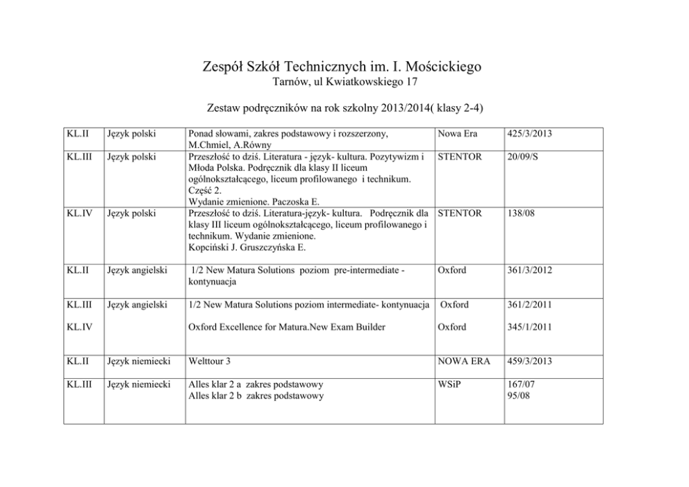 Zespół Szkół Technicznych im. I. Mościckiego Tarnów, ul Kwiatkowskiego 17 Zestaw podręczników na rok szkolny 2013/2014( klasy 2-4) KL.II Język polski Ponad słowami, zakres podstawowy i rozszerzony, Nowa Era M.Chmiel, A.Równy Przeszłość to dziś. Literatura - język- kultura. Pozytywizm i STENTOR Młoda Polska. Podręcznik dla klasy II liceum ogólnokształcącego, liceum profilowanego i technikum. Część 2. Wydanie zmienione. Paczoska E. Przeszłość to dziś. Literatura-język- kultura. Podręcznik dla STENTOR klasy III liceum ogólnokształcącego, liceum profilowanego i technikum. Wydanie zmienione. Kopciński J. Gruszczyńska E. 425/3/2013 KL.III Język polski KL.IV Język polski KL.II Język angielski 1/2 New Matura Solutions poziom pre-intermediate kontynuacja Oxford 361/3/2012 KL.III Język angielski 1/2 New Matura Solutions poziom intermediate- kontynuacja Oxford 361/2/2011 Oxford Excellence for Matura.New Exam Builder Oxford 345/1/2011 KL.IV 20/09/S 138/08 KL.II Język niemiecki Welttour 3 NOWA ERA 459/3/2013 KL.III Język niemiecki Alles klar 2 a zakres podstawowy Alles klar 2 b zakres podstawowy WSiP 167/07 95/08 To jest chemia 1. Zakres rozszerzony.Chemia ogólna i nieorganiczna. M Litwin, J.Szymańska, Sz.Styka- Wlazło NOWA ERA 3A/FOT Chemia Chemia fizyczna dla techników chemicznych Karpiński WSiP KL.IIIKL.IV Biologia Biologia 1. Zakres podstawowy. W.Lewiński i inni. Biologia 2. Zakres podstawowy J. Balerstet i inni OPERON OPERON KL.III F/A Historia 12/04 KL.III Historia Historia. Od kongresu wiedeńskiego do I wojny światowej. NOWA ERA Kształcenie w zakresie podstawowym i rozszerzonym. Część 2. Śniegocki R. Historia. Burzliwy wiek XX. Kształcenie w zakresie NOWA ERA podstawowym i rozszerzonym Śniegocki R. KL.II Matematyka Matematyka 2. Zakres podstawowy i rozszerzony dla szkół ponadgimnazjalnych W.Babiński, L.Chańko, D.Ponczek NOWA ERA 360/02/2013 KL.III Matematyka Matematyka. Podręcznik dla liceów i techników. Klasa III. Zakres podstawowy. Kurczab E.. Kurczab M. Świda E. K. PAZDRO 101/10/S KL. II Fizyka NOWA ERA 632/1/2013 T Fizyka ZAMKOR 90/04 T Fizyka Zrozumieć fizykę 1 podręcznik dla szkół ponadgimnazjalnych zakres rozszerzony M.Braun, K.Byczuk, E.Wójtowicz Fizyka dla szkół ponadgimnazjalnych. Kurs podstawowy z elementami kursu rozszerzonego koniecznymi do podjęcia studiów technicznych i przyrodniczych. Część 1. Salach J. Fizyka dla szkół ponadgimnazjalnych. Kurs podstawowy z elementami kursu rozszerzonego koniecznymi do podjęcia studiów technicznych i przyrodniczych. Część 2. Salach J. ZAMKOR 238/04 2 A/M Chemia 581/1/2012 171/02 242/03 179/04 T Geografia KL.II Podstawy przedsiębiorczości T Podstawy przęsiębiorczosci KL. II KL. IV KL. IV Geografia na czasie 2 Geografia fizyczna świata i Polski. Zakres podstawowy. B.Lenartowicz, E.Wilczyńska, M.Wójcik Podstawy przedsiębiorczości J.Korba, Z.Smutek PWN 7/08 OPERON Podstawy przedsiębiorczości. Podręcznik dla liceum ogólnokształcącego, liceum profilowanego i technikum. Makieła Z. Rachwał T. Wiedza o kulturze Spotkania z kulturą NOWA ERA 212/02 NOWA ERA 449/2012 Wiedza o kulturze Wiedza o kulturze. Kultura i przyszłość.. Zakres podstawowy i rozszerzony. S. Krzemień-Ojak, A. Kisielewska, A. Kisielewski i in. Wiedza o Wiedza o społeczeństwie. Zakres podstawowy. społeczeństwie Smutek Z. Maleska J. Surmacz B. OPERON 38/05 OPERON 1395/04