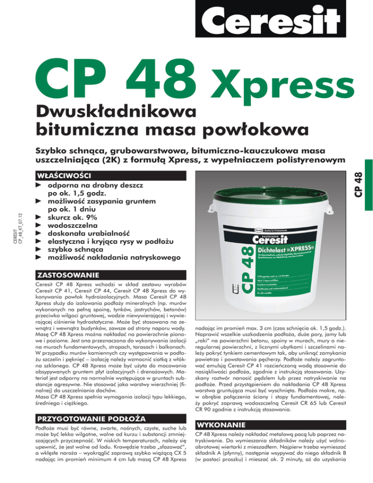 CP 48 Xpress Dwuskładnikowa bitumiczna masa powłokowa CERESIT CP_48_KT_07.12 Szybko schnąca, grubowarstwowa, bitumiczno-kauczukowa masa uszczelniająca (2K) z formułą Xpress, z wypełniaczem polistyrenowym CP 48 WŁAŚCIWOŚCI odporna na drobny deszcz po ok. 1,5 godz. możliwość zasypania gruntem po ok. 1 dniu skurcz ok. 9% wodoszczelna doskonała urabialność elastyczna i kryjąca rysy w podłożu szybko schnąca możliwość nakładania natryskowego ZASTOSOWANIE Ceresit CP 48 Xpress wchodzi w skład zestawu wyrobów Ceresit CP 41, Ceresit CP 44, Ceresit CP 48 Xpress do wykonywania powłok hydroizolacyjnych. Masa Ceresit CP 48 Xpress służy do izolowania podłoży mineralnych (np. murów wykonanych na pełną spoinę, tynków, jastrychów, betonów) przeciwko wilgoci gruntowej, wodzie niewywierającej i wywierającej ciśnienie hydrostatyczne. Może być stosowana na zewnątrz i wewnątrz budynków, zawsze od strony naporu wody. Masę CP 48 Xpress można nakładać na powierzchnie pionowe i poziome. Jest ona przeznaczona do wykonywania izolacji na murach fundamentowych, stropach, tarasach i balkonach. W przypadku murów kamiennych czy występowania w podłożu szczelin i pęknięć – izolację należy wzmocnić siatką z włókna szklanego. CP 48 Xpress może być użyta do mocowania obsypywanych gruntem płyt izolacyjnych i drenażowych. Materiał jest odporny na normalnie występujące w gruntach substancje agresywne. Nie stosować jako warstwy wierzchniej (finalnej) do uszczelniania dachów. Masa CP 48 Xpress spełnia wymagania izolacji typu lekkiego, średniego i ciężkiego. PRZYGOTOWANIE PODŁOŻA Podłoże musi być równe, zwarte, nośnych, czyste, suche lub może być lekko wilgotne, wolne od kurzu i substancji zmniejszających przyczepność. W niskich temperaturach, należy się upewnić, że jest wolne od lodu. Krawędzie trzeba „sfazować”, a wklęsłe naroża – wyokrąglić zaprawą szybko wiążącą CX 5 nadając im promień minimum 4 cm lub masą CP 48 Xpress nadając im promień max. 3 cm (czas schnięcia ok. 1,5 godz.). Naprawić wszelkie uszkodzenia podłoża, duże pory, jamy lub „raki” na powierzchni betonu, spoiny w murach, mury o nieregularnej powierzchni, z licznymi ubytkami i szczelinami należy pokryć tynkiem cementowym tak, aby uniknąć zamykania powietrza i powstawania pęcherzy. Podłoże należy zagruntować emulsją Ceresit CP 41 rozcieńczoną wodą stosownie do nasiąkliwości podłoża, zgodnie z instrukcją stosowania. Uzyskany roztwór nanosić pędzlem lub przez natryskiwanie na podłoże. Przed przystąpieniem do nakładania CP 48 Xpress warstwa gruntująca musi być wyschnięta. Podłoża mokre, np. w obrębie połączenia ściany i stopy fundamentowej, należy pokryć zaprawą wodoszczelną Ceresit CR 65 lub Ceresit CR 90 zgodnie z instrukcją stosowania. WYKONANIE CP 48 Xpress należy nakładać metalową pacą lub poprzez natryskiwanie. Do wymieszania składników należy użyć wolnoobrotowej wiertarki z mieszadłem. Najpierw trzeba wymieszać składnik A (płynny), następnie wsypywać do niego składnik B (w postaci proszku) i mieszać ok. 2 minuty, aż do uzyskania UWAGA Prace należy wykonywać w suchych warunkach, przy temperaturze powietrza i podłoża od +5°C do +25°C (jednak nie na silnie nasłonecznionych powierzchniach) oraz przy względnej wilgotności powietrza poniżej 80%. Wszelkie dane odnoszą się do temperatury +20°C i wilgotności względnej powietrza 60%. W innych warunkach należy uwzględnić szybsze lub wolniejsze przesychanie materiału. Aby ochronić zaizolowane powierzchnie przed uszkodzeniami, np. w czasie zasypywania wykopu i osiadania gruntu, trzeba zastosować odpowiednie płyty drenujące lub podobne osłony. Osłony te należy tak zamocować, aby nie nastąpiło ich obsunięcie podczas zagęszczania gruntu. Nie wolno dopuszczać do punktowego lub pasmowego obciążania zaizolowanych powierzchni. Nie wolno rozpoczynać zasypywania wykopu zanim warstwa izolacyjna nie będzie wystarczająco twarda. Do zasypywania wykopów nie stosować gruntów spoistych. Pomieszczenia, w których stosowano materiał, wietrzyć do zaniku zapachu przed oddaniem ich do użytku. W czasie pracy chronić oczy i naskórek używając odzieży, rękawic i okularów ochronnych. Zanieczyszczoną odzież niezwłocznie wymienić na czystą. Zabrudzony naskórek niezwłocznie umyć ciepłą wodą z mydłem (nie stosować rozpuszczalników). W przypadku kontaktu z oczami płukać je obficie wodą i zasięgnąć porady lekarza. Chronić przed dziećmi. ZALECENIA Niniejsza karta techniczna określa zakres stosowania materiału i sposób prowadzenia robót, ale nie może zastąpić zawodowego przygotowania wykonawcy. Oprócz podanych informacji prace należy wykonywać zgodnie ze sztuką budowlaną i zasadami BHP. Producent gwarantuje jakość wyrobu, natomiast nie ma wpływu na warunki i sposób jego użycia. W przypadku wątpliwości należy wykonać własne próby stosowania. Wraz z ukazaniem się tej karty technicznej tracą ważność karty wcześniejsze. Henkel Polska Sp. z o.o. ul. Domaniewska 41, 02-672 Warszawa Centralny Dział Obsługi Klienta: Tel. (+48) 41 371 01 00 Fax (+48) 41 374 22 22 www.ceresit.pl • infolinia: 800 120 241 SKŁADOWANIE Do 9 miesięcy od daty produkcji przy składowaniu w suchych, chłodnych warunkach i w oryginalnych, nieuszkodzonych opakowaniach. Chronić przed mrozem! OPAKOWANIA Opakowania 28 l zawierające obydwa składniki: Pojemniki plastikowe (składnik A – płynny) Worki papierowe (składnik B w postaci proszku) DANE TECHNICZNE Baza: bitumy z dodatkiem kauczuku i pianki polistyrenowej Gęstość: 0,65 kg/dm3 Temperatura stosowania: od +5°C do +25°C Proporcje mieszania: 22,4 l składnika A na 5,6 kg składnika B Czas zużycia: ok. 45 min Odporność na deszcz: po ok. 1,5 godz. Możliwość obciążania (zasypania gruntem): po ok. 1 dniu Temperatura mięknienia: > 150°C Nasiąk