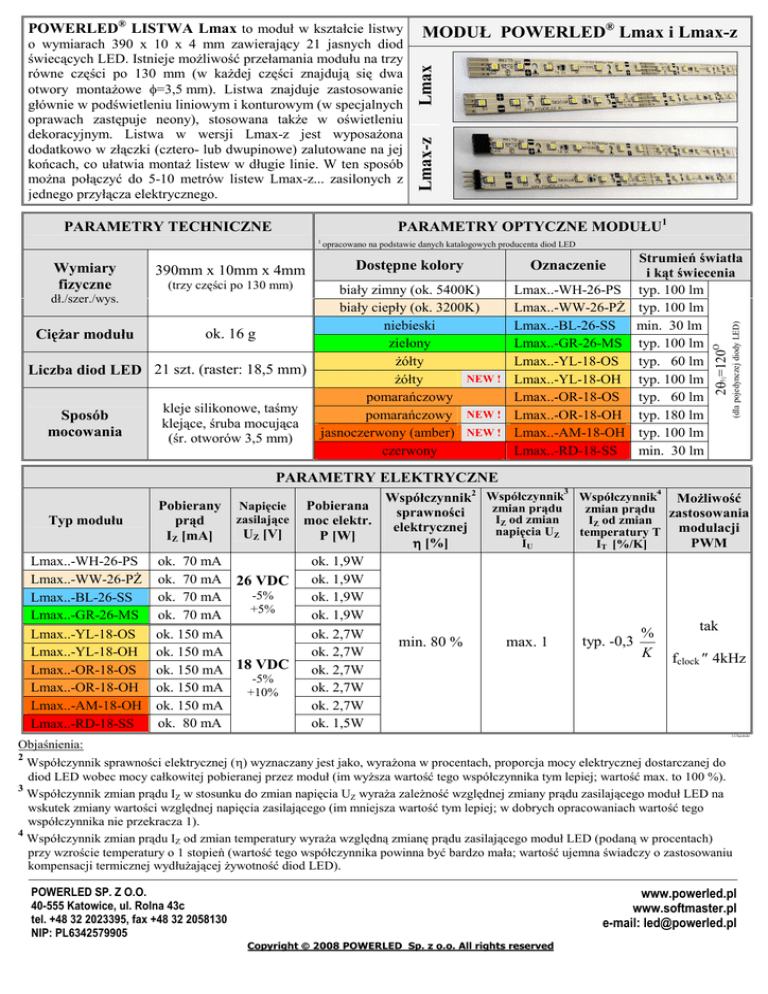 Lmax o wymiarach 390 x 10 x 4 mm zawierający 21 jasnych diod świecących LED. Istnieje moŜliwość przełamania modułu na trzy równe części po 130 mm (w kaŜdej części znajdują się dwa otwory montaŜowe φ=3,5 mm). Listwa znajduje zastosowanie głównie w podświetleniu liniowym i konturowym (w specjalnych oprawach zastępuje neony), stosowana takŜe w oświetleniu dekoracyjnym. Listwa w wersji Lmax-z jest wyposaŜona dodatkowo w złączki (cztero- lub dwupinowe) zalutowane na jej końcach, co ułatwia montaŜ listew w długie linie. W ten sposób moŜna połączyć do 5-10 metrów listew Lmax-z... zasilonych z jednego przyłącza elektrycznego. MODUŁ POWERLED® Lmax i Lmax-z Lmax-z POWERLED® LISTWA Lmax to moduł w kształcie listwy PARAMETRY OPTYCZNE MODUŁU1 PARAMETRY TECHNICZNE 1 opracowano na podstawie danych katalogowych producenta diod LED Strumień światła i kąt świecenia (trzy części po 130 mm) biały zimny (ok. 5400K) Lmax..-WH-26-PS typ. 100 lm dł./szer./wys. biały ciepły (ok. 3200K) Lmax..-WW-26-Pś typ. 100 lm niebieski Lmax..-BL-26-SS min. 30 lm ok. 16 g CięŜar modułu zielony Lmax..-GR-26-MS typ. 100 lm Ŝółty Lmax..-YL-18-OS typ. 60 lm Liczba diod LED 21 szt. (raster: 18,5 mm) NEW ! Lmax..-YL-18-OH Ŝółty typ. 100 lm pomarańczowy Lmax..-OR-18-OS typ. 60 lm kleje silikonowe, taśmy NEW ! pomarańczowy Lmax..-OR-18-OH typ. 180 lm Sposób klejące, śruba mocująca mocowania jasnoczerwony (amber) NEW ! Lmax..-AM-18-OH typ. 100 lm (śr. otworów 3,5 mm) czerwony Lmax..-RD-18-SS min. 30 lm Dostępne kolory Oznaczenie (dla pojedynczej diody LED) 390mm x 10mm x 4mm 2θ½=120O Wymiary fizyczne PARAMETRY ELEKTRYCZNE Typ modułu Lmax..-WH-26-PS Lmax..-WW-26-Pś Lmax..-BL-26-SS Lmax..-GR-26-MS Lmax..-YL-18-OS Lmax..-YL-18-OH Lmax..-OR-18-OS Lmax..-OR-18-OH Lmax..-AM-18-OH Lmax..-RD-18-SS Pobierany prąd IZ [mA] Napięcie zasilające UZ [V] ok. 70 mA ok. 70 mA 26 VDC -5% ok. 70 mA +5% ok. 70 mA ok. 150 mA ok. 150 mA ok. 150 mA 18 VDC -5% ok. 150 mA +10% ok. 150 mA ok. 80 mA 3 4 Współczynnik2 Współczynnik Współczynnik MoŜliwość Pobierana zmian prądu zmian prądu zastosowania sprawności IZ od zmian IZ od zmian moc elektr. elektrycznej napięcia UZ temperatury T modulacji P [W] PWM IU η [%] IT [%/K] ok. 1,9W ok. 1,9W ok. 1,9W ok. 1,9W tak % ok. 2,7W typ. -0,3 min. 80 % max. 1 ok. 2,7W K f clock ≤ 4kHz ok. 2,7W ok. 2,7W ok. 2,7W ok. 1,5W J.Chęciński Objaśnienia: 2 Współczynnik sprawności elektrycznej (η) wyznaczany jest jako, wyraŜona w procentach, proporcja mocy elektrycznej dostarczanej do diod LED wobec mocy całkowitej pobieranej przez moduł (im wyŜsza wartość tego współczynnika tym lepiej; wartość max. to 100 %). 3 Współczynnik zmian prądu IZ w stosunku do zmian napięcia UZ wyraŜa zaleŜność względnej zmiany prądu zasilającego moduł LED na wskutek zmiany wartości względnej napięcia zasilającego (im mniejsza wartość tym lepiej; w dobrych opracowaniach wartość tego współczynnika nie przekracza 1). 4 Współczynnik zmian prądu IZ od zmian temperatury wyraŜa względną zmianę prądu zasilającego moduł LED (podaną w procentach) przy wzroście temperatury o 1 stopień (wartość tego współczynnika powinna być bardzo mała; wartość ujemna świadczy o zastosowaniu kompensacji termicznej wydłuŜającej Ŝywotność diod LED). POWERLED SP. Z O.O. 40-555 Katowice, ul. Rolna 43c tel. +48 32 2023395, fax +48 32 2058130 NIP: PL6342579905 www.powerled.pl www.softmaster.pl e-mail: [email protected] Copyright 2008 POWERLED Sp. z o.o. All rights reserved