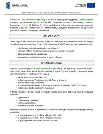 Projekt współfinansowany ze środków Unii Europejskiej w ramach Europejskiego Funduszu Społecznego W marcu 2013 roku Powiatowy Urząd Pracy w Jaworznie rozpoczął realizację projektu „Młodzi, Aktywni, Kreatywni, współfinansowanego ze środków Unii Europejskiej w ramach Europejskiego Funduszu Społecznego - Priorytet VI, Działanie 6.1 „Poprawa dostępu do zatrudnienia oraz wspieranie aktywności zawodowej w regionie” - Poddziałanie 6.1.1 „Wsparcie osób pozostających bez zatrudnienia na regionalnym rynku pracy” Programu Operacyjnego Kapitał Ludzki. CEL PROJEKTU Celem projektu jest podniesienie poziomu aktywności zawodowej oraz zwiększenie szans na podjęcie zatrudnienia przez osoby młode do 27 roku życia, zarejestrowane w PUP Jaworzno, w szczególności poprzez: ►określenie przydatności zawodowej do pracy i zawodu; ►nabycie kwalifikacji zawodowych dostosowanych do wymogów rynku pracy; ►zdobycie doświadczenia zawodowego; ►wyposażenie w umiejętności poruszania się po rynku pracy. GRUPA DOCELOWA Projektem zostanie objętych 101 osób bezrobotnych (62 kobiety i 39 mężczyzn). Uczestnikiem projektu może zostać osoba, która spełnia łącznie następujące kryteria formalne (zgodnie z przepisami ustawy o promocji zatrudnienia i instytucjach rynku pracy) tj. ►zamieszkuje obszar miasta Jaworzna, ►jest zarejestrowana w Powiatowym Urzędzie Pracy w Jaworznie, ►posiada status osoby bezrobotnej, ►w chwili podpisania deklaracji uczestnictwa w projekcie nie ukończyła 25 lub 27 roku życia, ►kwalifikuje się do objęcia szkolenie i/lub stażem. W trakcie rekrutacji do projektu oprócz powyższych kryteriów, będą brane pod uwagę również następujące przesłanki: ►wykształcenie, ►doświadczenie zawodowe, ►kwalifikacje zawodowe, ►motywacja do udziału w projekcie. Rekrutacja do projektu zostanie przeprowadzona w sposób zapewniający osiągnięcie następującej struktury uczestników: ►w przedziale wiekowym 18 – 24 lat – 79 osób (49K i 30M), ►w przedziale wiekowym 25 - 26 lat – 22 osoby (13K i 9M), ►w tym: długotrwale bezrobotne – 16 osób (10K i 6M). FORMY WSPARCIA W ramach projektu „Młodzi, Aktywni, Kreatywni” wszyscy uczestnicy/uczestniczki projektu zostaną objęci indywidualnym i kompleksowym wsparciem obejmującym: ►INDYWIDUALNY PLAN DZIAŁANIA (DORADZTWO ZAWODOWE)◄ Poradnictwem zawodowym w trakcie realizacji projektu objętych zostanie 101 osób. Wykwalifikowani doradcy zawodowi dla każdego z uczestników/uczestniczek opracują Indywidualny Plan Działania uwzględniający 3h wsparcia indywidualnego oraz 2h wsparcia grupowego w zakresie równości płci na rynku pracy. Założenie IPD ma na celu rozpoznanie predyspozycji uczestników/uczestniczek projektu oraz ma pomóc w określeniu przyszłej ścieżki rozwoju zawodowego. W ramach IPD zostaną wyłonione dwie grupy osób: ►grupa 20 osób, które po uprzednim przeszkoleniu zawodowym odbędą 6-miesięczny staż ►grupa 81 osób, które zostaną skierowane na 8-miesięczny staż zawodowy ►SZKOLENIA ZAWODOWE ◄ Szkolenia zawodowe (20 osób) będą poprzedzać staż u pracodawcy oraz umożliwią uczestnikom/uczestniczkom nabycie nowych lub uzupełnienie dotychczasowych kwalifikacji zawodowych dostosowanych do wymogów rynku pracy. Wybór konkretnego szkolenia nastąpi w trakcie opracowywania Indywidualnego Planu Działania. Przewidziano realizację następujących szkoleń: ►Magazynier z obsługą wózka jezdniowego i egzaminem UDT ►Pracownik biurowy z elementami kadr i płac ►Sprzedawca ►Obsługa programów komputerowych z tworzeniem stron www oraz elementami grafiki komputerowej Dodatkowo w ramach szkolenia zawodowego uczestnikom/uczestniczkom projektu zostaną zapewnione materiały dydaktyczne, stypendium szkoleniowe, pokrycie kosztów badań lekarskich, zwrot kosztów dojazdu oraz refundacja kosztów opieki nad dzieckiem. ►STAŻ ZAWODOWY◄ Staż zawodowy (101 osób) na stanowisku u pracodawcy pozwoli uczestnikom/uczestniczkom projektu zdobyć udokumentowane doświadczenie zawodowe niezbędne do podjęcia zatrudnienia. Staże zawodowe zostaną zorganizowane przez okres 6 miesięcy dla 20 osób (odbywające wcześniej szkolenie) oraz przez okres 8 miesięcy dla 81 pozostałych osób. Kryterium wyboru 81 osób będzie posiadanie kwalifikacji zawodowych, które zostaną dopasowane do wymagań pracodawców ubiegających się o zorganizowanie stażu w swojej firmie. Z tytułu odbywania stażu uczestnikom/uczestniczkom projektu przysługuje stypendium stażowe, pokrycie kosztów badań lekarskich, zwrot kosztów dojazdu oraz refundacja kosztów opieki nad dzieckiem. ►WARSZTATY / ZAJĘCIA AKTYWIZACYJNE◄ Dla wszystkich uczestników/uczestniczek, którzy w okresie od 1 m-ca od zakończenia stażu nie podejmą zatrudnienia będą realizowane na terenie Powiatowego Urzędu Pracy w Jaworznie 2-dniowe warsztaty/zajęcia z zakresu technik aktywnego poszukiwania pracy, podczas których uczestnicy/uczestniczki projektu poznają nowoczesne techniki aktywnego poszukiwania pracy oraz nauczą się tworzyć dokumenty aplikacyjne. ►POŚREDNICTWO PRACY◄ Skierowane będzie do osób, które po zakończeniu stażu nie podejmą zatrudnienia. W ramach indywidualnego pośrednictwa pracy każdy uczestnik/uczestniczka projektu otrzyma wsparcie pośrednika pracy - indywidualnego opiekuna oferującego pomoc w procesie aktywnego poszukiwania pracy w celu podjęcia zatrudnienia. FINANSOWANIE PROJEKTU Projekt „Młodzi, Aktywni, Kreatywni” jest współfinansowany ze środków Unii Europejskiej w ramach Europejskiego Funduszu Społecznego. PRZEBIEG REALIZACJI PROJEKTU grudzień2014r. Informujemy, że w grudniu br. uczestnicy projektu kontynuują udział w stażu zawodowym. Natomiast osoby, które po stażu nie podjęły zatrudnienia zostały objęte pośrednictwem pracy i warsztatami z technik aktywnego poszukiwania pracy. październik - listopad 2014r. Tu