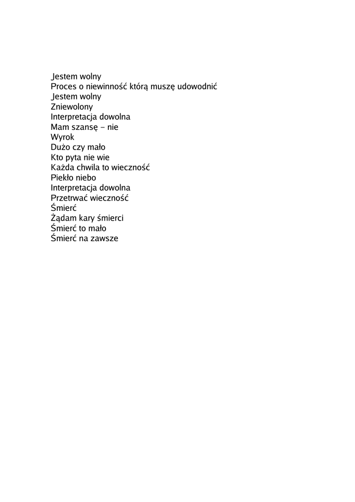 Jestem wolny Proces o niewinność którą muszę udowodnić Jestem wolny Zniewolony Interpretacja dowolna Mam szansę – nie Wyrok Dużo czy mało Kto pyta nie wie Każda chwila to wieczność Piekło niebo Interpretacja dowolna Przetrwać wieczność Śmierć Żądam kary śmierci Śmierć to mało Śmierć na zawsze