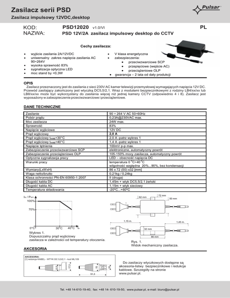 Pulsar Zasilacz serii PSD Zasilacz impulsowy 12VDC,desktop PSD12020 KOD: NAZWA: PL v1.0/VI PSD 12V/2A zasilacz impulsowy desktop do CCTV Cechy zasilacza: · · · · · wyjście zasilania 2A/12VDC uniwersalny zakres napięcia zasilania AC 90÷264V wysoka sprawność 83% sygnalizacja optyczna LED moc stand by <0,3W · · V klasa energetyczna zabezpieczenia: · przeciwzwarciowe SCP · przepięciowe (wejście AC) · przeciążeniowe OLP · gwarancja – 2 lata od daty produkcji OPIS Zasilacz przeznaczony jest do zasilania z sieci 230V AC kamer telewizji przemysłowej wymagających napięcia 12V DC. Przewód zasilający zakończony jest wtyczką DC5,5/2,1. Wraz z modułami bezpiecznikowymi z rodziny LB4/xx/xx lub LB8/xx/xx może być wykorzystany do zasilania więcej niż jednej kamery CCTV (odpowiednio 4 i 8). Zasilacz jest wyposażony w zabezpieczenie przeciwzwarciowe i przeciążeniowe. DANE TECHNICZNE Zasilanie Pobór prądu Moc zasilacza Sprawność Napięcie wyjściowe Prąd wyjściowy Prąd wyjściowy tAMB<30°C Prąd wyjściowy tAMB=40°C Napięcie tętnienia Zabezpieczenie przeciwzwarciowe SCP Zabezpieczenie przeciążeniowe OLP Optyczna sygnalizacja pracy Warunki pracy 90 ÷ 264 V AC 50÷60Hz 0,23A@230VAC max. 24W max. 83% 12V DC 2,0 A 2,0 A -patrz wykres 1 1,4 A -patrz wykres 1 100mV p-p max. elektroniczne, automatyczny powrót 105-150% mocy zasilacza, automatyczny powrót LED – obecność napięcia DC o o temperatura 0 C÷40 C wilgotność względna 20%...90%, bez kondensacji 86 x 72 (50) x32 [mm] 0,21kg / 0,24kg II (druga) 1,45m + wtyk DC5,5/2,1 żeński 1,15m + wtyk sieciowy -20ºC...+60ºC Wymiary(LxWxH) Waga netto/brutto Klasa ochronności PN-EN 60950-1:2007 Długość kabla DC Długość kabla AC Temperatura składowania IN / PWY 100% 70% 0°C 30°C 40°C ta Wykres 1. Dopuszczalny prąd wyjściowy zasilacza w zależności od temperatury otoczenia. Rys. 1. Widok mechaniczny zasilacza. AKCESORIA AKCESORIA : [1] redukcja KABEL - WTYK DC 5,5/2,1 - kod ML109 Do zasilaczy wtyczkowych dostępne są akcesoria-listwy bezpiecznikowe i redukcje kablowe. Szczegóły na stronie www.pulsar.pl. wyjście TAMPER : przewody 30cm Tel. +48 14-610-19-40, fax: +48 14- 610-19-50, www.pulsar.pl, e-mail: [email protected] ®