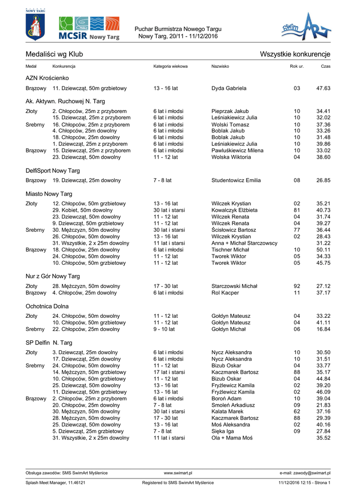 Puchar Burmistrza Nowego Targu Nowy Targ, 20/11 - 11/12/2016 Medaliści wg Klub Medal Konkurencja Wszystkie konkurencje Kategoria wiekowa Nazwisko Rok ur. Czas 13 - 16 lat Dyda Gabriela 03 47.63 6 lat i młodsi 6 lat i młodsi 6 lat i młodsi 6 lat i młodsi 6 lat i młodsi 6 lat i młodsi 6 lat i młodsi 11 - 12 lat Pieprzak Jakub Leśniakiewicz Julia Wolski Tomasz Boblak Jakub Boblak Jakub Leśniakiewicz Julia Pawluśkiewicz Milena Wolska Wiktoria 10 10 10 10 10 10 10 04 34.41 32.02 37.36 33.26 31.48 39.86 33.02 38.60 7 - 8 lat Studentowicz Emilia 08 26.85 13 - 16 lat 30 lat i starsi 11 - 12 lat 11 - 12 lat 30 lat i starsi 13 - 16 lat 11 lat i starsi 6 lat i młodsi 11 - 12 lat 11 - 12 lat Wilczek Krystian Kowalczyk Elżbieta Wilczek Renata Wilczek Renata Ścisłowicz Bartosz Wilczek Krystian Anna + Michał Starczowscy Tischner Michał Tworek Wiktor Tworek Wiktor 02 81 04 04 77 02 10 05 05 35.21 40.73 31.74 39.27 36.44 28.43 31.22 50.11 34.33 45.75 17 - 30 lat 6 lat i młodsi Starczowski Michał Rol Kacper 92 11 27.12 37.17 11 - 12 lat 11 - 12 lat 9 - 10 lat Gołdyn Mateusz Gołdyn Mateusz Gołdyn Michał 04 04 06 33.22 41.11 16.84 6 lat i młodsi 6 lat i młodsi 11 - 12 lat 17 lat i starsi 11 - 12 lat 13 - 16 lat 13 - 16 lat 6 lat i młodsi 7 - 8 lat 30 lat i starsi 17 - 30 lat 13 - 16 lat 7 - 8 lat 11 lat i starsi Nycz Aleksandra Nycz Aleksandra Bizub Oskar Kaczmarek Bartosz Bizub Oskar Fryżlewicz Kamila Fryżlewicz Kamila Boroń Adam Smoleń Arkadiusz Kalata Marek Kaczmarek Bartosz Moś Aleksandra Sięka Iga Ola + Mama Moś 10 10 04 88 04 02 02 10 09 62 88 02 09 30.50 31.51 33.77 35.17 44.84 39.20 46.09 39.04 21.83 37.16 29.39 40.16 27.84 35.52 AZN Krościenko Brązowy 11. Dziewcząt, 50m grzbietowy Ak. Aktywn. Ruchowej N. Targ Złoty Srebrny Brązowy 2. Chłopców, 25m z przyborem 15. Dziewcząt, 25m z przyborem 16. Chłopców, 25m z przyborem 4. Chłopców, 25m dowolny 18. Chłopców, 25m dowolny 1. Dziewcząt, 25m z przyborem 15. Dziewcząt, 25m z przyborem 23. Dziewcząt, 50m dowolny DelfiSport Nowy Targ Brązowy 19. Dziewcząt, 25m dowolny Miasto Nowy Targ Złoty Srebrny Brązowy 12. Chłopców, 50m grzbietowy 29. Kobiet, 50m dowolny 23. Dziewcząt, 50m dowolny 9. Dziewcząt, 50m grzbietowy 30. Mężczyzn, 50m dowolny 26. Chłopców, 50m dowolny 31. Wszystkie, 2 x 25m dowolny 18. Chłopców, 25m dowolny 24. Chłopców, 50m dowolny 10. Chłopców, 50m grzbietowy Nur z Gór Nowy Targ Złoty Brązowy 28. Mężczyzn, 50m dowolny 4. Chłopców, 25m dowolny Ochotnica Dolna Złoty Srebrny 24. Chłopców, 50m dowolny 10. Chłopców, 50m grzbietowy 22. Chłopców, 25m dowolny SP Delfin N. Targ Złoty Srebrny Brązowy 3. Dziewcząt, 25m dowolny 17. Dziewcząt, 25m dowolny 24. Chłopców, 50m dowolny 14. Mężczyzn, 50m grzbietowy 10. Chłopców, 50m grzbietowy 25. Dziewcząt, 50m dowolny 11. Dziewcząt, 50m grzbietowy 2. Chłopców, 25m z przyborem 20. Chłopców, 25m dowolny 30. Mężczyzn, 50m dowolny 28. Mężczyzn, 50m dowolny 25. Dziewcząt, 50m dowolny 5. Dziewcząt, 25m grzbietowy 31. Wszystkie, 2 x 25m dowolny Obsługa zawodów: SMS SwimArt Myślenice Splash Meet Manager, 11.46121 www.swimart.pl e-mail: [email protected] Registered to SMS SwimArt Myślenice 11/12/2016 12:15 - Strona 1 Puchar Burmistrza Nowego Targu Nowy Targ, 20/11 - 11/12/2016 Stadnina Koni Łopuszna Złoty 30. Mężczyzn, 50m dowolny 14. Mężczyzn, 50m grzbietowy 30 lat i starsi 17 lat i starsi Darowski Piotr Darowski Piotr 71 71 28.53 33.86 7 - 8 lat 13 - 16 lat 7 - 8 lat 13 - 16 lat Tokarska Justyna Chrobak Anna Tokarska Justyna Chrobak Anna 08 02 08 02 24.01 37.31 26.56 45.95 6 lat i młodsi 9 - 10 lat 7 - 8 lat 6 lat i młodsi 6 lat i młodsi 13 - 16 lat 9 - 10 lat 7 - 8 lat 6 lat i młodsi 9 - 10 lat 9 - 10 lat 11 lat i starsi 10 lat i młodsi 6 lat i młodsi 7 - 8 lat 17 - 30 lat 9 - 10 lat 7 - 8 lat 13 - 16 lat 6 lat i młodsi 9 - 10 lat 7 - 8 lat 6 lat i młodsi 6 lat i młodsi 11 - 12 lat 9 - 10 lat 7 - 8 lat 11 - 12 lat 10 lat i młodsi 6 lat i młodsi 9 - 10 lat 13 - 16 lat 9 - 10 lat 7 - 8 lat 17 lat i starsi 13 - 16 lat 6 lat i młodsi 9 - 10 lat 6 lat i młodsi 6 lat i młodsi 9 - 10 lat 11 - 12 lat 10 lat i młodsi Studentowicz Dawid 10 Watycha Aleksander 07 Mastalski Kacper 08 Tokarski Szymon 10 Tokarski Szymon 10 Kalata Michał 02 Pastwa Amadeusz 06 Mastalski Kacper 08 Wiertelak Lena 10 Liszka Amelia 06 Liszka Amelia 06 Michał + tata Marek Kalata Amadeusz + tata Grzegorz Pastwa Studentowicz Dawid 10 Gniadek Piotr 08 Stefaniak Piotr 98 Watycha Aleksander 07 Gniadek Piotr 08 Kalata Michał 02 Wiertelak Lena 10 Wołczek Malwina 07 Garbacz Martyna 09 Węgrzyn Aleksandra 10 Gąsior Iga 10 Wołczek Krystyna 04 Węgrzyn Hanna 07 Garbacz Martyna 09 Wołczek Krystyna 04 Kacper + tata Paweł Mastalscy Leśnicki Franciszek 10 Pastwa Amadeusz 06 Gal Grzegorz 03 Karpiel Mateusz 07 Guziak Filip 08 Stefaniak Piotr 98 Plewa Dominik 00 Węgrzyniak Klara 10 Zagata Magdalena 06 Gąsior Iga 10 Węgrzyn Aleksandra 10 Wołczek Malwina 07 Mroczka Zuzanna 05 Michał + mama Elżbieta Kowalczyk 35.28 16.61 17.59 30.57 27.93 28.04 20.76 21.07 36.75 17.45 21.10 29.83 32.67 37.09 18.71 28.95 20.98 23.19 35.30 32.25 17.61 24.41 31.18 32.78 35.22 22.23 27.27 41.43 33.27 39.74 16.85 30.08 21.06 25.99 36.07 37.34 45.96 18.77 33.62 34.13 22.39 46.04 39.84 Swim Active Nowy Targ Złoty 19. Dziewcząt, 25m dowolny 25. Dziewcząt, 50m dowolny 5. Dziewcząt, 25m grzbietowy 11. Dziewcząt, 50m grzbietowy UKS Delfin Nowy Targ Złoty Srebrny Brązowy 16. Chłopców, 25m z przyborem 22. Chłopców, 25m dowolny 20. Chłopców, 25m dowolny 4. Chłopców, 25m dowolny 18. Chłopców, 25m dowolny 26. Chłopców, 50m dowolny 8. Chłopców, 25m grzbietowy 6. Chłopców, 25m grzbietowy 1. Dziewcząt, 25m z przyborem 21. Dziewcząt, 25m dowolny 7. Dziewcząt, 25m grzbietowy 31. Wszystkie, 2 x 25m dowolny 31. Wszystkie, 2 x 25m dowolny 2. Chłopców, 25m z przyborem 20. Chłopców, 25m dowolny 28. Mężczyzn, 50m dowolny 8. Chłopców, 25m grz
