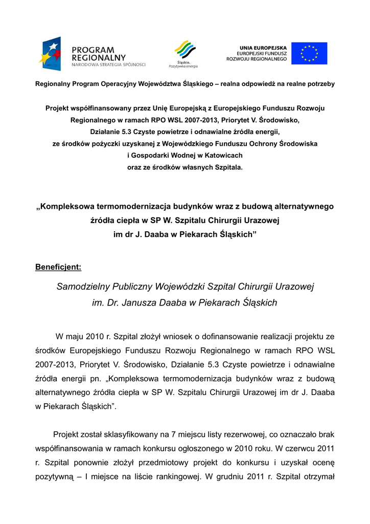 Regionalny Program Operacyjny Województwa Śląskiego – realna odpowiedź na realne potrzeby Projekt współfinansowany przez Unię Europejską z Europejskiego Funduszu Rozwoju Regionalnego w ramach RPO WSL 2007-2013, Priorytet V. Środowisko, Działanie 5.3 Czyste powietrze i odnawialne źródła energii, ze środków pożyczki uzyskanej z Wojewódzkiego Funduszu Ochrony Środowiska i Gospodarki Wodnej w Katowicach oraz ze środków własnych Szpitala. „Kompleksowa termomodernizacja budynków wraz z budową alternatywnego źródła ciepła w SP W. Szpitalu Chirurgii Urazowej im dr J. Daaba w Piekarach Śląskich” Beneficjent: Samodzielny Publiczny Wojewódzki Szpital Chirurgii Urazowej im. Dr. Janusza Daaba w Piekarach Śląskich W maju 2010 r. Szpital złożył wniosek o dofinansowanie realizacji projektu ze środków Europejskiego Funduszu Rozwoju Regionalnego w ramach RPO WSL 2007-2013, Priorytet V. Środowisko, Działanie 5.3 Czyste powietrze i odnawialne źródła energii pn. „Kompleksowa termomodernizacja budynków wraz z budową alternatywnego źródła ciepła w SP W. Szpitalu Chirurgii Urazowej im dr J. Daaba w Piekarach Śląskich”. Projekt został sklasyfikowany na 7 miejscu listy rezerwowej, co oznaczało brak współfinansowania w ramach konkursu ogłoszonego w 2010 roku. W czerwcu 2011 r. Szpital ponownie złożył przedmiotowy projekt do konkursu i uzyskał ocenę pozytywną – I miejsce na liście rankingowej. W grudniu 2011 r. Szpital otrzymał informację o wyborze projektu do dofinansowania. W ramach tego projektu realizowane będą prace termomodernizacyjne w latach 2012-2013 o całkowitej wartości projektu - 3.709.510,60 zł , w tym środki RPO WSL 2007-2013: 3.153.084,01 zł, udział własny: 556.426,08 zł. Starania Szpitala o uzyskanie dodatkowego dofinansowania w ramach wkładu własnego zaowocowały przyznaniem pożyczki preferencyjnej ze środków WFOŚ w Katowicach. Bezpośrednim celem realizacji projektu jest poprawa jakości powietrza na terenie województwa śląskiego, a w szczególności Piekar Śląskich i Gminy Kochanowice (powiat lubliniecki). Cel bezpośredni zostanie zrealizowany poprzez kompleksową termomodernizację budynków SP W. Szpitala Chirurgii Urazowej im. Dr. Janusza Daaba w Piekarach Ślaskich. W wyniku podjętych działań termomodernizacyjnych spełnione zostaną obowiązujące normy dotyczące ochrony cieplnej budynków oraz znacznie ograniczone zostanie zapotrzebowanie na energię – obniżone zostanie zużycie paliw: gazu i oleju opałowego. W projekcie wykorzystane będą odnawialne źródła energii – kolektory słoneczne oraz alternatywne źródła energii – pompa ciepła. W wyniku realizacji niniejszego przedsięwzięcia ograniczona zostanie ilość substancji szkodliwych wprowadzanych do powietrza. Niniejsza inwestycja jest komplementarna z projektami już zrealizowanymi, jak i przewidzianymi do realizacji w Samodzielnym Publicznym Wojewódzkim Szpitalu Chirurgii Urazowej im. dra Janusza Daaba w Piekarach Śląskich. Informacje źródłowe na temat Regionalnego Programu Operacyjnego Województwa Śląskiego na lata 2007-2013 znajdują się na stronie www.rpo.slaskie.pl