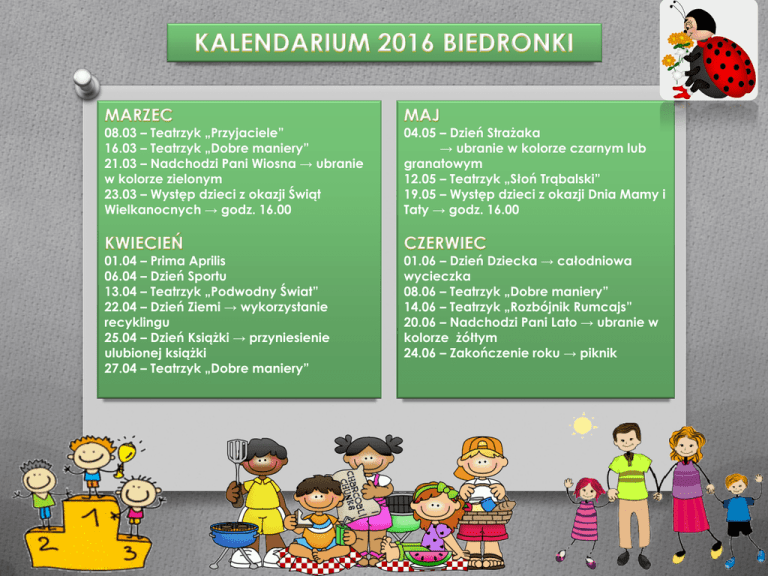 08.03 – Teatrzyk „Przyjaciele” 16.03 – Teatrzyk „Dobre maniery” 21.03 – Nadchodzi Pani Wiosna → ubranie w kolorze zielonym 23.03 – Występ dzieci z okazji Świąt Wielkanocnych → godz. 16.00 04.05 – Dzień Strażaka → ubranie w kolorze czarnym lub granatowym 12.05 – Teatrzyk „Słoń Trąbalski” 19.05 – Występ dzieci z okazji Dnia Mamy i Taty → godz. 16.00 01.04 – Prima Aprilis 06.04 – Dzień Sportu 13.04 – Teatrzyk „Podwodny Świat” 22.04 – Dzień Ziemi → wykorzystanie recyklingu 25.04 – Dzień Książki → przyniesienie ulubionej książki 27.04 – Teatrzyk „Dobre maniery” 01.06 – Dzień Dziecka → całodniowa wycieczka 08.06 – Teatrzyk „Dobre maniery” 14.06 – Teatrzyk „Rozbójnik Rumcajs” 20.06 – Nadchodzi Pani Lato → ubranie w kolorze żółtym 24.06 – Zakończenie roku → piknik