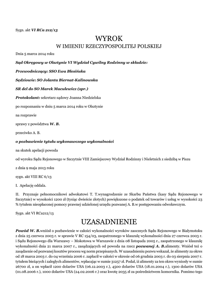 Sygn. akt VI RCa 212/13 WYROK W IMIENIU RZECZYPOSPOLITEJ POLSKIEJ Dnia 5 marca 2014 roku Sąd Okręgowy w Olsztynie VI Wydział Cywilny Rodzinny w składzie: Przewodniczący: SSO Ewa Błesińska Sędziowie: SO Jolanta Biernat-Kalinowska SR del do SO Marek Maculewicz (spr.) Protokolant: sekretarz sądowy Joanna Niedzielska po rozpoznaniu w dniu 5 marca 2014 roku w Olsztynie na rozprawie sprawy z powództwa W. B. przeciwko A. B. o pozbawienie tytułu wykonawczego wykonalności na skutek apelacji powoda od wyroku Sądu Rejonowego w Szczytnie VIII Zamiejscowy Wydział Rodzinny i Nieletnich z siedzibą w Piszu z dnia 9 maja 2013 roku sygn. akt VIII RC 6/13 I. Apelację oddala. II. Przyznaje pełnomocnikowi adwokatowi T. T.wynagrodzenie ze Skarbu Państwa (kasy Sądu Rejonowego w Szczytnie) w wysokości 1200 zł (tysiąc dwieście złotych) powiększone o podatek od towarów i usług w wysokości 23 % tytułem nieopłaconej pomocy prawnej udzielonej urzędu pozwanej A. B.w postępowaniu odwoławczym. Sygn. akt VI RCa212/13 UZASADNIENIE Powód W. B.wniósł o pozbawienie w całości wykonalności wyroków zaocznych Sądu Rejonowego w Białymstoku z dnia 25 czerwca 2003 r. w sprawie V RC 154/03, zaopatrzonego w klauzulę wykonalności dnia 27 czerwca 2003 r. i Sądu Rejonowego dla Warszawy – Mokotowa w Warszawie z dnia 08 listopada 2005 r., zaopatrzonego w klauzulę wykonalności dnia 21 marca 2007 r., zasądzających od powoda na rzecz pozwanej A. B.alimenty. Wniósł też o zasądzenie od pozwanej kosztów procesu wg norm przepisanych. W uzasadnieniu pozwu wskazał, że alimenty za okres od 18 marca 2003 r. do 04 września 2006 r. zapłacił w całości w okresie od 06 grudnia 2003 r. do 03 sierpnia 2007 r. tytułem bieżących i zaległych alimentów, wpłacając w sumie 31257 zł. Podał, iż alimenty za ten okres wyniosły w sumie 26700 zł, a on wpłacił 1200 dolarów USA (06.12.2003 r.), 4500 dolarów USA (18.01.2004 r.), 1300 dolarów USA (01.08.2006 r.), 1000 dolarów USA (24.02.2006 r.) oraz kwotę 2035 zł za pośrednictwem komornika. Pomimo tego pozwana egzekwuje należność w wysokości 17636 zł z odsetkami, zaś komornik dokonał zajęcia należącej do niego nieruchomości. Pozwana A. B.wniosła o oddalenie powództwa w całości oraz o zasądzenie od powoda na jej rzecz kosztów postępowania. Wskazała, iż należność główna z tytułu alimentów zasądzonych na jej rzecz, wynosiła 33139 zł, natomiast powód wpłacił 18347 zł, zaś dodatkowo należą jej się odsetki ustawowe, koszty komornika i biegłego, a zatem łączna wartość alimentów na dzień 01 stycznia 2012 r. wyniosła 55206 zł. Pozwana podała, że powód w swych wyliczeniach nie uwzględnił odsetek za nieterminowe wpłaty. A nadto, że wymagalność alimentów na jej rzecz i syna D.skończyła się 04 września 2006 r., gdyż po tej dacie powód był zobowiązany do płacenia alimentów na rzecz syna bezpośrednio jemu i dlatego przedstawione dowody wpłat z 2007, 2009 i 2010 r. dotyczą wpłat dokonanych bezpośrednio pełnoletniemu synowi. Jeśli chodzi o oświadczenie córki M., to podała, że otrzymała od niej kwoty po 500 USD dwukrotnie, po jej powrocie z USA, ale dotyczyły one lat 2001 oraz 2002 i za każdym razem kwitowała je podpisem. Z przekazu opiewającego na kwotę 4500 USD, 1200 USD zostało przekazane na czesne córki. Przekaz z 06 grudnia 2003 r. tylko w wysokości 550 USD zaliczono na alimenty, reszta, tj. kwota 650 USD była wpłatą dobrowolną na zakup biletu dla syna na wyjazd do USA. Z kwoty wpłaconej komornikowi 03 sierpnia 2007 r. otrzymała 4000 zł, reszta była przekazana przez komornika przekazem pocztowym dla syna D.. Sąd Rejonowy w Szczytnie VIII Zamiejscowy Wydział Rodzinny i Nieletnich z siedzibą w Piszu wyrokiem z dnia 09 maja 2013 r. w sprawie VIII RC 6/13 pozbawił wykonalności wyrok zaoczny Sądu Rejonowego w Białymstoku z dnia 25 czerwca 2003 r. wydany w sprawie V RC 154/03, w części zasądzającej od W. B.na rzecz A. B.tytułem alimentów od dnia 18 marca 2003 r. kwotę po 500 zł miesięcznie płatną z góry do 10-go każdego miesiąca z ustawowymi odsetkami w przypadku uchybienia w płatności rat alimentacyjnych. Pozbawił też wykonalności wyrok zaoczny Sądu Rejonowego dla Warszawy – Mokotowa w Warszawie wydany w sprawie V RC 78/05, podwyższający z dniem 09 lutego 2005 r. alimenty od W. B.na rzecz A. B.z kwoty po 500 zł do kwoty po 800 zł oraz na rzecz D. B.z kwoty po 500 zł do kwoty po 850 zł płatne z góry do 10-go każdego miesiąca z ustawowymi odsetkami w razie zwłoki w płatności rat, w części obejmującej obowiązek alimentacyjny na rzecz A. B.ponad kwotę 12.340,30 zł oraz ponad ustawowe odsetki od kwot: a. 5.833,64zł od dnia 04 sierpnia 2006 r. do dnia zapłaty, b. 5600,00 zł od dnia 02 sierpnia 2006 r. do dnia zapłaty, c. 800,00 zł od dnia 11 sierpnia 2006 r. do dnia zapłaty, d. 106,66 zł od dnia 04 września 2006 r. do dnia zapłaty. Sąd Rejonowy oddalił powództwo w pozostałym zakresie, koszty procesu między stronami wzajemnie zniósł, przyznał adw. T. T.od Skarbu Państwa kwotę wynagrodzenie tytułem nieopłaconych kosztów pomocy prawnej udzielonej pozwanej A. B.z urzędu. Sąd ten ustalił, że dnia 25 czerwca 2003 r. Sąd Rejonowy w Białymstoku w sprawie V RC 154/03 zasądził od W. B.na rzecz A. B.kwotę 500 zł tytułem alimentów płatnych miesięcznie od 18 marca 2003 r. do 10-go każdego miesiąca z odsetkami w wysokości 13 % w stosunku rocznym w przypadku uchybienia w płatności rat alimentacyjnych, a w razie zmiany oprocentowania w przyszłości z odsetkami w ustawowej wysokości. Wyrokiem zaocznym z dnia 08 listopada 2005 r. Sąd Rejonowy dla Warszawy – Mokotowa w Warszawie w sprawie V RC 78/05 podwyższył z dniem 09 lutego 2005 r. alimenty zasądzone wyrokiem Sądu Okręgowego w Białymstoku z 25 czerwca 2003 r. na rzecz D. B.do kwoty po 850 zł miesięcznie oraz na rzecz A. B., ostatnio