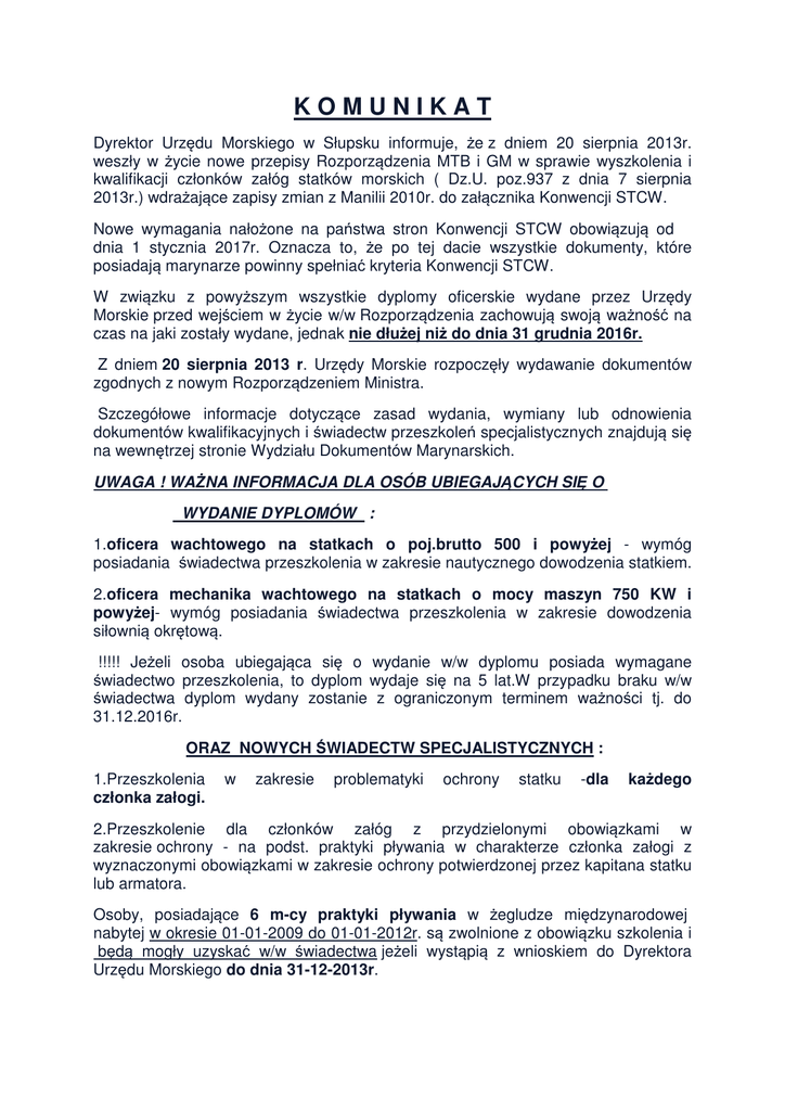 KOMUNIKAT Dyrektor Urzędu Morskiego w Słupsku informuje, że z dniem 20 sierpnia 2013r. weszły w życie nowe przepisy Rozporządzenia MTB i GM w sprawie wyszkolenia i kwalifikacji członków załóg statków morskich ( Dz.U. poz.937 z dnia 7 sierpnia 2013r.) wdrażające zapisy zmian z Manilii 2010r. do załącznika Konwencji STCW. Nowe wymagania nałożone na państwa stron Konwencji STCW obowiązują od dnia 1 stycznia 2017r. Oznacza to, że po tej dacie wszystkie dokumenty, które posiadają marynarze powinny spełniać kryteria Konwencji STCW. W związku z powyższym wszystkie dyplomy oficerskie wydane przez Urzędy Morskie przed wejściem w życie w/w Rozporządzenia zachowują swoją ważność na czas na jaki zostały wydane, jednak nie dłużej niż do dnia 31 grudnia 2016r. Z dniem 20 sierpnia 2013 r. Urzędy Morskie rozpoczęły wydawanie dokumentów zgodnych z nowym Rozporządzeniem Ministra. Szczegółowe informacje dotyczące zasad wydania, wymiany lub odnowienia dokumentów kwalifikacyjnych i świadectw przeszkoleń specjalistycznych znajdują się na wewnętrzej stronie Wydziału Dokumentów Marynarskich. UWAGA ! WAŻNA INFORMACJA DLA OSÓB UBIEGAJĄCYCH SIĘ O WYDANIE DYPLOMÓW : 1.oficera wachtowego na statkach o poj.brutto 500 i powyżej - wymóg posiadania świadectwa przeszkolenia w zakresie nautycznego dowodzenia statkiem. 2.oficera mechanika wachtowego na statkach o mocy maszyn 750 KW i powyżej- wymóg posiadania świadectwa przeszkolenia w zakresie dowodzenia siłownią okrętową. !!!!! Jeżeli osoba ubiegająca się o wydanie w/w dyplomu posiada wymagane świadectwo przeszkolenia, to dyplom wydaje się na 5 lat.W przypadku braku w/w świadectwa dyplom wydany zostanie z ograniczonym terminem ważności tj. do 31.12.2016r. ORAZ NOWYCH ŚWIADECTW SPECJALISTYCZNYCH : 1.Przeszkolenia członka załogi. w zakresie problematyki ochrony statku -dla każdego 2.Przeszkolenie dla członków załóg z przydzielonymi obowiązkami w zakresie ochrony - na podst. praktyki pływania w charakterze członka załogi z wyznaczonymi obowiązkami w zakresie ochrony potwierdzonej przez kapitana statku lub armatora. Osoby, posiadające 6 m-cy praktyki pływania w żegludze międzynarodowej nabytej w okresie 01-01-2009 do 01-01-2012r. są zwolnione z obowiązku szkolenia i będą mogły uzyskać w/w świadectwa jeżeli wystąpią z wnioskiem do Dyrektora Urzędu Morskiego do dnia 31-12-2013r.