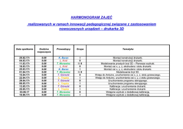 HARMONOGRAM ZAJĘĆ realizowanych w ramach innowacji pedagogicznej związane z zastosowaniem nowoczesnych urządzeń – drukarka 3D Data spotkania Godzina rozpoczęcia Prowadzący Grupa Tematyka 25.02.17r 04.03.17r 11.03.17r 18.03.17r 25.03.17r 01.04.17r 15.04.17r 22.04.17r 29.04.17r 06.05.17r 13.05.17r 25.05.17r 03.06.17 10.06.17r 9.00 9.00 9.00 9.00 9.00 9.00 9.00 9.00 9.00 9.00 9.00 9.00 9.00 9.00 K. Baran L. Król T. Morawiec L. Król K. Baran T. Morawiec T. Górecki Ł. Trepka T. Górecki Ł. Trepka T. Górecki Ł. Trepka T. Morawiec T. Morawiec I II I i II II I I i II II I II I II I II I Montaż konstrukcji drukarki. Montaż konstrukcji drukarki. Modelowanie prostych brył 3D – Pierwsze wydruki. Montaż osi x, y, z, ekstrudera i stołu drukarki. Montaż osi x, y, z, ekstrudera i stołu drukarki. Modelowanie brył 3D. Wstęp do Arduino, uruchomienie osi x, y, z, stołu grzewczego. Wstęp do Arduino, uruchomienie osi x, y, z stołu grzewczego. Uruchomienie programu sterującego. Uruchomienie programu sterującego. Kalibracja i uruchomienie drukarki. Kalibracja i uruchomienie drukarki. Wstępne wydruki z dodatkową kalibracją. Wstępne wydruki z dodatkową kalibracją.