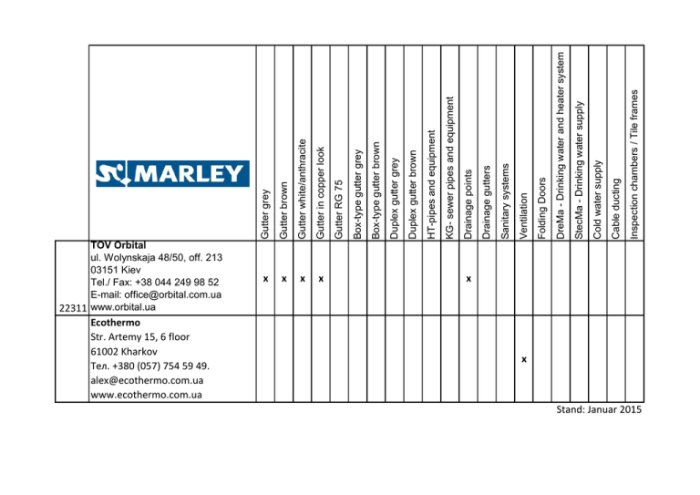 Ecothermo Str. Artemy 15, 6 floor 61002 Kharkov Tел. +380 (057) 754 59 49. [email protected] www.ecothermo.com.ua Gutter brown Gutter white/anthracite Gutter in copper look x x x x Inspection chambers / Tile frames Cable ducting Cold water supply StecMa - Drinking water supply DreMa - Drinking water and heater system Folding Doors Ventilation Sanitary systems Drainage gutters Drainage points KG- sewer pipes and equipment HT-pipes and equipment Duplex gutter brown Duplex gutter grey Box-type gutter brown Box-type gutter grey Gutter RG 75 Gutter grey TOV Orbital ul. Wolynskaja 48/50, off. 213 03151 Kiev Tel./ Fax: +38 044 249 98 52 E-mail: [email protected] 22311 www.orbital.ua x x Stand: Januar 2015