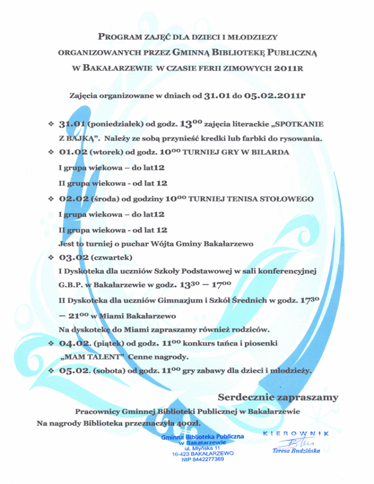 PROGRAMZAJĘĆDLADZIECII MŁODZIEZV ORGANIZOWANYCH PRZEZGMINNĄ BIBLIOTEKĘPuBLICZNĄ W BAKAłARZEWIE W CZASIEFERII ZIMOWYCH2011R Zajęcia organizowane w dniach od 31.01 do 05.02.2011r 1 (poniedziałek) od godz. t1oIl~~". 1300 zajęcia literackie "SPOTKANIE Należy ze sobą przynieść kredki lub farbki do rysowania. (wtorek) od godz. 1000 TURNIEJ GRYW BILARDA I środa) od godziny 1000 TURNIEJ TENISASTOŁOWEGO I,Dl M1Tl.si wiekowa - do lat12 I turniej o puchar Wójta Gminy Bakałarzewo (czwartek) I Dysk teka dla uczniów Szkoły Podstawowej w sali konferencyjnej G.B.P. Bakałarzewie w godz. 1330 - 1~o II Dysko ka dla uczniów Gimnazjum i Szkół Średnich w godz. 1730 do Miami zapraszamy również rodziców • •:. 04. od godz. 1100 konkurs tańca i piosenki .:. 05.02. (sobota) odz.l100gryzabawydladziecii Serdecznie za Pracownicy Gminnej Na nagrody Biblioteka przeznac i