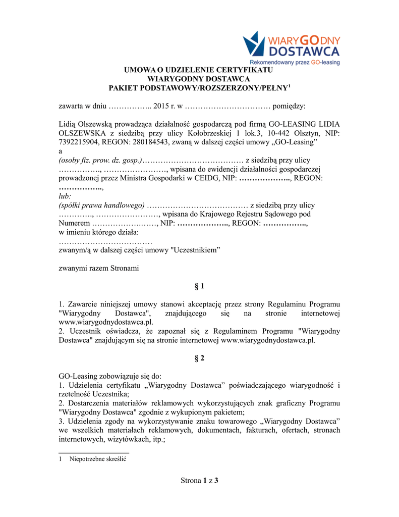 UMOWA O UDZIELENIE CERTYFIKATU WIARYGODNY DOSTAWCA PAKIET PODSTAWOWY/ROZSZERZONY/PEŁNY1 zawarta w dniu …………….. 2015 r. w …………………………… pomiędzy: Lidią Olszewską prowadząca działalność gospodarczą pod firmą GO-LEASING LIDIA OLSZEWSKA z siedzibą przy ulicy Kołobrzeskiej 1 lok.3, 10-442 Olsztyn, NIP: 7392215904, REGON: 280184543, zwaną w dalszej części umowy „GO-Leasing” a (osoby fiz. prow. dz. gosp.)………………………………… z siedzibą przy ulicy ……………., ……………………, wpisana do ewidencji działalności gospodarczej prowadzonej przez Ministra Gospodarki w CEIDG, NIP: ……………….., REGON: …………….., lub: (spółki prawa handlowego) ………………………………… z siedzibą przy ulicy …………., ……………………, wpisana do Krajowego Rejestru Sądowego pod Numerem ……………….……, NIP: ……………….., REGON: …………….., w imieniu którego działa: ……………………………… zwanym/ą w dalszej części umowy "Uczestnikiem” zwanymi razem Stronami §1 1. Zawarcie niniejszej umowy stanowi akceptację przez strony Regulaminu Programu "Wiarygodny Dostawca", znajdującego się na stronie internetowej www.wiarygodnydostawca.pl. 2. Uczestnik oświadcza, że zapoznał się z Regulaminem Programu "Wiarygodny Dostawca" znajdującym się na stronie internetowej www.wiarygodnydostawca.pl. §2 GO-Leasing zobowiązuje się do: 1. Udzielenia certyfikatu „Wiarygodny Dostawca” poświadczającego wiarygodność i rzetelność Uczestnika; 2. Dostarczenia materiałów reklamowych wykorzystujących znak graficzny Programu "Wiarygodny Dostawca" zgodnie z wykupionym pakietem; 3. Udzielenia zgody na wykorzystywanie znaku towarowego „Wiarygodny Dostawca” we wszelkich materiałach reklamowych, dokumentach, fakturach, ofertach, stronach internetowych, wizytówkach, itp.; 1 Niepotrzebne skreślić Strona 1 z 3 4. Zapewnienia Uczestnikowi możliwości wzięcia udziału we wspólnych przedsięwzięciach promocyjnych i marketingowych w GO-LEASING; 5. Weryfikacji Uczestnika u klientów tego Uczestnika, którzy dokonali zakupu pojazdu lub innego przedmiotu leasingu. Uzyskanie co najmniej 90 % opinii pozytywnych przy zachowaniu szczególnej staranności gwarantuje Uczestnikowi uzyskanie i utrzymanie Certyfikatu na czas trwania umowy. § 3. Uczestnik zobowiązuje się do: 1. Udzielenia Kupującemu, Leasingodawcy lub Korzystającemu rzetelnych informacji na temat historii sprzedawanego pojazdu lub maszyny; 2. Przekazania pełnej i kompletnej dokumentacji pojazdu lub maszyny; 3. Pisemnego zagwarantowania oryginalności przebiegu lub liczby przepracowanych godzin przez pojazd lub maszynę; 4. Udzielenia gwarancji bezwypadkowości lub rzetelnego opisu dokonanych napraw pojazdu lub maszyny; 5. Udzielenia co najmniej trzymiesięcznej pisemnej gwarancji na sprzedawany pojazd lub maszynę; 6. Poinformowania GO-Leasing o zamknięciu, zawieszeniu bądź zmianie formy prawnej. 7. Uczestnik zobowiązuje się do posługiwania się Certyfikatem wyłącznie w okresie uczestnictwa w Programie i podczas obowiązywania Programu oraz wyłącznie w ramach wykonywania sprzedaży przedmiotów leasingu. § 4. Niniejsza umowa zostaje zawarta na okres 12 miesięcy, z możliwością przedłużenia od dalsze okresy roczne pod warunkiem utrzymania pozytywnej opinii GO-leasing dotyczącej współpracy z Uczestnikiem. Przez cały okres posiadania Certyfikatu informacja o Uczestniku oraz link do jego oferty widnieje na stronie głównej programu www.wiarygodnydostawca.pl . § 5. Opłaty związane z przyznaniem certyfikatu kształtują się w sposób następujący: 1. Opłata rejestracyjna (jednorazowa) z tytułu przystąpienia do programu wynosi 200 zł + VAT. 2. Opłata roczna (abonament) z tytułu uczestnictwa w programie wynosi: a) Pakiet podstawowy: 690 zł + VAT b) Pakiet rozszerzony: 1290 zł + VAT c) Pakiet pełny: 1890 zł + VAT § 6. Strona 2 z 3 1. Zmiany umowy mogą zostać dokonane w formie pisemnej, pod rygorem nieważności w postaci aneksu do umowy. 2. Stronom przysługuje prawo do rozwiązania niniejszej umowy z zachowaniem jednomiesięcznego okresu wypowiedzenia. Wypowiedzenie umowy musi zostać złożone w formie pisemnej pod rygorem nieważności. § 7. 1. W przypadku sporów wynikających z niniejszej umowy, sądem właściwym dla rozstrzygnięcia sporu będzie sąd właściwy dla siedziby GO-Leasing. 2. Wszelkie zmiany i uzupełnienia Umowy, jak również oświadczenia związane z jej rozwiązaniem, wymagają formy pisemnej w postaci aneksu pod rygorem nieważności. 3. W zakresie nieuregulowanym niniejszą Umową, stosuje się przepisy przepisy prawa powszechnie obowiązującego oraz postanowienia Regulaminu programu “WiaryGOdny Dostawca”, znajdującego się na stronie internetowej www.wiarygodnydostawca.pl. 4. Umowa została sporządzona w dwóch jednobrzmiących egzemplarzach, po jednym dla każdej ze stron. 5. Załącznikiem do niniejszej umowy jest Regulamin Programu "Wiarygodny Dostawca". GO-leasing Uczestnik Strona 3 z 3