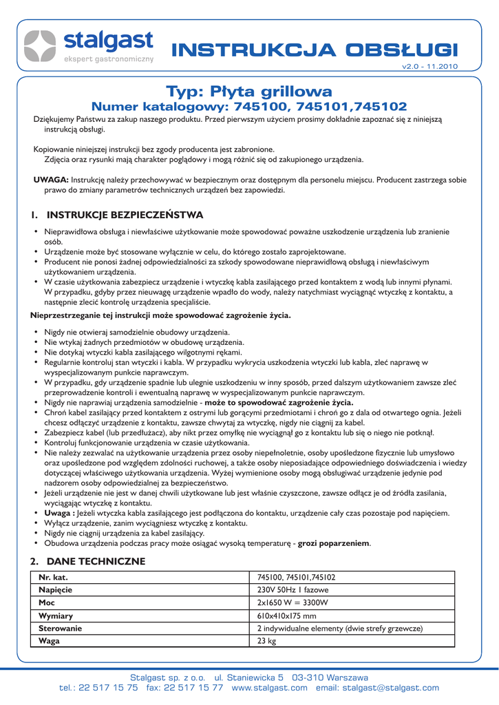 INSTRUKCJA OBSŁUGI v2.0 - 11.2010 Typ: Płyta grillowa Numer katalogowy: 745100, 745101,745102 Dziękujemy Państwu za zakup naszego produktu. Przed pierwszym użyciem prosimy dokładnie zapoznać się z niniejszą instrukcją obsługi. Kopiowanie niniejszej instrukcji bez zgody producenta jest zabronione. Zdjęcia oraz rysunki mają charakter poglądowy i mogą różnić się od zakupionego urządzenia. UWAGA: Instrukcję należy przechowywać w bezpiecznym oraz dostępnym dla personelu miejscu. Producent zastrzega sobie prawo do zmiany parametrów technicznych urządzeń bez zapowiedzi. 1. Instrukcje bezpieczeństwa •• Nieprawidłowa obsługa i niewłaściwe użytkowanie może spowodować poważne uszkodzenie urządzenia lub zranienie osób. •• Urządzenie może być stosowane wyłącznie w celu, do którego zostało zaprojektowane. •• Producent nie ponosi żadnej odpowiedzialności za szkody spowodowane nieprawidłową obsługą i niewłaściwym użytkowaniem urządzenia. •• W czasie użytkowania zabezpiecz urządzenie i wtyczkę kabla zasilającego przed kontaktem z wodą lub innymi płynami. W przypadku, gdyby przez nieuwagę urządzenie wpadło do wody, należy natychmiast wyciągnąć wtyczkę z kontaktu, a następnie zlecić kontrolę urządzenia specjaliście. Nieprzestrzeganie tej instrukcji może spowodować zagrożenie życia. •• •• •• •• •• •• •• •• •• •• •• •• •• •• •• Nigdy nie otwieraj samodzielnie obudowy urządzenia. Nie wtykaj żadnych przedmiotów w obudowę urządzenia. Nie dotykaj wtyczki kabla zasilającego wilgotnymi rękami. Regularnie kontroluj stan wtyczki i kabla. W przypadku wykrycia uszkodzenia wtyczki lub kabla, zleć naprawę w wyspecjalizowanym punkcie naprawczym. W przypadku, gdy urządzenie spadnie lub ulegnie uszkodzeniu w inny sposób, przed dalszym użytkowaniem zawsze zleć przeprowadzenie kontroli i ewentualną naprawę w wyspecjalizowanym punkcie naprawczym. Nigdy nie naprawiaj urządzenia samodzielnie - może to spowodować zagrożenie życia. Chroń kabel zasilający przed kontaktem z ostrymi lub gorącymi przedmiotami i chroń go z dala od otwartego ognia. Jeżeli chcesz odłączyć urządzenie z kontaktu, zawsze chwytaj za wtyczkę, nigdy nie ciągnij za kabel. Zabezpiecz kabel (lub przedłużacz), aby nikt przez omyłkę nie wyciągnął go z kontaktu lub się o niego nie potknął. Kontroluj funkcjonowanie urządzenia w czasie użytkowania. Nie należy zezwalać na użytkowanie urządzenia przez osoby niepełnoletnie, osoby upośledzone fizycznie lub umysłowo oraz upośledzone pod względem zdolności ruchowej, a także osoby nieposiadające odpowiedniego doświadczenia i wiedzy dotyczącej właściwego użytkowania urządzenia. Wyżej wymienione osoby mogą obsługiwać urządzenie jedynie pod nadzorem osoby odpowiedzialnej za bezpieczeństwo. Jeżeli urządzenie nie jest w danej chwili użytkowane lub jest właśnie czyszczone, zawsze odłącz je od źródła zasilania, wyciągając wtyczkę z kontaktu. Uwaga : Jeżeli wtyczka kabla zasilającego jest podłączona do kontaktu, urządzenie cały czas pozostaje pod napięciem. Wyłącz urządzenie, zanim wyciągniesz wtyczkę z kontaktu. Nigdy nie ciągnij urządzenia za kabel zasilający. Obudowa urządzenia podczas pracy może osiągać wysoką temperaturę - grozi poparzeniem. 2. DANE TECHNICZNE Nr. kat. Napięcie 745100, 745101,745102 230V 50Hz 1 fazowe Moc 2x1650 W = 3300W Wymiary Sterowanie Waga 610x410x175 mm 2 indywidualne elementy (dwie strefy grzewcze) 23 kg Stalgast sp. z o.o. ul. Staniewicka 5 03-310 Warszawa tel.: 22 517 15 75 fax: 22 517 15 77 www.stalgast.com email: [email protected] 3. panel sterownia 1. Regulacja temperatury 2. Kontrolka grzania 1 2 4. Instalacja i obsługa 1. Dokładnie przeczytaj instrukcję obsługi przed uruchomieniem urządzenia. 2. Grille są zaprojektowane do pracy tylko przy zasilaniu AC (prąd przemienny). Nie podłączaj urządzenia do zasilania DC (prąd stały). 3. Urządzenie należy podłączyć do gniazda z uziemieniem. 4. Upewnij się, że źródło zasilania posiada takie samo napięcie jak to wymagane przez urządzenie (tak jak opisano na tabliczce znamionowej). 5. Temperatura jest sterowana termostatem w zakresie od 50oC do 300OC. 6. Przed uruchomieniem urządzenia pierwszy raz, zdejmij warstwę ochronną mokrą szmatką i przekręć pokrętło sterujące na 300OC. Pozwól grillowi pracować przez ±30 minut. Możesz zauważyć dym, pochodzi on z warstwy ochronnej i jest to normalne. 7. Po 30 minutach grzania, przekręć pokrętło sterujące na wymaganą temperaturę i natłuść płytę masłem w dużej ilości lub olejem. Nie pozwól na zbieranie większej ilości tłuszczu lub oleju ponieważ może to spowodować zaleganie węgla na płytach. Węgiel powinien być od razu usunięty z płyty skrobaczką. 8. Urządzenie jest wyposażone w szufladę na tłuszcz , do której spływają również zeskrobane pozostałości. 9. Urządzenie powinno być rozgrzane przed dzienną obsługą. Zawsze rozgrzewaj urządzenie przez 15 minut przed grillowaniem jedzenia. Zapewnia to równomierne rozprowadzenie ciepła. 10. Aby wyłączyć urządzenie, przekręć pokrętło termostatu do końca w lewą stronę. 5. Ważne 1. Należy ostrożnie obsługiwać urządzenie, ponieważ gorące powierzchnie mogą oparzyć. 2. Upewnij się, że kabel zasilania nie dotyka gorących powierzchni. 3. Nie zostawiaj włączonego urządzenie bez opieki. Odłącz urządzenie od zasilania kiedy nie jest ono używane. 6. Procedura czyszczenia 1. Odłącz urządzenie od zasilania przed czyszczeniem. 2. Zdrap jak najwięcej tłuszczu i pozostałości jedzenia z powierzchni grillowej za pomocą jedynie wilgotnej szmatki. 3. Po ostudzeniu urządzenia, wyczyść powierzchnie grillowania i obudowę wilgotną szmatką. 4. Nigdy nie zanurzaj urządzenia w wodzie lub używaj strumienia wody do czyszczenia.