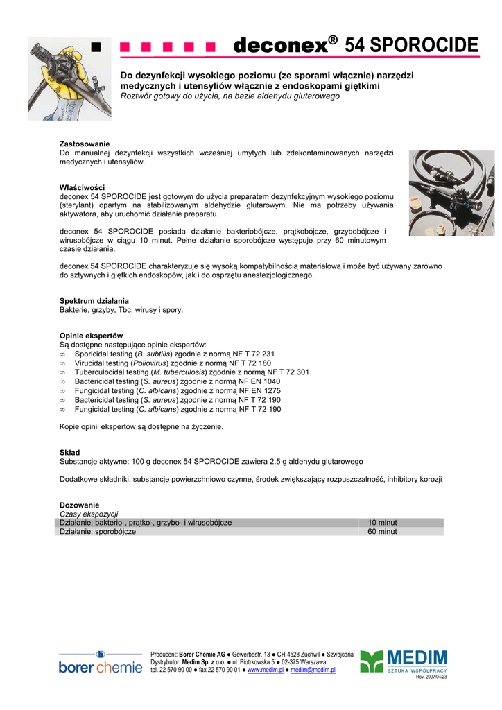 ■ ■ ■ ■ ■ ■ deconex deconex® 54 SPOROCIDE Do dezynfekcji wysokiego poziomu (ze sporami włącznie) narzędzi medycznych i utensyliów włącznie z endoskopami giętkimi Roztwór gotowy do uŜycia, na bazie aldehydu glutarowego Zastosowanie Do manualnej dezynfekcji wszystkich wcześniej umytych lub zdekontaminowanych narzędzi medycznych i utensyliów. Właściwości deconex 54 SPOROCIDE jest gotowym do uŜycia preparatem dezynfekcyjnym wysokiego poziomu (sterylant) opartym na stabilizowanym aldehydzie glutarowym. Nie ma potrzeby uŜywania aktywatora, aby uruchomić działanie preparatu. deconex 54 SPOROCIDE posiada działanie bakteriobójcze, prątkobójcze, grzybobójcze i wirusobójcze w ciągu 10 minut. Pełne działanie sporobójcze występuje przy 60 minutowym czasie działania. deconex 54 SPOROCIDE charakteryzuje się wysoką kompatybilnością materiałową i moŜe być uŜywany zarówno do sztywnych i giętkich endoskopów, jak i do osprzętu anestezjologicznego. Spektrum działania Bakterie, grzyby, Tbc, wirusy i spory. Opinie ekspertów Są dostępne następujące opinie ekspertów: • Sporicidal testing (B. subtilis) zgodnie z normą NF T 72 231 • Virucidal testing (Poliovirus) zgodnie z normą NF T 72 180 • Tuberculocidal testing (M. tuberculosis) zgodnie z normą NF T 72 301 • Bactericidal testing (S. aureus) zgodnie z normą NF EN 1040 • Fungicidal testing (C. albicans) zgodnie z normą NF EN 1275 • Bactericidal testing (S. aureus) zgodnie z normą NF T 72 190 • Fungicidal testing (C. albicans) zgodnie z normą NF T 72 190 Kopie opinii ekspertów są dostępne na Ŝyczenie. Skład Substancje aktywne: 100 g deconex 54 SPOROCIDE zawiera 2.5 g aldehydu glutarowego Dodatkowe składniki: substancje powierzchniowo czynne, środek zwiększający rozpuszczalność, inhibitory korozji Dozowanie Czasy ekspozycji Działanie: bakterio-, prątko-, grzybo- i wirusobójcze Działanie: sporobójcze 10 minut 60 minut Producent: Borer Chemie AG ● Gewerbestr. 13 ● CH-4528 Zuchwil ● Szwajcaria Dystrybutor: Medim Sp. z o.o. ● ul. Piotrkowska 5 ● 02-375 Warszawa tel. 22 570 90 00 ● fax 22 570 90 01 ● www.medim.pl ● [email protected] Rev. 2007/04/23 ■ ■ ■ ■ ■ ■ deconex deconex® 54 SPOROCIDE Właściwości Dezynfekcja z uŜyciem deconex 54 SPOROCIDE zawsze musi być poprzedzone wcześniejszym umyciem z pomocą np. deconex 3-ZYME, deconex 36 INTENSIV lub deconex 36 BS lub zdekontaminowane z pomocą deconex 50 FF/36 INTENSIV. Jest istotne, aby z pomocą deconex 54 SPOROCIDE dezynfekować tylko czyste przedmioty (wolne od krwi, tkanek i pozostałości białek). deconex 54 SPOROCIDE powinien być stosowany tylko w pomieszczeniach dobrze wentylowanych. Wanna dezynfekcyjna powinna być zamykana pokrywą. W przypadku dezynfekowania narzędzi z wewnętrznymi kanałami naleŜy zwrócić szczególną uwagę na to, Ŝeby podczas zanurzania narzędzia w kanałach nie pozostały pęcherzyki powietrza. Po dezynfekcji w deconex 54 SPOROCIDE narzędzia muszą być wypłukane w czystej lub sterylnej (jeŜeli potrzeba) wodzie. Preparat dezynfekcyjny moŜe być uŜywany w ciągu 28 dni, tak długo jak będą zachowane następujące reguły: 1. Aby zapobiec odparowywaniu preparatu wanna dezynfekcyjna musi być zawsze przykryta. 2. Dezynfekowane narzędzia muszą być czyste i suche. Zapobiega to zanieczyszczeniu roztworu oraz jego rozcieńczeniu. 3. JeŜeli pojawią się widoczne zanieczyszczenia, jak np. osady, zmętnienie roztworu, zmiana koloru, roztwór dezynfekcyjny musi być wymieniony na nowy. Kompatybilność materiałowa Preparat nadaje się do: Stali nierdzewnej, aluminium, anodowanego aluminium, metali niemagnetycznych, materiałów syntetycznych, gumy, lateksu i szkła. Dla materiałów nie wymienionych powyŜej proszę wykonać własny test kompatybilności materiałowej lub skontaktować się z przedstawicielem Borer Chemie AG w Polsce. Dane fizyko-chemiczne pH gęstość wygląd Koncentrat Koncentrat Koncentrat około 5,9 1.00 g/ml przezroczysty, bez koloru Dostępność Proszę pytać lokalnego dystrybutora o dostępne wielkości opakowań. Pojemniki, zakrętki i etykiety są wykonane z polietylenu podlegającemu recyklingowi. Dodatkowe informacje Informacje dotyczące bezpieczeństwa pracy, przechowywania, usuwania odpadów znajdują się w karcie charakterystyki substancji niebezpiecznej. Proszę skorzystać z naszego know-how ! Proszę się z nami skontaktować, aby zastosować nasze produkty do Państwa specyficznych zastosowań. 1250 Wszystkie powyŜsze informacje są oparte na naszej aktualnej wiedzy i nie mogą stanowić zabezpieczenia specyficznych właściwości produktu. Producent: Borer Chemie AG ● Gewerbestr. 13 ● CH-4528 Zuchwil ● Szwajcaria Dystrybutor: Medim Sp. z o.o. ● ul. Piotrkowska 5 ● 02-375 Warszawa tel. 22 570 90 00 ● fax 22 570 90 01 ● www.medim.pl ● [email protected] Rev. 2007/04/23