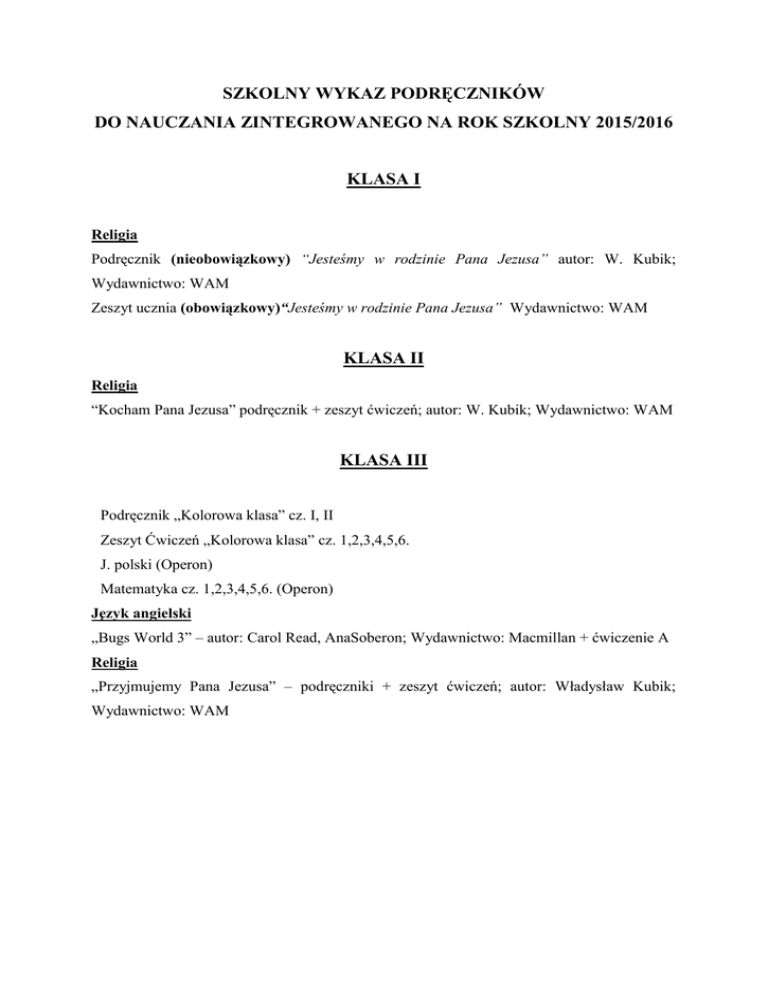 SZKOLNY WYKAZ PODRĘCZNIKÓW DO NAUCZANIA ZINTEGROWANEGO NA ROK SZKOLNY 2015/2016 KLASA I Religia Podręcznik (nieobowiązkowy) “Jesteśmy w rodzinie Pana Jezusa” autor: W. Kubik; Wydawnictwo: WAM Zeszyt ucznia (obowiązkowy)“Jesteśmy w rodzinie Pana Jezusa” Wydawnictwo: WAM KLASA II Religia “Kocham Pana Jezusa” podręcznik + zeszyt ćwiczeń; autor: W. Kubik; Wydawnictwo: WAM KLASA III Podręcznik „Kolorowa klasa” cz. I, II Zeszyt Ćwiczeń „Kolorowa klasa” cz. 1,2,3,4,5,6. J. polski (Operon) Matematyka cz. 1,2,3,4,5,6. (Operon) Język angielski „Bugs World 3” – autor: Carol Read, AnaSoberon; Wydawnictwo: Macmillan + ćwiczenie A Religia „Przyjmujemy Pana Jezusa” – podręczniki + zeszyt ćwiczeń; autor: Władysław Kubik; Wydawnictwo: WAM