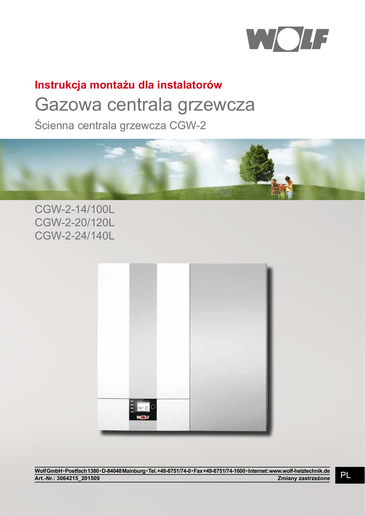 Instrukcja montażu dla instalatorów Gazowa centrala grzewcza Ścienna centrala grzewcza CGW-2 CGW-2-14/100L CGW-2-20/120L CGW-2-24/140L Wolf GmbH • Postfach 1380 • D-84048 Mainburg • Tel. +49-8751/74-0 • Fax +49-8751/74-1600 • Internet: www.wolf-heiztechnik.de Art.-Nr.: 3064215_201509 Zmiany zastrzeżone PL Spis treści 1. 2. 3. 4. 5. 6. 7. 8. Wskazówki dotyczące dokumentacji/zakresu dostawy.........................................3 Wskazówki dotyczące bezpieczeństwa ........................................................... 4-5 Wymiary zewnętrzne/montażowe.........................................................................6 Dane techniczne...................................................................................................7 Schemat funkcyjny................................................................................................8 Elektroniczna kontrola spalania............................................................................9 Obudowa ...........................................................................................................10 Normy i przepisy............................................................................................11-13 Instalacja 9. Usytuowanie urządzenia............................................................................14 10. Montaż/demontaż................................................................................. 15-16 11. Instalacja.............................................................................................. 17-18 12. Przyłącze gazowe......................................................................................19 13. Montaż syfonu............................................................................................20 14. Prowadzenie powietrze/spaliny..................................................................21 Sterowanie 15. Przyłącze elektryczne . ........................................................................ 22-27 16. Przyłącze elektryczne klapy spalinowej/klapy dolotowej............................28 17. Moduł wyświetlacza/moduł obsługowy/montaż..........................................29 18. Moduł wyświetlacza/moduł obsługowy/demontaż......................................30 19. Moduł wyświetlacza AM.............................................................................31 20. Tryby pracy/stan palnika urządzenia grzewczego......................................32 21. Moduł obsługowy BM-2..............................................................................33 22. Parametry sterowania HG..........................................................................34 23. Opis parametrów ................................................................................. 35-45 Uruchomienie 24. Napełnianie urządzenia........................................................................ 46-47 25. Napełnianie opcjonalnych wersji urządzenia..............................................48 26. Opróżnianie urządzenia grzewczego.........................................................49 27. Ustalenie/zmiana typu gazu................................................................. 50-51 28. Uruchomienie.............................................................................................52 29. Kontrola ciśnienia przyłącza gazowego.....................................................53 30. Dostosowanie maksymalnej mocy grzewczej............................................54 31. Pomiar parametrów spalania................................................................ 55-56 32. Opis działania pompy wysokosprawnej/obiegowej.............................. 57-58 33. Protokół uruchomienia.......................................................................... 59-60 Dane techniczne 34. Elementy zabezpieczenia...........................................................................61 35. Wskazówki dotyczące planowania: prowadzenie powietrze/spaliny.... 62-76 36. Wskazówki dotyczące planowania: ogrzewanie podłogowe/cyrkulacja.....77 37. Dane techniczne dotyczące konserwacji i planowania...............................78 38. Usterki: przyczyny i usuwanie.............................................................. 79-86 39. Komunikaty ostrzegawcze: przyczyny i usuwanie................................ 87-88 40. Schemat elektryczny HCM-2/GBC-e.................................................... 89-90 41. Karta produktu według wymogów (UE) nr 811/2013..................................91 42. Parametry techniczne według zarządzenia (UE) nr 813/2013...................92 43. Notatki........................................................................................................93 Deklaracja zgodności UE....................................................................................95 2 3064215_201509 1. Wskazówki dotyczące dokumentacji/zakresu dostawy 1.1 Dokumentacja dodatkowa - Instrukcja obsługi dla użytkowników - Instrukcja konserwacji - Książka serwisowa i eksploatacji Obowiązuje także treść instrukcji wszystkich zastosowanych modułów dodatkowych i innych elementów wyposażenia. 1.2 Przechowywanie dokumentacji Operator lub użytkownik urządzenia przejmuje odpowiedzialność za prawidłowe przechowywanie wszystkich instrukcji i dokumentacji. ► Przekaż operatorowi lub użytkownikowi urządzenia poniższą instrukcję montażu oraz wszystkie inne dołączone instrukcje. 1.3 Obowiązki użytkownika Użytkownik urządzenia jest zobowiązany do dołożenia wszelkich starań w celu zapewnienia bezpiecznej eksploatacji gazowego urządzenia grzewczego. Dotyczy to konserwacji urządzenia przez odpowiednią, specjalistyczną firmę. Obowiązek prowadzenia odpowiedniej dokumentacji należy do użytkownika urządzenia. 1.4 Zakres obowiązywania instrukcji Poniższa instrukcja montażu dotyczy gazowych urządzeń grzewczych typu CGS-2. 1.5 Odbiór techniczny Obowiązkie