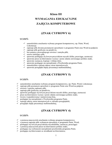 Klasa III WYMAGANIA EDUKACYJNE ZAJĘCIA KOMPUTEROWE (ZNAK CYFROWY 6) UCZEŃ: samodzielnie uruchamia wybrany program komputerowy, np. Paint, Word, Lokomocja zapisuje plik dwoma poznanymi sposobami w programie Paint oraz Word na pulpicie zapisuje plik graficzny na pendrivie, bez pomocy prowadzącego otwiera i zamyka plik, usuwa istniejący plik, sprawnie posługuje się lewym przyciskiem myszki (klika, przeciąga, zaznacza) sprawnie pisze na klawiaturze wyrazy i poste zdania zawierające polskie znaki, sprawnie zaznacza, kopiuje i wkleja tekst, sprawnie posługuje się narzędziami z Przybornika programu Paint, samodzielnie wpisuje adresy stron internetowych, sprawnie przegląda slajdy prezentacji multimedialnej, (ZNAK CYFROWY 5) UCZEŃ: samodzielnie uruchamia wybrany program komputerowy, np. Paint, Word, Lokomocja zapisuje plik poznanym sposobem w programie Paint oraz Word na pulpicie otwiera i zamyka zapisany plik, zapisuje plik graficzny na pendrivie, sprawnie posługuje się lewym przyciskiem myszki (klika, przeciąga, zaznacza) pisze na klawiaturze wyrazy i poste zdania zawierające polskie znaki, tworzy wypunktowaną i numerowaną listę, posługuje się narzędziami z Przybornika programu Paint, wpisuje adresy stron internetowych w okienko przeglądarki, przegląda slajdy prezentacji multimedialnej, (ZNAK CYFROWY 4) UCZEŃ: z pomocą nauczyciela uruchamia wybrany program komputerowy z pomocą zapisuje plik wybranym sposobem w programie Paint, Word, posługuje się lewym przyciskiem myszki(klika, zaznacza, przeciąga) z pomocą nauczyciela pisze na klawiaturze polskie znaki, posługuje się wybranymi narzędziami przybornika programu Paint, posługuje się klawiszami ze strzałkami na klawiaturze, 1 pisze na klawiaturze wybrane litery i proste zdania, quiz z pomocą nauczyciela serfuje po wybranych stronach Internetu, wie gdzie wpisuje się adres strony Internetowej, z pomocą nauczyciela rozwiązuje komputerowy (ZNAK CYFROWY 3) UCZEŃ: z pomocą nauczyciela uruchamia wybrany program komputerowy z pomocą uruchamia płytę CD, z pomocą nauczyciela pisze na klawiaturze, niektóre polskie znaki, używa klawisz Enter i Spacja, pisze proste wyrazy i zdania z pomocą nauczyciela posługuje się z pomocą nauczyciela wybranymi narzędziami przybornika programu Paint, uruchamia przeglądarkę internetową, z pomocą nauczyciela wpisuje adresy stron internetowych, zna przeznaczenie prawego i lewego przycisku myszki, (ZNAK CYFROWY 2) UCZEŃ: z pomocą pisze prosty tekst, korzysta z przybornika Paint z pomocą nauczyciela, potrzebuje dodatkowej pomocy przy wykonywaniu zadań, niechętnie pracuje przy komputerze, unika samodzielnej pracy 2