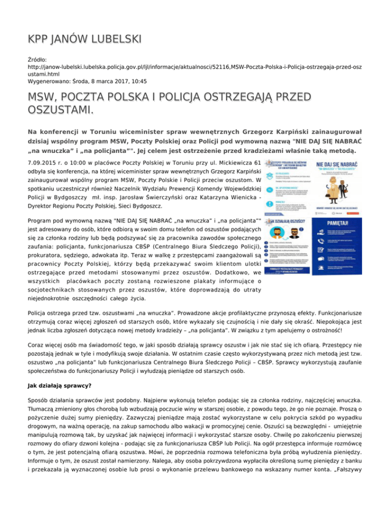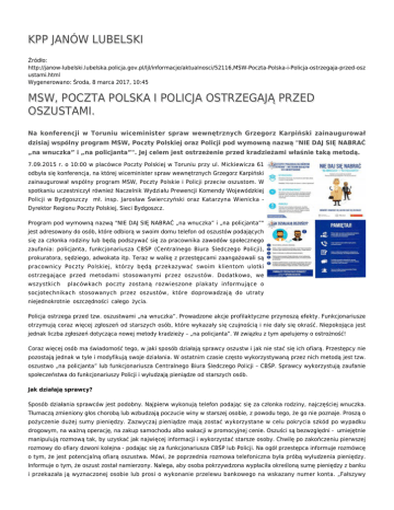 KPP JANÓW LUBELSKI Źródło: http://janow-lubelski.lubelska.policja.gov.pl/ljl/informacje/aktualnosci/52116,MSW-Poczta-Polska-i-Policja-ostrzegaja-przed-osz ustami.html Wygenerowano: Środa, 8 marca 2017, 10:45 MSW, POCZTA POLSKA I POLICJA OSTRZEGAJĄ PRZED OSZUSTAMI. Na konferencji w Toruniu wiceminister spraw wewnętrznych Grzegorz Karpiński zainaugurował dzisiaj wspólny program MSW, Poczty Polskiej oraz Policji pod wymowną nazwą "NIE DAJ SIĘ NABRAĆ „na wnuczka” i „na policjanta”". Jej celem jest ostrzeżenie przed kradzieżami właśnie taką metodą. 7.09.2015 r. o 10:00 w placówce Poczty Polskiej w Toruniu przy ul. Mickiewicza 61 odbyła się konferencja, na której wiceminister spraw wewnętrznych Grzegorz Karpiński zainaugurował wspólny program MSW, Poczty Polskie i Policji przeciw oszustom. W spotkaniu uczestniczył również Naczelnik Wydziału Prewencji Komendy Wojewódzkiej Policji w Bydgoszczy mł. insp. Jarosław Świerczyński oraz Katarzyna Wienicka Dyrektor Regionu Poczty Polskiej, Sieci Bydgoszcz. Program pod wymowną nazwą "NIE DAJ SIĘ NABRAĆ „na wnuczka” i „na policjanta”" jest adresowany do osób, które odbiorą w swoim domu telefon od oszustów podających się za członka rodziny lub będą podszywać się za pracownika zawodów społecznego zaufania: policjanta, funkcjonariusza CBŚP (Centralnego Biura Śledczego Policji), prokuratora, sędziego, adwokata itp. Teraz w walkę z przestępcami zaangażowali są pracownicy Poczty Polskiej, którzy będą przekazywać swoim klientom ulotki ostrzegające przed metodami stosowanymi przez oszustów. Dodatkowo, we wszystkich placówkach poczty zostaną rozwieszone plakaty informujące o socjotechnikach stosowanych przez oszustów, które doprowadzają do utraty niejednokrotnie oszczędności całego życia. Policja ostrzega przed tzw. oszustwami „na wnuczka”. Prowadzone akcje profilaktyczne przynoszą efekty. Funkcjonariusze otrzymują coraz więcej zgłoszeń od starszych osób, które wykazały się czujnością i nie dały się okraść. Niepokojąca jest jednak liczba zgłoszeń dotycząca nowej metody kradzieży – „na policjanta”. W związku z tym apelujemy o ostrożność! Coraz więcej osób ma świadomość tego, w jaki sposób działają sprawcy oszustw i jak nie stać się ich ofiarą. Przestępcy nie pozostają jednak w tyle i modyfikują swoje działania. W ostatnim czasie często wykorzystywaną przez nich metodą jest tzw. oszustwo „na policjanta” lub funkcjonariusza Centralnego Biura Śledczego Policji – CBŚP. Sprawcy wykorzystują zaufanie społeczeństwa do funkcjonariuszy Policji i wyłudzają pieniądze od starszych osób. Jak działają sprawcy? Sposób działania sprawców jest podobny. Najpierw wykonują telefon podając się za członka rodziny, najczęściej wnuczka. Tłumaczą zmieniony głos chorobą lub wzbudzają poczucie winy w starszej osobie, z powodu tego, że go nie poznaje. Proszą o pożyczenie dużej sumy pieniędzy. Zazwyczaj pieniądze mają zostać wykorzystane w celu pokrycia szkód po wypadku drogowym, na ważną operację, na zakup samochodu albo wakacji w promocyjnej cenie. Oszuści są bezwzględni - umiejętnie manipulują rozmową tak, by uzyskać jak najwięcej informacji i wykorzystać starsze osoby. Chwilę po zakończeniu pierwszej rozmowy do ofiary dzwoni kolejna - podając się za funkcjonariusza CBŚP lub Policji. Na ogół przestępca informuje rozmówcę o tym, że jest potencjalną ofiarą oszustwa. Mówi, że poprzednia rozmowa telefoniczna była próbą wyłudzenia pieniędzy. Informuje o tym, że oszust został namierzony. Nalega, aby osoba pokrzywdzona wypłaciła określoną sumę pieniędzy z banku i przekazała ją wyznaczonej osobie lub prosi o wykonanie przelewu bankowego na wskazany numer konta. „Fałszywy funkcjonariusz” podaje często wymyślone nazwisko, a nawet numer odznaki. Prosi, aby nie przerywać rozmowy telefonicznej i wybrać numer na Policję. Wtedy inny głos w słuchawce przekonuje ofiarę, że bierze udział w akcji rozpracowania oszusta. Sprawcy oszustw wywierają na ofiarach presję czasu. Nie dają chwili na zastanowienie się, czy sprawdzenie informacji o dzwoniącym. Przekonują starsze osoby, że ich pieniądze pomogą w schwytaniu przestępców. Mówią, że gotówka przechowywana na koncie nie jest bezpieczna, a oszust ma do nich łatwy dostęp. Przestępcy podając się za funkcjonariuszy, grożą konsekwencjami prawnymi, jeżeli ich rozmówca nie będzie współpracował. Tuż po przekazaniu pieniędzy kontakt się urywa, a przestępcy znikają ze wszystkimi oszczędnościami ofiary. Jak nie stać się ofiarą oszustów? Przede wszystkim należy zachować ostrożność – jeżeli dzwoni do nas ktoś, kto podszywa się pod członka naszej rodziny i prosi o pieniądze, nie podejmujmy żadnych pochopnych działań. Nie informujmy nikogo telefonicznie o ilości pieniędzy, które mamy w domu lub jakie przechowujemy na koncie. Nie wypłacajmy z banku wszystkich oszczędności. Zadzwońmy do kogoś z rodziny, zapytajmy o to czy osoba, która prosiła nas o pomoc, rzeczywiście jej potrzebuje. Pamiętajmy, że nikt nie będzie nam miał za złe tego, że zachowujemy się rozsądnie. Nie ulegajmy presji czasu wywieranej przez oszustów. W szczególności pamiętajmy o tym, że funkcjonariusze Policji NIGDY nie informują o prowadzonych przez siebie sprawach telefonicznie! Nigdy nie proszą też o przekazanie jakiejkolwiek gotówki! W momencie, kiedy ktoś będzie chciał nas oszukać, podając się przez telefon za policjanta – zakończmy rozmowę telefoniczną! Nie wdawajmy się w rozmowę z oszustem. Jeżeli nie wiemy jak zareagować, powiedzmy o podejrzanym telefonie komuś z bliskich. Zwracamy się z apelem, zwłaszcza do osób młodych informujmy naszych rodziców i dziadków o tym, że są osoby, które mogą chcieć wykorzystać ich życzliwość. Powiedzmy im jak zachować się 