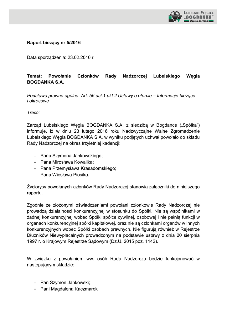 Raport bieżący nr 5/2016 Data sporządzenia: 23.02.2016 r. Temat: Powołanie BOGDANKA S.A. Członków Rady Nadzorczej Lubelskiego Węgla Podstawa prawna ogólna: Art. 56 ust.1 pkt 2 Ustawy o ofercie – Informacje bieżące i okresowe Treść: Zarząd Lubelskiego Węgla BOGDANKA S.A. z siedzibą w Bogdance („Spółka”) informuje, iż w dniu 23 lutego 2016 roku Nadzwyczajne Walne Zgromadzenie Lubelskiego Węgla BOGDANKA S.A. w wyniku podjętych uchwał powołało do składu Rady Nadzorczej na okres trzyletniej kadencji: Pana Szymona Jankowskiego; Pana Mirosława Kowalika; Pana Przemysława Krasadomskiego; Pana Wiesława Piosika. Życiorysy powołanych członków Rady Nadzorczej stanowią załączniki do niniejszego raportu. Zgodnie ze złożonymi oświadczeniami powołani członkowie Rady Nadzorczej nie prowadzą działalności konkurencyjnej w stosunku do Spółki. Nie są wspólnikami w żadnej konkurencyjnej wobec Spółki spółce cywilnej, osobowej i nie pełnią funkcji w organach konkurencyjnej spółki kapitałowej, oraz nie są członkami organów w innych konkurencyjnych wobec Spółki osobach prawnych. Nie figurują również w Rejestrze Dłużników Niewypłacalnych prowadzonym na podstawie ustawy z dnia 20 sierpnia 1997 r. o Krajowym Rejestrze Sądowym (Dz.U. 2015 poz. 1142). W związku z powołaniem ww. osób Rada Nadzorcza będzie funkcjonować w następującym składzie: Pan Szymon Jankowski; Pani Magdalena Kaczmarek Pan Mirosław Kowalik; Pan Przemysław Krasadomski; Pan Wiesław Piosik; Pan Michał Stopyra. Podstawa prawna przekazania raportu: RMF GPW § 5 ust.1 pkt. 22