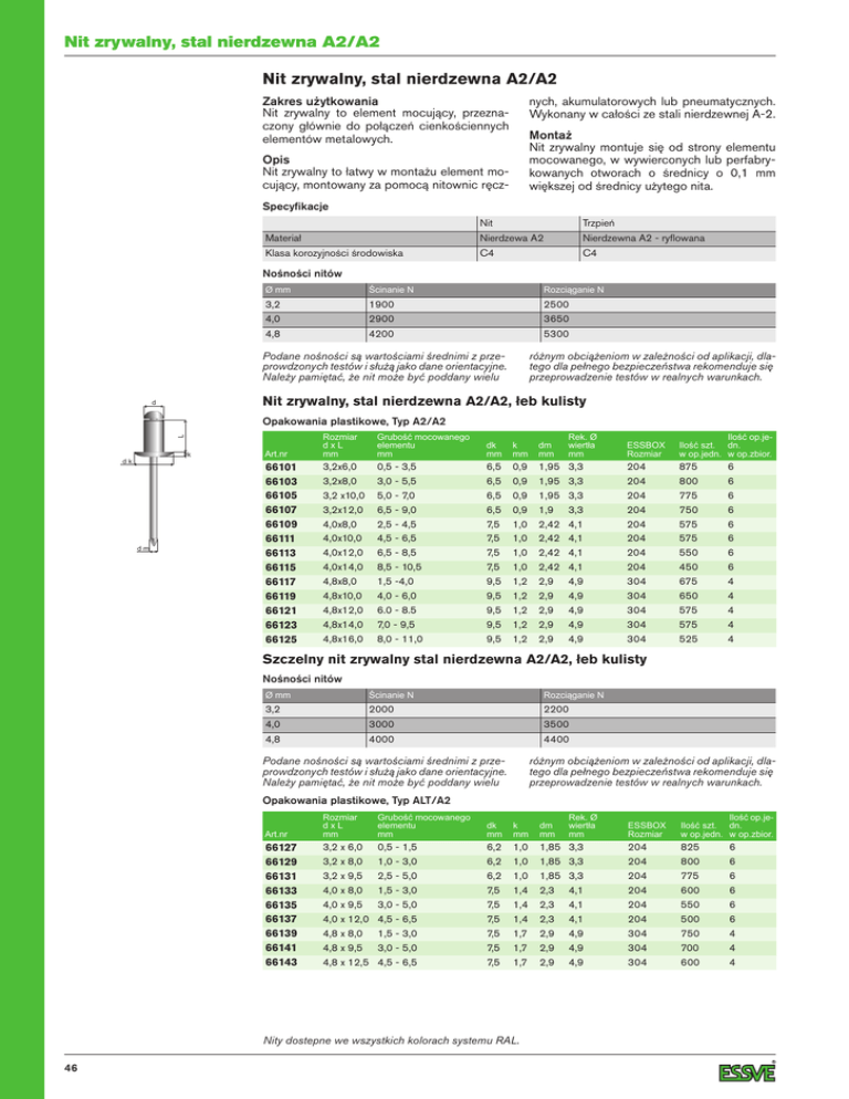 Nit zrywalny, stal nierdzewna A2/A2 Nit zrywalny, stal nierdzewna A2/A2 Zakres użytkowania Nit zrywalny to element mocujący, przeznaczony głównie do połączeń cienkościennych elementów metalowych. nych, akumulatorowych lub pneumatycznych. Wykonany w całości ze stali nierdzewnej A-2. Montaż Nit zrywalny montuje się od strony elementu mocowanego, w wywierconych lub perfabrykowanych otworach o średnicy o 0,1 mm większej od średnicy użytego nita. Opis Nit zrywalny to łatwy w montażu element mocujący, montowany za pomocą nitownic ręczSpecyfikacje Nit Trzpień Materiał Nierdzewa A2 Nierdzewna A2 - ryflowana Klasa korozyjności środowiska C4 C4 Nośności nitów Ø mm ĝcinanie N Rozciąganie N 3,2 1900 2500 4,0 2900 3650 4,8 4200 5300 Podane nośności są wartościami średnimi z przeprowdzonych testów i służą jako dane orientacyjne. Należy pamiętać, że nit może być poddany wielu różnym obciążeniom w zależności od aplikacji, dlatego dla pełnego bezpieczeństwa rekomenduje się przeprowadzenie testów w realnych warunkach. Nit zrywalny, stal nierdzewna A2/A2, łeb kulisty d Opakowania plastikowe, Typ A2/A2 Art.nr Rozmiar dxL mm GruboĞü mocowanego elementu mm dk mm k mm dm mm Rek. Ø wiertáa mm ESSBOX Rozmiar IloĞü op.jeIloĞü szt. dn. w op.jedn. w op.zbior. 66101 66103 66105 66107 66109 66111 66113 66115 66117 66119 66121 66123 66125 3,2x6,0 3,2x8,0 3,2 x10,0 3,2x12,0 4,0x8,0 4,0x10,0 4,0x12,0 4,0x14,0 4,8x8,0 4,8x10,0 4,8x12,0 4,8x14,0 4,8x16,0 0,5 - 3,5 3,0 - 5,5 5,0 - 7,0 6,5 - 9,0 2,5 - 4,5 4,5 - 6,5 6,5 - 8,5 8,5 - 10,5 1,5 -4,0 4,0 - 6,0 6.0 - 8.5 7,0 - 9,5 8,0 - 11,0 6,5 6,5 6,5 6,5 7,5 7,5 7,5 7,5 9,5 9,5 9,5 9,5 9,5 0,9 0,9 0,9 0,9 1,0 1,0 1,0 1,0 1,2 1,2 1,2 1,2 1,2 1,95 1,95 1,95 1,9 2,42 2,42 2,42 2,42 2,9 2,9 2,9 2,9 2,9 3,3 3,3 3,3 3,3 4,1 4,1 4,1 4,1 4,9 4,9 4,9 4,9 4,9 204 204 204 204 204 204 204 204 304 304 304 304 304 875 800 775 750 575 575 550 450 675 650 575 575 525 L k dk dm 6 6 6 6 6 6 6 6 4 4 4 4 4 Szczelny nit zrywalny stal nierdzewna A2/A2, łeb kulisty Nośności nitów Ø mm ĝcinanie N Rozciąganie N 3,2 2000 2200 4,0 3000 3500 4,8 4000 4400 Podane nośności są wartościami średnimi z przeprowdzonych testów i służą jako dane orientacyjne. Należy pamiętać, że nit może być poddany wielu różnym obciążeniom w zależności od aplikacji, dlatego dla pełnego bezpieczeństwa rekomenduje się przeprowadzenie testów w realnych warunkach. Opakowania plastikowe, Typ ALT/A2 Art.nr Rozmiar dxL mm GruboĞü mocowanego elementu mm dk mm k mm dm mm Rek. Ø wiertáa mm ESSBOX Rozmiar IloĞü op.jeIloĞü szt. dn. w op.jedn. w op.zbior. 66127 66129 66131 66133 66135 66137 66139 66141 66143 3,2 x 6,0 3,2 x 8,0 3,2 x 9,5 4,0 x 8,0 4,0 x 9,5 4,0 x 12,0 4,8 x 8,0 4,8 x 9,5 4,8 x 12,5 0,5 - 1,5 1,0 - 3,0 2,5 - 5,0 1,5 - 3,0 3,0 - 5,0 4,5 - 6,5 1,5 - 3,0 3,0 - 5,0 4,5 - 6,5 6,2 6,2 6,2 7,5 7,5 7,5 7,5 7,5 7,5 1,0 1,0 1,0 1,4 1,4 1,4 1,7 1,7 1,7 1,85 1,85 1,85 2,3 2,3 2,3 2,9 2,9 2,9 3,3 3,3 3,3 4,1 4,1 4,1 4,9 4,9 4,9 204 204 204 204 204 204 304 304 304 825 800 775 600 550 500 750 700 600 Nity dostepne we wszystkich kolorach systemu RAL. 46 6 6 6 6 6 6 4 4 4