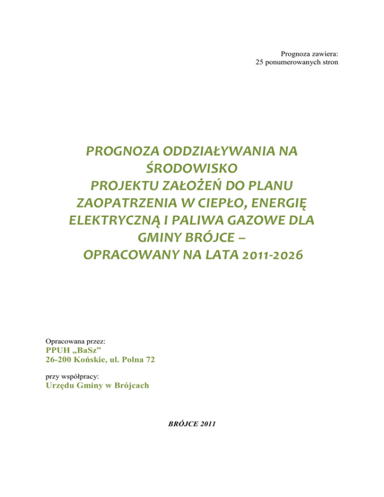 Prognoza zawiera: 25 ponumerowanych stron PROGNOZA ODDZIAŁYWANIA NA ŚRODOWISKO PROJEKTU ZAŁOŻEŃ DO PLANU ZAOPATRZENIA W CIEPŁO, ENERGIĘ ELEKTRYCZNĄ I PALIWA GAZOWE DLA GMINY BRÓJCE – OPRACOWANY NA LATA 2011-2026 Opracowana przez: PPUH „BaSz” 26-200 Końskie, ul. Polna 72 przy współpracy: Urzędu Gminy w Brójcach BRÓJCE 2011 Prognoza oddziaływania na środowisko „Projektu założeń do planu zaopatrzenia w ciepło, energię elektryczną i paliwa gazowe dla Gminy Rzgów- opracowany na lata 2011-2026” ____________________________________________________________________________________________________ SPIS TREŚCI 1. Wprowadzenie ............................................................................................... 3 1.1. Podstawa prawna i cel opracowania prognozy ................................................... 3 1.2. Zawartość merytoryczna prognozy .................................................................... 3 2. Analiza zawartości „Projektu założeń do planu zaopatrzenia w ciepło, energię elektryczną i paliwa gazowe dla Gminy Brójce” .................................................................. 4 2.1. Zawartość „Projektu założeń…” ........................................................................ 4 2.2. Założenia ocenianego dokumentu ...................................................................... 5 2.3. Powiązania „Projektu założeń…” z innymi dokumentami strategicznymi ........ 6 3. Analiza stanu środowiska naturalnego ........................................................... 7 3.1. Istniejący stan środowiska oraz problemy jego ochrony z punktu widzenia realizacji „Projektu założeń…” ze szczególnym uwzględnieniem terenów podlegających ochronie ...................................................................................... 7 3.2. Potencjalne zmiany stanu środowiska w przypadku braku realizacji „Projektu założeń…” ........................................................................................................ 15 4. Przewidywane oddziaływanie na środowisko ...............................................16 4.1. Stan środowiska na obszarach objętych przewidywanym znaczącym oddziaływaniem ................................................................................................ 16 4.2. Przewidywane znaczące oddziaływania (bezpośrednie, pośrednie, wtórne, skumulowane, krótkoterminowe, średnioterminowe i długoterminowe, stałe, chwilowe, pozytywne i negatywne) na środowisko w tym na obszar Natura 2000 .................................................................................................................. 17 4.3. Uwzględnienie założeń ochrony środowiska w dokumencie ........................... 21 4.4. Propozycje rozwiązań służących zapobieganiu, ograniczaniu lub kompensacji przyrodniczej negatywnych oddziaływań na środowisko w związku z realizacją „Projektu założeń…” ........................................................................................ 22 4.5. Niedostatki i braki materiałów utrudniające ocenę szkodliwego oddziaływania na środowisko ustaleń projektowanego dokumentu ......................................... 23 4.6. Oddziaływania transgraniczne związane z realizacją „Projektu założeń…” ... 23 5. Informacje końcowe ......................................................................................23 5.1. Metody wykorzystane przy opracowaniu prognozy i analizie realizacji Programu założeń ............................................................................................. 23 5.2. Metody analizy realizacji skutków „Projektu założeń…” ................................ 24 6. Streszczenie w języku niespecjalistycznym ..................................................24 2 Prognoza oddziaływania na środowisko „Projektu założeń do planu zaopatrzenia w ciepło, energię elektryczną i paliwa gazowe dla Gminy Rzgów- opracowany na lata 2011-2026” ____________________________________________________________________________________________________ 1. Wprowadzenie 1.1. Podstawa prawna i cel opracowania prognozy Podstawą prawną sporządzenia niniejszej „Prognozy oddziaływania na środowisko „Projektu założeń do planu zaopatrzenia w ciepło, energię elektryczną i paliwa gazowe dla Gminy Brójce - opracowany na lata 2011-2026” jest art. 46 ustawy z dnia 3 października 2008 r. o udostępnianiu informacji o środowisku i jego ochronie, udziale społeczeństwa w ochronie środowiska oraz o ocenach oddziaływania na środowisko (Dz. U. z 2008 Nr 199, poz. 1227). Artykuł ten zobowiązuje organy administracji opracowujące projekty polityk, strategii, planów lub programów obowiązek przeprowadzenia postępowania w sprawie oceny oddziaływania na środowisko skutków realizacji tych dokumentów. Związane jest to ze stosowaniem w prawodawstwie polskim postanowień Dyrektywy 2001/42/WE z 27 czerwca 2001 roku w sprawie oceny wpływu niektórych planów i programów na środowisko. Zgodnie z zapisami ustawowymi (Prawo ochrony środowiska, art. 46) przeprowadzenia strategicznej oceny oddziaływania na środowisko wymagają projekty: „strategii rozwoju regionalnego (…) polityki, strategie, plany lub programy dotyczące w szczególności przemysłu, energetyki, transportu, telekomunikacji, gospodarki wodnej, gospodarki odpadami, gospodarki przestrzennej, leśnictwa, rolnictwa, rybołówstwa, turystyki i wykorzystania terenu, opracowywane lub przyjmowane przez organy administracji (…) polityk, strategii, planów lub programów, których realizacja może spowodować znaczące oddziaływanie na obszar natura 2000”. Nadrzędnym celem prognozy jest określenie potencjalnych skutków w środowisku, jakie mogą wystąpić po wdrożeniu zapisów „Projektu założeń...”, jak również sformułowanie zaleceń o charakterze przeciwdziałania lub 