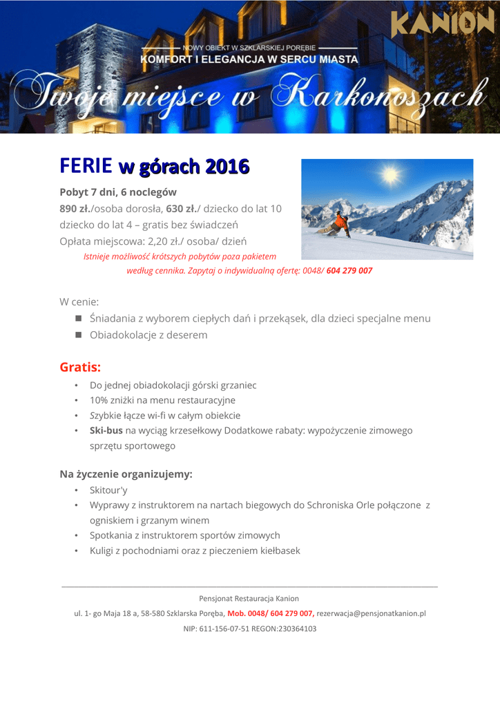 FERIE w górach 2016 Pobyt 7 dni, 6 noclegów 890 zł./osoba dorosła, 630 zł./ dziecko do lat 10 dziecko do lat 4 – gratis bez świadczeń Opłata miejscowa: 2,20 zł./ osoba/ dzień Istnieje możliwość krótszych pobytów poza pakietem według cennika. Zapytaj o indywidualną ofertę: 0048/ 604 279 007 W cenie: Śniadania z wyborem ciepłych dań i przekąsek, dla dzieci specjalne menu Obiadokolacje z deserem Gratis: • Do jednej obiadokolacji górski grzaniec • 10% zniżki na menu restauracyjne • Szybkie łącze wi-fi w całym obiekcie • Ski-bus na wyciąg krzesełkowy Dodatkowe rabaty: wypożyczenie zimowego sprzętu sportowego Na życzenie organizujemy: • Skitour'y • Wyprawy z instruktorem na nartach biegowych do Schroniska Orle połączone z ogniskiem i grzanym winem • Spotkania z instruktorem sportów zimowych • Kuligi z pochodniami oraz z pieczeniem kiełbasek __________________________________________________________________________________________ Pensjonat Restauracja Kanion ul. 1- go Maja 18 a, 58-580 Szklarska Poręba, Mob. 0048/ 604 279 007, [email protected] NIP: 611-156-07-51 REGON:230364103