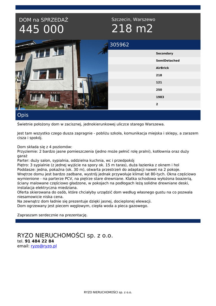Szczecin, Warszewo DOM na SPRZEDAŻ 218 m2 445 000 305962 Secondary SemiDetached AirBrick 218 121 250 1983 2 Opis Świetnie położony dom w zacisznej, jednokierunkowej uliczce starego Warszewa. Jest tam wszystko czego dusza zapragnie - pobliżu szkoła, komunikacja miejska i sklepy, a zarazem cisza i spokój. Dom składa się z 4 poziomów: Przyziemie: 2 bardzo jasne pomieszczenia (jedno może pełnić rolę pralni), kotłownia oraz duży garaż Parter: duży salon, sypialnia, oddzielna kuchnia, wc i przedpokój Piętro: 3 sypialnie (z jednej wyjście na spory ok. 15 m taras), duża łazienka z oknem i hol Poddasze: jedna, pokaźna (ok. 30 m), otwarta przestrzeń do adaptacji nawet na 2 pokoje. Wnętrze domu jest bardzo zadbane, wystrój jednak przywołuje klimat lat 80-tych. Okna częściowo wymienione - na parterze PCV, na piętrze stare drewniane. Klatka schodowa wyłożona boazerią, ściany malowane częściowo gładzone, w pokojach na podłogach leżą solidne drewniane deski, instalacja elektryczna miedziana. Oferta skierowana do osób, które chciałyby urządzić dom według własnego gustu na co pozwala niesamowicie niska cena. Na zewnątrz dom ładnie się prezentuje dzięki jasnej, docieplonej elewacji. Dom ogrzewany jest piecem węglowym, ciepła woda a pieca gazowego. Zapraszam serdecznie na prezentację. RYZO NIERUCHOMOŚCI sp. z o.o. tel. 91 484 22 84 email: [email protected] RYZO NIERUCHOMOŚCI sp. z o.o. Powered by TCPDF (www.tcpdf.org)