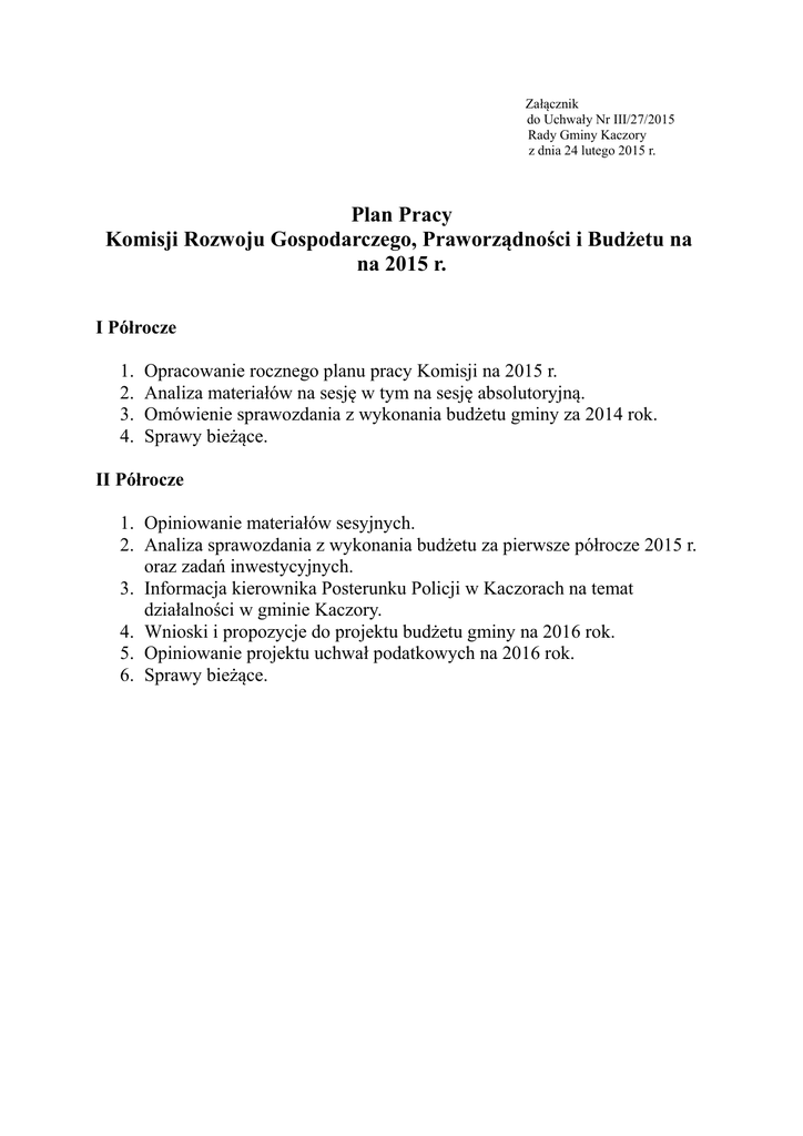 Załącznik do Uchwały Nr III/27/2015 Rady Gminy Kaczory z dnia 24 lutego 2015 r. Plan Pracy Komisji Rozwoju Gospodarczego, Praworządności i Budżetu na na 2015 r. I Półrocze 1. 2. 3. 4. Opracowanie rocznego planu pracy Komisji na 2015 r. Analiza materiałów na sesję w tym na sesję absolutoryjną. Omówienie sprawozdania z wykonania budżetu gminy za 2014 rok. Sprawy bieżące. II Półrocze 1. Opiniowanie materiałów sesyjnych. 2. Analiza sprawozdania z wykonania budżetu za pierwsze półrocze 2015 r. oraz zadań inwestycyjnych. 3. Informacja kierownika Posterunku Policji w Kaczorach na temat działalności w gminie Kaczory. 4. Wnioski i propozycje do projektu budżetu gminy na 2016 rok. 5. Opiniowanie projektu uchwał podatkowych na 2016 rok. 6. Sprawy bieżące.