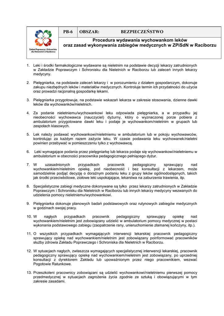 PB-6 OBSZAR: BEZPIECZEŃSTWO Procedura wydawania wychowankom leków oraz zasad wykonywania zabiegów medycznych w ZPiSdN w Raciborzu 1. Leki i środki farmakologiczne wydawane są nieletnim na podstawie decyzji lekarzy zatrudnionych w Zakładzie Poprawczym i Schronisku dla Nieletnich w Raciborzu lub zaleceń innych lekarzy medycyny. 2. Pielęgniarka, na podstawie zaleceń lekarzy i w porozumieniu z działem gospodarczym, dokonuje zakupu niezbędnych leków i materiałów medycznych. Kontroluje termin ich przydatności do użycia oraz prowadzi racjonalną gospodarkę lekami. 3. Pielęgniarka przygotowuje, na podstawie wskazań lekarza w zakresie stosowania, dzienne dawki leków dla wychowanków/nieletnich. 4. Za podanie nieletniemu/wychowankowi leku odpowiada pielęgniarka, a w przypadku jej nieobecności wychowawca (nauczyciel) dyżurny, który o wyznaczonej porze pobiera z ambulatorium przygotowane dawki leku i podaje je wychowankom/nieletnim w grupach lub zespołach klasowych. 5. Lek należy podawać wychowankowi/nieletniemu w ambulatorium lub w pokoju wychowawców, kontrolując za każdym razem zażycie leku. W czasie podawania leku wychowanek/nieletni powinien przebywać w pomieszczeniu tylko z wychowawcą. 6. Leki wymagające podania przez pielęgniarkę lub lekarza podaje się wychowankowi/nieletniemu w ambulatorium w obecności pracownika pedagogicznego pełniącego dyżur. 7. W uzasadnionych przypadkach pracownik pedagogiczny sprawujący nad wychowankiem/nieletnim opiekę, pod nieobecność i bez konsultacji z lekarzem, może samodzielnie podjąć decyzję o doraźnym podaniu leku z grupy leków ogólnodostępnych, takich jak środki przeciwbólowe, ziołowe leki uspokajające, lekarstwa na zaburzenia trawienia, itp. 8. Specjalistyczne zabiegi medyczne dokonywane są tylko przez lekarzy zatrudnionych w Zakładzie Poprawczym i Schronisku dla Nieletnich w Raciborzu lub innych lekarzy medycyny wezwanych do udzielenia pomocy nieletniemu/wychowankowi. 9. Pielęgniarka dokonuje planowych badań podstawowych oraz rutynowych zabiegów medycznych w godzinach swojej pracy. 10. W nagłych przypadkach pracownik pedagogiczny sprawujący opiekę nad wychowankiem/nieletnim jest zobowiązany udzielić w ambulatorium pomocy medycznej w postaci wykonania podstawowego zabiegu (zaopatrzenie rany, unieruchomienie złamanej kończyny, itp.). 11. O wszystkich przypadkach wymagających interwencji lekarskiej pracownik pedagogiczny sprawujący opiekę nad wychowankiem/nieletnim jest zobowiązany poinformować pracowników służby zdrowia Zakładu Poprawczego i Schroniska dla Nieletnich w Raciborzu. 12. W sytuacjach nagłych, zwłaszcza wymagających specjalistycznej interwencji lekarskiej, pracownik pedagogiczny sprawujący opiekę nad wychowankiem/nieletnim jest zobowiązany, po uprzedniej konsultacji z dyrektorem Zakładu lub upoważnionym przez niego pracownikiem, wezwać Pogotowie Ratunkowe. 13. Przeszkoleni pracownicy zobowiązani są udzielić wychowankowi/nieletniemu pierwszej pomocy przedmedycznej w sytuacjach zagrożenia życia zgodnie ze sztuką i obowiązującymi w tym zakresie zasadami. Na podstawie §4 ust. 2 oraz Regulaminu Zakładu Poprawczego i Schroniska dla Nieletnich w Raciborzu z dnia 30.08.2011 r. dokument został zatwierdzony do użytku na posiedzeniu Rady Zakładu Poprawczego i Schroniska dla Nieletnich w Raciborzu na posiedzeniu w dniu 24.02.2015 r.