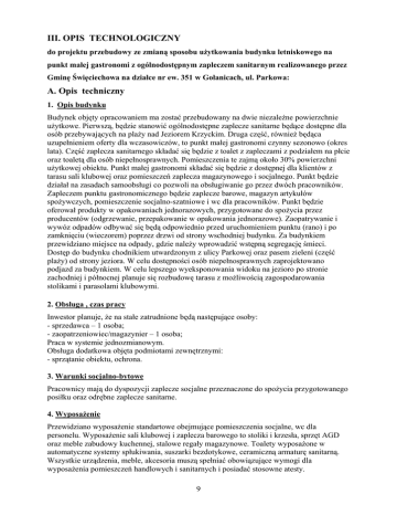 III. OPIS TECHNOLOGICZNY do projektu przebudowy ze zmianą sposobu użytkowania budynku letniskowego na punkt małej gastronomi z ogólnodostępnym zapleczem sanitarnym realizowanego przez Gminę Święciechowa na działce nr ew. 351 w Gołanicach, ul. Parkowa: A. Opis techniczny 1. Opis budynku Budynek objęty opracowaniem ma zostać przebudowany na dwie niezależne powierzchnie użytkowe. Pierwszą, będzie stanowić ogólnodostępne zaplecze sanitarne będące dostępne dla osób przebywających na plaży nad Jeziorem Krzyckim. Druga część, również będąca uzupełnieniem oferty dla wczasowiczów, to punkt małej gastronomi czynny sezonowo (okres lata). Część zaplecza sanitarnego składać się będzie z toalet z zapleczami z podziałem na płcie oraz toaletą dla osób niepełnosprawnych. Pomieszczenia te zajmą około 30% powierzchni użytkowej obiektu. Punkt małej gastronomi składać się będzie z dostępnej dla klientów z tarasu sali klubowej oraz pomieszczeń zaplecza magazynowego i socjalnego. Punkt będzie działał na zasadach samoobsługi co pozwoli na obsługiwanie go przez dwóch pracowników. Zapleczem punktu gastronomicznego będzie zaplecze barowe, magazyn artykułów spożywczych, pomieszczenie socjalno-szatniowe i wc dla pracowników. Punkt będzie oferował produkty w opakowaniach jednorazowych, przygotowane do spożycia przez producentów (odgrzewanie, przepakowanie w opakowania jednorazowe). Zaopatrywanie i wywóz odpadów odbywać się będą odpowiednio przed uruchomieniem punktu (rano) i po zamknięciu (wieczorem) poprzez drzwi od strony wschodniej budynku. Za budynkiem przewidziano miejsce na odpady, gdzie należy wprowadzić wstępną segregację śmieci. Dostęp do budynku chodnikiem utwardzonym z ulicy Parkowej oraz pasem zieleni (część plaży) od strony jeziora. W celu dostępności osób niepełnosprawnych zaprojektowano podjazd za budynkiem. W celu lepszego wyeksponowania widoku na jezioro po stronie zachodniej i północnej planuje się rozbudowę tarasu z możliwością zagospodarowania stolikami i parasolami klubowymi. 2. Obsługa , czas pracy Inwestor planuje, że na stałe zatrudnione będą następujące osoby: - sprzedawca – 1 osoba; - zaopatrzeniowiec/magazynier – 1 osoba; Praca w systemie jednozmianowym. Obsługa dodatkowa objęta podmiotami zewnętrznymi: - sprzątanie obiektu, ochrona. 3. Warunki socjalno-bytowe Pracownicy mają do dyspozycji zaplecze socjalne przeznaczone do spożycia przygotowanego posiłku oraz odrębne zaplecze sanitarne. 4. Wyposażenie Przewidziano wyposażenie standartowe obejmujące pomieszczenia socjalne, wc dla personelu. Wyposażenie sali klubowej i zaplecza barowego to stoliki i krzesła, sprzęt AGD oraz meble zabudowy kuchennej, stalowe regały magazynowe. Toalety wyposażone w automatyczne systemy spłukiwania, suszarki bezdotykowe, ceramiczną armaturę sanitarną. Wszystkie urządzenia, meble, akcesoria muszą spełniać obowiązujące wymogi dla wyposażenia pomieszczeń handlowych i sanitarnych i posiadać stosowne atesty. 9 5. Wytyczne budowlano-instalacyjne Wysokość użytkowa pomieszczeń będzie wynosić 2,70 m na całej powierzchni obiektu. Pomieszczenia należy wykończyć zgodnie z opisem poniżej: -sala klubowa: Podłogi wykończyć płytkami ceramicznymi. Ściany murowane wykończyć farbami do użytku wewnętrznego, do wysokości 2,0 m pokryć warstwami ochronnymi, zmywalnymi. Sufity wykonane z płyt sufitowych systemowych wykończone malarsko. -zaplecze barowe, pomieszczenia socjalne, toalety, przedsionek toalet ogólnodostępnych: Podłogi wykończyć płytkami ceramicznymi. Ściany wykończyć płytkami ceramicznymi, do wysokości 2,70 m. Sufity wykonane z płyt sufitowych systemowych, wykończyć warstwami malarskimi odpornymi na działanie pary wodnej i wilgoci. -pomieszczenia socjalno-szatniowe: Podłogi wykończyć płytkami ceramicznymi. Ściany murowane wykończyć farbami do użytku wewnętrznego, do wysokości 2,0 m pokryć warstwami ochronnymi, zmywalnymi. Sufity wykonane z płyt sufitowych systemowych wykończone malarsko. -pomieszczenia magazynowe, komunikacja: Podłogi wykończyć płytkami ceramicznymi. Ściany murowane wykończyć farbami do użytku wewnętrznego, do wysokości 2,0 m pokryć warstwami ochronnymi, zmywalnymi. Sufity wykonane z płyt sufitowych systemowych wykończone malarsko. W pomieszczeniach innych niż wc wokół umywalek i punktów czerpania wody wykonać fartuchy z płytek ceramicznych wykonany do wysokości 1,60 m i o szerokości elementu + 60 cm z każdej strony. 5.1 Stolarka drzwiowa i okienna Wysokość i szerokość elementów stolarki została podana na Rzucie przyziemia. Zaleca się zastosowanie stolarki PCV . Okna i przeszklone drzwi zewnętrzne powinny charakteryzować się współczynnikiem U=1,1, wewnętrzne U=2,8. Powierzchnie elementów stolarki powinny być gładkie i łatwe do utrzymania w czystości. W drzwiach do pomieszczeń sanitarnych przewidzieć kratkę nawiewną o powierzchni min. 0,022 m2. W pomieszczeniach silnie nasłonecznionych (strona południowa, zachodnia)zaleca się montaż regulowanych żaluzji lub rolet ograniczających dopływ światła zewnętrznego. Ze względu na okresowy czas użytkowania obiektu zaleca się montaż zewnętrznych rolet antywłamaniowych. 5.2 Wentylacja W pomieszczeniach przewiduje się zastosowanie wentylacji mechanicznej i grawitacyjnej. Wentylacja wywiewna w systemach grawitacyjnym i mechanicznym. W pomieszczeniach sanitarnych przy doborze urządzeń wentylacyjnych należy przyjąć 4-o krotną wymianę powietrza, w pozostałych 2-u krotną. Systemy wentylacji mechanicznej powinny być zespolone z włącznikami światła w pomieszczeniach. Na zapleczu barowym, w miejscu lokalizacji urządzeń do podgrzewania produktów spożywczych należy przewidzieć okap z wentylatorem mechanicznym. 10 5.3 Wymagania akustyczne Wszystkie urządzenia mechaniczne powodujące powstanie hałasu powinny b