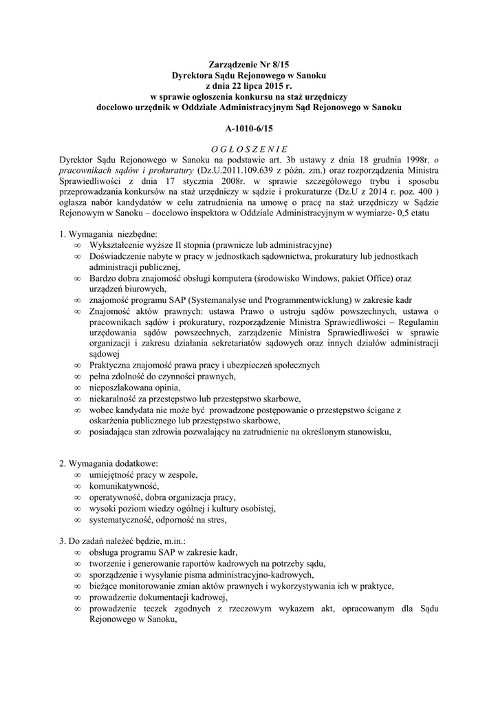 Zarządzenie Nr 8/15 Dyrektora Sądu Rejonowego w Sanoku z dnia 22 lipca 2015 r. w sprawie ogłoszenia konkursu na staż urzędniczy docelowo urzędnik w Oddziale Administracyjnym Sąd Rejonowego w Sanoku A-1010-6/15 OGŁOSZENIE Dyrektor Sądu Rejonowego w Sanoku na podstawie art. 3b ustawy z dnia 18 grudnia 1998r. o pracownikach sądów i prokuratury (Dz.U.2011.109.639 z późn. zm.) oraz rozporządzenia Ministra Sprawiedliwości z dnia 17 stycznia 2008r. w sprawie szczegółowego trybu i sposobu przeprowadzania konkursów na staż urzędniczy w sądzie i prokuraturze (Dz.U z 2014 r. poz. 400 ) ogłasza nabór kandydatów w celu zatrudnienia na umowę o pracę na staż urzędniczy w Sądzie Rejonowym w Sanoku – docelowo inspektora w Oddziale Administracyjnym w wymiarze- 0,5 etatu 1. Wymagania niezbędne: • Wykształcenie wyższe II stopnia (prawnicze lub administracyjne) • Doświadczenie nabyte w pracy w jednostkach sądownictwa, prokuratury lub jednostkach administracji publicznej, • Bardzo dobra znajomość obsługi komputera (środowisko Windows, pakiet Office) oraz urządzeń biurowych, • znajomość programu SAP (Systemanalyse und Programmentwicklung) w zakresie kadr • Znajomość aktów prawnych: ustawa Prawo o ustroju sądów powszechnych, ustawa o pracownikach sądów i prokuratury, rozporządzenie Ministra Sprawiedliwości – Regulamin urzędowania sądów powszechnych, zarządzenie Ministra Sprawiedliwości w sprawie organizacji i zakresu działania sekretariatów sądowych oraz innych działów administracji sądowej • Praktyczna znajomość prawa pracy i ubezpieczeń społecznych • pełna zdolność do czynności prawnych, • nieposzlakowana opinia, • niekaralność za przestępstwo lub przestępstwo skarbowe, • wobec kandydata nie może być prowadzone postępowanie o przestępstwo ścigane z oskarżenia publicznego lub przestępstwo skarbowe, • posiadająca stan zdrowia pozwalający na zatrudnienie na określonym stanowisku, 2. Wymagania dodatkowe: • umiejętność pracy w zespole, • komunikatywność, • operatywność, dobra organizacja pracy, • wysoki poziom wiedzy ogólnej i kultury osobistej, • systematyczność, odporność na stres, 3. Do zadań należeć będzie, m.in.: • obsługa programu SAP w zakresie kadr, • tworzenie i generowanie raportów kadrowych na potrzeby sądu, • sporządzenie i wysyłanie pisma administracyjno-kadrowych, • bieżące monitorowanie zmian aktów prawnych i wykorzystywania ich w praktyce, • prowadzenie dokumentacji kadrowej, • prowadzenie teczek zgodnych z rzeczowym wykazem akt, opracowanym dla Sądu Rejonowego w Sanoku,