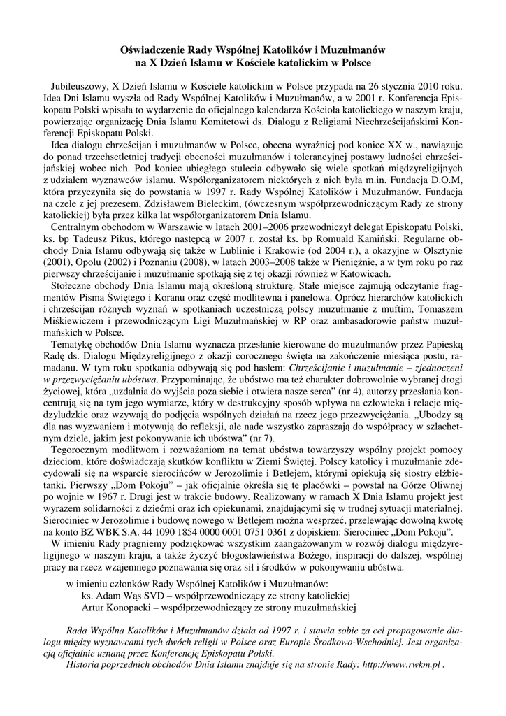 Oświadczenie Rady Wspólnej Katolików i Muzułmanów na X Dzień Islamu w Kościele katolickim w Polsce Jubileuszowy, X Dzień Islamu w Kościele katolickim w Polsce przypada na 26 stycznia 2010 roku. Idea Dni Islamu wyszła od Rady Wspólnej Katolików i Muzułmanów, a w 2001 r. Konferencja Episkopatu Polski wpisała to wydarzenie do oficjalnego kalendarza Kościoła katolickiego w naszym kraju, powierzając organizację Dnia Islamu Komitetowi ds. Dialogu z Religiami Niechrześcijańskimi Konferencji Episkopatu Polski. Idea dialogu chrześcijan i muzułmanów w Polsce, obecna wyraźniej pod koniec XX w., nawiązuje do ponad trzechsetletniej tradycji obecności muzułmanów i tolerancyjnej postawy ludności chrześcijańskiej wobec nich. Pod koniec ubiegłego stulecia odbywało się wiele spotkań międzyreligijnych z udziałem wyznawców islamu. Współorganizatorem niektórych z nich była m.in. Fundacja D.O.M, która przyczyniła się do powstania w 1997 r. Rady Wspólnej Katolików i Muzułmanów. Fundacja na czele z jej prezesem, Zdzisławem Bieleckim, (ówczesnym współprzewodniczącym Rady ze strony katolickiej) była przez kilka lat współorganizatorem Dnia Islamu. Centralnym obchodom w Warszawie w latach 2001–2006 przewodniczył delegat Episkopatu Polski, ks. bp Tadeusz Pikus, którego następcą w 2007 r. został ks. bp Romuald Kamiński. Regularne obchody Dnia Islamu odbywają się takŜe w Lublinie i Krakowie (od 2004 r.), a okazyjne w Olsztynie (2001), Opolu (2002) i Poznaniu (2008), w latach 2003–2008 takŜe w PienięŜnie, a w tym roku po raz pierwszy chrześcijanie i muzułmanie spotkają się z tej okazji równieŜ w Katowicach. Stołeczne obchody Dnia Islamu mają określoną strukturę. Stałe miejsce zajmują odczytanie fragmentów Pisma Świętego i Koranu oraz część modlitewna i panelowa. Oprócz hierarchów katolickich i chrześcijan róŜnych wyznań w spotkaniach uczestniczą polscy muzułmanie z muftim, Tomaszem Miśkiewiczem i przewodniczącym Ligi Muzułmańskiej w RP oraz ambasadorowie państw muzułmańskich w Polsce. Tematykę obchodów Dnia Islamu wyznacza przesłanie kierowane do muzułmanów przez Papieską Radę ds. Dialogu Międzyreligijnego z okazji corocznego święta na zakończenie miesiąca postu, ramadanu. W tym roku spotkania odbywają się pod hasłem: Chrześcijanie i muzułmanie – zjednoczeni w przezwycięŜaniu ubóstwa. Przypominając, Ŝe ubóstwo ma teŜ charakter dobrowolnie wybranej drogi Ŝyciowej, która „uzdalnia do wyjścia poza siebie i otwiera nasze serca” (nr 4), autorzy przesłania koncentrują się na tym jego wymiarze, który w destrukcyjny sposób wpływa na człowieka i relacje międzyludzkie oraz wzywają do podjęcia wspólnych działań na rzecz jego przezwycięŜania. „Ubodzy są dla nas wyzwaniem i motywują do refleksji, ale nade wszystko zapraszają do współpracy w szlachetnym dziele, jakim jest pokonywanie ich ubóstwa” (nr 7). Tegorocznym modlitwom i rozwaŜaniom na temat ubóstwa towarzyszy wspólny projekt pomocy dzieciom, które doświadczają skutków konfliktu w Ziemi Świętej. Polscy katolicy i muzułmanie zdecydowali się na wsparcie sierocińców w Jerozolimie i Betlejem, którymi opiekują się siostry elŜbietanki. Pierwszy „Dom Pokoju” – jak oficjalnie określa się te placówki – powstał na Górze Oliwnej po wojnie w 1967 r. Drugi jest w trakcie budowy. Realizowany w ramach X Dnia Islamu projekt jest wyrazem solidarności z dziećmi oraz ich opiekunami, znajdującymi się w trudnej sytuacji materialnej. Sierociniec w Jerozolimie i budowę nowego w Betlejem moŜna wesprzeć, przelewając dowolną kwotę na konto BZ WBK S.A. 44 1090 1854 0000 0001 0751 0361 z dopiskiem: Sierociniec „Dom Pokoju”. W imieniu Rady pragniemy podziękować wszystkim zaangaŜowanym w rozwój dialogu międzyreligijnego w naszym kraju, a takŜe Ŝyczyć błogosławieństwa BoŜego, inspiracji do dalszej, wspólnej pracy na rzecz wzajemnego poznawania się oraz sił i środków w pokonywaniu ubóstwa. w imieniu członków Rady Wspólnej Katolików i Muzułmanów: ks. Adam Wąs SVD – współprzewodniczący ze strony katolickiej Artur Konopacki – współprzewodniczący ze strony muzułmańskiej Rada Wspólna Katolików i Muzułmanów działa od 1997 r. i stawia sobie za cel propagowanie dialogu między wyznawcami tych dwóch religii w Polsce oraz Europie Środkowo-Wschodniej. Jest organizacją oficjalnie uznaną przez Konferencję Episkopatu Polski. Historia poprzednich obchodów Dnia Islamu znajduje się na stronie Rady: http://www.rwkm.pl .