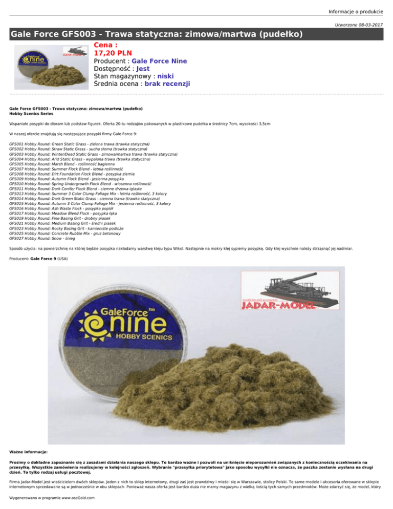 Informacje o produkcie Utworzono 08-03-2017 Gale Force GFS003 - Trawa statyczna: zimowa/martwa (pudełko) Cena : 17,20 PLN Producent : Gale Force Nine Dostępność : Jest Stan magazynowy : niski Średnia ocena : brak recenzji Gale Force GFS003 - Trawa statyczna: zimowa/martwa (pudełko) Hobby Scenics Series Wspaniałe posypki do dioram lub podstaw figurek. Oferta 20-tu rodzajów pakowanych w plastikowe pudełka o średnicy 7cm, wysokości 3,5cm W naszej ofercie znajdują się następujące posypki firmy Gale Force 9: GFS001 Hobby Round: Green Static Grass - zielona trawa (trawka statyczna) GFS002 Hobby Round: Straw Static Grass - sucha słoma (trawka statyczna) GFS003 Hobby Round: Winter/Dead Static Grass - zimowa/martwa trawa (trawka statyczna) GFS004 Hobby Round: Arid Static Grass - wypalona trawa (trawka statyczna) GFS005 Hobby Round: Marsh Blend - roślinność bagienna GFS007 Hobby Round: Summer Flock Blend - letnia roślinność GFS008 Hobby Round: Dirt Foundation Flock Blend - posypka ziemia GFS009 Hobby Round: Autumn Flock Blend - jesienna posypka GFS010 Hobby Round: Spring Undergrowth Flock Blend - wiosenna roślinność GFS011 Hobby Round: Dark Conifer Flock Blend - ciemne drzewa iglaste GFS013 Hobby Round: Summer 3 Color Clump Foliage Mix - letnia roślinność, 3 kolory GFS014 Hobby Round: Dark Green Static Grass - ciemna trawa (trawka statyczna) GFS015 Hobby Round: Autumn 3 Color Clump Foliage Mix - jesienna roślinność, 3 kolory GFS016 Hobby Round: Ash Waste Flock - posypka popiół GFS017 Hobby Round: Meadow Blend Flock - posypka łąka GFS019 Hobby Round: Fine Basing Grit - drobny piasek GFS021 Hobby Round: Medium Basing Grit - średni piasek GFS023 Hobby Round: Rocky Basing Grit - kamieniste podłoże GFS025 Hobby Round: Concrete Rubble Mix - gruz betonowy GFS027 Hobby Round: Snow - śnieg Sposób użycia: na powierzchnię na której będzie posypka nakładamy warstwę kleju typu Wikol. Następnie na mokry klej sypiemy posypkę. Gdy klej wyschnie należy strząsnąć jej nadmiar. Producent: Gale Force 9 (USA) Ważne informacje: Prosimy o dokładne zapoznanie się z zasadami działania naszego sklepu. To bardzo ważne i pozwoli na uniknięcie nieporozumień związanych z koniecznością oczekiwania na przesyłkę. Wszystkie zamówienia realizujemy w kolejności zgłoszeń. Wybranie "przesyłka priorytetowa" jako sposobu wysyłki nie oznacza, że paczka zostanie wysłana na drugi dzień. To tylko rodzaj usługi pocztowej. Firma Jadar-Model jest właścicielem dwóch sklepów. Jeden z nich to sklep internetowy, drugi zaś jest prawdziwy i mieści się w Warszawie, stolicy Polski. Te same modele i akcesoria oferowane w sklepie internetowym sprzedawane są w jednocześnie w obu sklepach. Ponieważ nasza oferta jest bardzo duża nie mamy magazynu z wielką ilością tych samych przedmiotów. Może zdarzyć się, że model, który Wygenerowano w programie www.oscGold.com chcesz kupić został sprzedany w drugim sklepie. Wtedy zostaniesz powiadomiony emailem, że realizacja Twojego zamówienia będzie dłuższa, ponieważ musimy uzupełnić magazyn i czekamy na dostawę od producenta. Prosimy o cierpliwość i wyrozumiałość. Nie ponosimy odpowiedzialności za różnicę w zawartości pudełka w stosunku do prezentowanego zdjęcia. Zdjęcia są zazwyczaj reklamówkami i mogą zawierać również inne części, które nie wchodzą w skład danego produktu. Salon Modelarski Jadar-Model Ul. Jagiellońska 58, 03-468 Warszawa (przy Pl.Hallera) tel.(0 22) 403-34-30 (w sprawie zamówień prosimy dzwonić: (0 22) 620-05-39) Tutaj jesteśmy - kliknij poniższy link: Warszawa, Jagiellońska 58 sklep jest czynny w godz.: pon.-pt. 11.oo 19.oo sobota 10.oo 14.oo