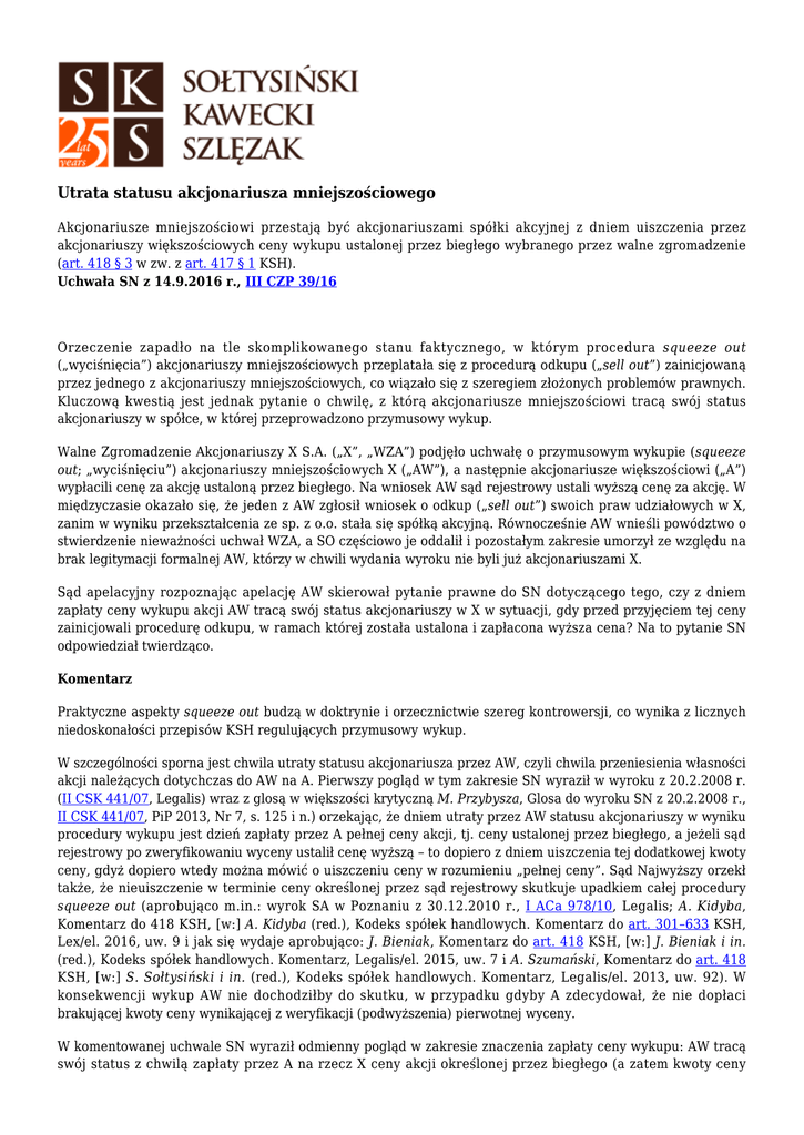 Utrata statusu akcjonariusza mniejszościowego Akcjonariusze mniejszościowi przestają być akcjonariuszami spółki akcyjnej z dniem uiszczenia przez akcjonariuszy większościowych ceny wykupu ustalonej przez biegłego wybranego przez walne zgromadzenie (art. 418 § 3 w zw. z art. 417 § 1 KSH). Uchwała SN z 14.9.2016 r., III CZP 39/16 Orzeczenie zapadło na tle skomplikowanego stanu faktycznego, w którym procedura squeeze out („wyciśnięcia”) akcjonariuszy mniejszościowych przeplatała się z procedurą odkupu („sell out”) zainicjowaną przez jednego z akcjonariuszy mniejszościowych, co wiązało się z szeregiem złożonych problemów prawnych. Kluczową kwestią jest jednak pytanie o chwilę, z którą akcjonariusze mniejszościowi tracą swój status akcjonariuszy w spółce, w której przeprowadzono przymusowy wykup. Walne Zgromadzenie Akcjonariuszy X S.A. („X”, „WZA”) podjęło uchwałę o przymusowym wykupie (squeeze out; „wyciśnięciu”) akcjonariuszy mniejszościowych X („AW”), a następnie akcjonariusze większościowi („A”) wypłacili cenę za akcję ustaloną przez biegłego. Na wniosek AW sąd rejestrowy ustali wyższą cenę za akcję. W międzyczasie okazało się, że jeden z AW zgłosił wniosek o odkup („sell out”) swoich praw udziałowych w X, zanim w wyniku przekształcenia ze sp. z o.o. stała się spółką akcyjną. Równocześnie AW wnieśli powództwo o stwierdzenie nieważności uchwał WZA, a SO częściowo je oddalił i pozostałym zakresie umorzył ze względu na brak legitymacji formalnej AW, którzy w chwili wydania wyroku nie byli już akcjonariuszami X. Sąd apelacyjny rozpoznając apelację AW skierował pytanie prawne do SN dotyczącego tego, czy z dniem zapłaty ceny wykupu akcji AW tracą swój status akcjonariuszy w X w sytuacji, gdy przed przyjęciem tej ceny zainicjowali procedurę odkupu, w ramach której została ustalona i zapłacona wyższa cena? Na to pytanie SN odpowiedział twierdząco. Komentarz Praktyczne aspekty squeeze out budzą w doktrynie i orzecznictwie szereg kontrowersji, co wynika z licznych niedoskonałości przepisów KSH regulujących przymusowy wykup. W szczególności sporna jest chwila utraty statusu akcjonariusza przez AW, czyli chwila przeniesienia własności akcji należących dotychczas do AW na A. Pierwszy pogląd w tym zakresie SN wyraził w wyroku z 20.2.2008 r. (II CSK 441/07, Legalis) wraz z glosą w większości krytyczną M. Przybysza, Glosa do wyroku SN z 20.2.2008 r., II CSK 441/07, PiP 2013, Nr 7, s. 125 i n.) orzekając, że dniem utraty przez AW statusu akcjonariuszy w wyniku procedury wykupu jest dzień zapłaty przez A pełnej ceny akcji, tj. ceny ustalonej przez biegłego, a jeżeli sąd rejestrowy po zweryfikowaniu wyceny ustalił cenę wyższą – to dopiero z dniem uiszczenia tej dodatkowej kwoty ceny, gdyż dopiero wtedy można mówić o uiszczeniu ceny w rozumieniu „pełnej ceny”. Sąd Najwyższy orzekł także, że nieuiszczenie w terminie ceny określonej przez sąd rejestrowy skutkuje upadkiem całej procedury squeeze out (aprobująco m.in.: wyrok SA w Poznaniu z 30.12.2010 r., I ACa 978/10, Legalis; A. Kidyba, Komentarz do 418 KSH, [w:] A. Kidyba (red.), Kodeks spółek handlowych. Komentarz do art. 301–633 KSH, Lex/el. 2016, uw. 9 i jak się wydaje aprobująco: J. Bieniak, Komentarz do art. 418 KSH, [w:] J. Bieniak i in. (red.), Kodeks spółek handlowych. Komentarz, Legalis/el. 2015, uw. 7 i A. Szumański, Komentarz do art. 418 KSH, [w:] S. Sołtysiński i in. (red.), Kodeks spółek handlowych. Komentarz, Legalis/el. 2013, uw. 92). W konsekwencji wykup AW nie dochodziłby do skutku, w przypadku gdyby A zdecydował, że nie dopłaci brakującej kwoty ceny wynikającej z weryfikacji (podwyższenia) pierwotnej wyceny. W komentowanej uchwale SN wyraził odmienny pogląd w zakresie znaczenia zapłaty ceny wykupu: AW tracą swój status z chwilą zapłaty przez A na rzecz X ceny akcji określonej przez biegłego (a zatem kwoty ceny wynikającej z pierwotnej wyceny). Jeżeli sąd rejestrowy ustali w wyniku weryfikacji wyceny wyższą cenę akcji, AW, jako osobom trzecim względem X, przysługuje wobec X roszczenie o wypłatę różnicy, co nie wpływa na fakt, że AW już utracili status akcjonariuszy. Sąd Najwyższy akcentował, że za taką interpretacją przemawia m.in. postulat szybkiego zrealizowania squeeze out. Za przejściem własności akcji w związku z wpłatą ceny ustalonej przez biegłego m.in.: R. Pabis, Komentarz do art. 418 KSH, [w:] A. Opalski (red.), Kodeks spółek handlowych. Komentarz, Legalis/el. 2016, uw. 43; W. Popiołek, Komentarz do art. 418 KSH, [w:] J. Strzępka (red.), Kodeks spółek handlowych. Komentarz, Legalis/el. 2015, uw. 17; tenże, Komentarz do art. do 418, [w:] M. Stec (red.), System Prawa Handlowego, Legalis/el. 2016, uw. 432 i n.; M. Przybysz, Glosa…, s. 128; A. Krysik, Komentarz do art. 418 KSH, [w:] Z. Jara (red.), Kodeks spółek handlowych. Komentarz, Legalis/el. 2017, uw. 27). Co więcej SN orzekł, że A są „związani uchwałą o przymusowym wykupie akcji”. W konsekwencji, podjęcie przez WZA uchwały o squeeze out skutkuje obowiązkiem doprowadzenia przez A do ustalenia ceny przez biegłego i przeprowadzenia squeeze out do końca, podczas gdy SN w wyroku z 2008 r. przyjął, że A mogą wycofać się z „wyciskania” AW nawet po orzeczeniu przez sąd rejestrowy o ostatecznej (podwyższonej) cenie za akcje AW. Podobny podgląd o braku możliwości wycofania się przez A ze squeeze out wyraził m.in.: SA w Poznaniu w wyroku z 17.4.2007 r., I ACa 155/07, niepubl. (tj. wyrok, który uchylił SN wyrokiem z 2008 r.) oraz M. Przybysz, który wprost opowiedział się za skutkiem rzeczowym (a nie jedynie zobowiązującym) uchwały o squeeze out (tenże, Glosa…, s. 128). W doktrynie pojawił się jeszcze inny wariant związania A procedurą squeeze out, zgodnie z którym termin na wpłatę przez A ceny z