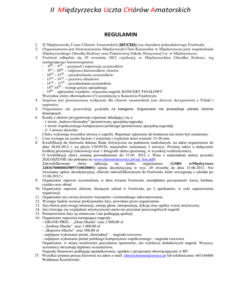 II Międzyrzecka Uczta CHórów Amatorskich REGULAMIN 1. 2. 3. 4. 5. 6. 7. 8. 9. 10. 11. 12. 13. 14. 15. 16. 17. II Międzyrzecka Uczta Chórów Amatorskich (MUCHA) ma charakter jednodniowego Festiwalu. Organizatorem jest Stowarzyszenie Międzyrzecki Chór Kameralny w Międzyrzeczu przy współudziale Międzyrzeckiego Ośrodka Kultury oraz Państwowej Szkoły Muzycznej I st. w Międzyrzeczu. Festiwal odbędzie się 29 września 2012 r.(sobota), w Międzyrzeckim Ośrodku Kultury, wg następującego harmonogramu: - 900 – 945 - przyjazd i rejestracja uczestników - 945 – 1000 – odprawa kierowników chórów - 1030 – 1330 - przesłuchania uczestników - 1330 – 1430 – przerwa obiadowa - 1430 - 1730 - przesłuchania uczestników - 1800-1840 – występ gościa specjalnego - 1900 – ogłoszenie wyników, wręczenie nagród, KONCERT FINAŁOWY Wszystkie chóry obowiązkowo (!) uczestniczą w Koncercie Finałowym. Impreza jest przeznaczona wyłącznie dla chórów amatorskich (nie dotyczy dyrygentów) z Polski i zagranicy. Organizator nie przewiduje podziału na kategorie. Organizator nie przewiduje udziału chórów dziecięcych. Każdy z chórów przygotowuje repertuar składający się z: - 1 utwór „ludowo-biesiadny” (premiowany specjalną nagrodą) - 1 utwór współczesnego kompozytora polskiego (premiowany specjalną nagrodą) - 2- 3 utwory dowolne Chóry wykonują wszystkie utwory a’capella. Repertuar zgłoszony do konkursu nie może byś zmieniony. Czas występu na scenie łącznie z wejściem i wyjściem musi wynosić 15-20 min. Kwalifikacji do festiwalu dokona Rada Artystyczna na podstawie nadesłanych, na adres organizatora do dnia 30.04.2012 r. na płycie CD/DVD, materiałów (minimum 3 utwory). Prosimy także o dołączenie krótkiej prezentacji (tekstowej) oraz 1 fotografii chóru (poziomej, w wysokiej rozdzielczości). O kwalifikacji chóry zostaną powiadomione do 31.05. 2012 r. Wraz z materiałami należy przesłać ZGŁOSZENIE (do pobrania na www.chormiedzyrzecz.pl/zgl_fest.pdf). Zakwalifikowane chóry opłacają na konto organizatora (GSBS o/Międzyrzecz 22836700000029897310020001) opłatę akredytacyjną w wys. 20 zł/osobę do dnia 15.06.2012. Nie zwracamy opłaty akredytacyjnej, chórom zakwalifikowanym do Festiwalu, które zrezygnują z udziału po 15.06.2012 r. Organizator zapewni uczestnikom, w dniu trwania Festiwalu, nieodpłatny poczęstunek: kawa, herbata, ciastko oraz obiad. Organizator zapewni chórom, biorącym udział w Festiwalu, po 2 opiekunów, w celu usprawnienia organizacji. Organizator nie zwraca kosztów transportu i ewentualnego zakwaterowania. Występy będzie oceniać profesjonalne Jury, powołane przez organizatora. Jury bierze pod uwagę intonację, emisję głosu, interpretację, dykcję oraz ogólny wyraz artystyczny. Jury kierując się względami artystycznymi może nie przyznać poszczególnych nagród. Postanowienia Jury są ostateczne i nie podlegają apelacji. Organizator zapewnia następujące nagrody: - GRAND PRIX – „Złota Mucha” oraz 2 000,00 zł - „Srebrna Mucha” oraz 1 000,00 zł - „Brązowa Mucha” oraz 500,00 zł - najlepsze wykonanie pieśni „biesiadnej” - nagroda rzeczowa - najlepsze wykonanie pieśni polskiego kompozytora współczesnego – nagroda rzeczowa Organizator, w miarę możliwości pozyskania sponsorów, nie wyklucza dodatkowych nagród. Wszyscy uczestnicy otrzymają dyplomy uczestnictwa. Nagrody finansowe podlegają opodatkowaniu, zgodnie z przepisami obowiązującymi w RP. Wszelkie pytania proszę kierować na adres e-mail: [email protected] lub telefonicznie: 601166886 Waldemar Kozielewski.