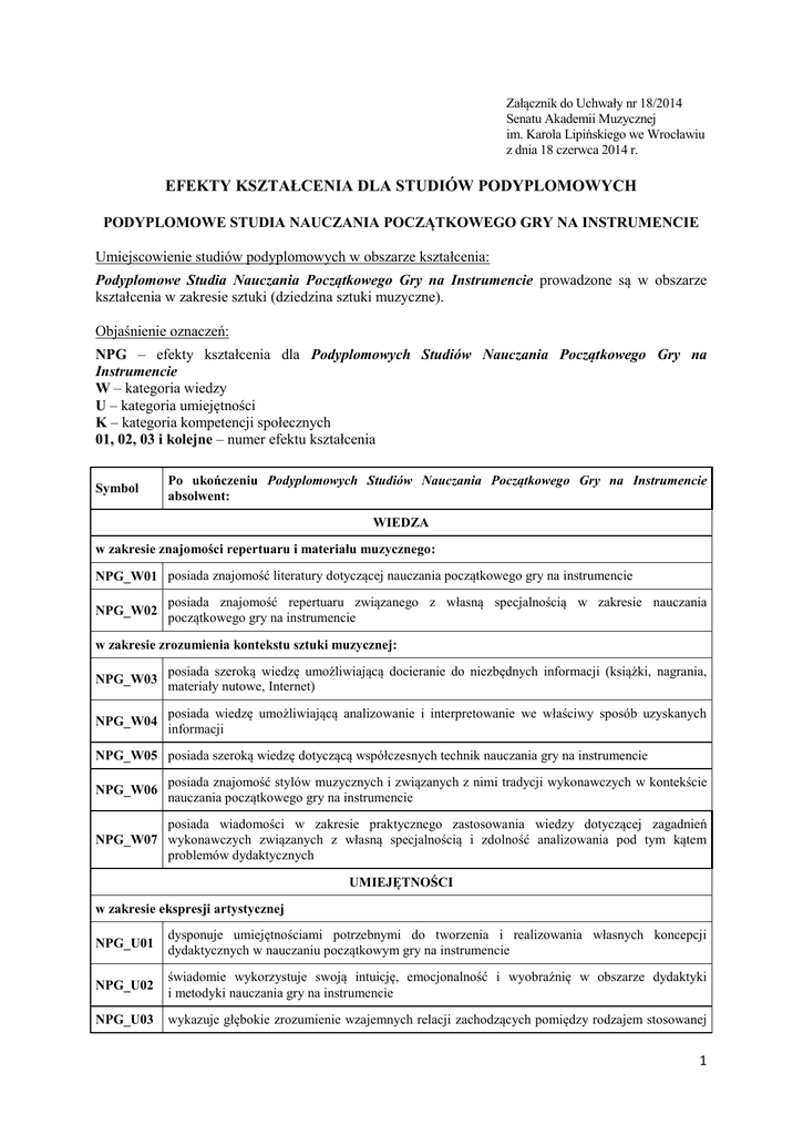 Załącznik do Uchwały nr 18/2014 Senatu Akademii Muzycznej im. Karola Lipińskiego we Wrocławiu z dnia 18 czerwca 2014 r. EFEKTY KSZTAŁCENIA DLA STUDIÓW PODYPLOMOWYCH PODYPLOMOWE STUDIA NAUCZANIA POCZĄTKOWEGO GRY NA INSTRUMENCIE Umiejscowienie studiów podyplomowych w obszarze kształcenia: Podyplomowe Studia Nauczania Początkowego Gry na Instrumencie prowadzone są w obszarze kształcenia w zakresie sztuki (dziedzina sztuki muzyczne). Objaśnienie oznaczeń: NPG – efekty kształcenia dla Podyplomowych Studiów Nauczania Początkowego Gry na Instrumencie W – kategoria wiedzy U – kategoria umiejętności K – kategoria kompetencji społecznych 01, 02, 03 i kolejne – numer efektu kształcenia Symbol Po ukończeniu Podyplomowych Studiów Nauczania Początkowego Gry na Instrumencie absolwent: WIEDZA w zakresie znajomości repertuaru i materiału muzycznego: NPG_W01 posiada znajomość literatury dotyczącej nauczania początkowego gry na instrumencie NPG_W02 posiada znajomość repertuaru związanego z własną specjalnością w zakresie nauczania początkowego gry na instrumencie w zakresie zrozumienia kontekstu sztuki muzycznej: NPG_W03 posiada szeroką wiedzę umożliwiającą docieranie do niezbędnych informacji (książki, nagrania, materiały nutowe, Internet) NPG_W04 posiada wiedzę umożliwiającą analizowanie i interpretowanie we właściwy sposób uzyskanych informacji NPG_W05 posiada szeroką wiedzę dotyczącą współczesnych technik nauczania gry na instrumencie NPG_W06 posiada znajomość stylów muzycznych i związanych z nimi tradycji wykonawczych w kontekście nauczania początkowego gry na instrumencie posiada wiadomości w zakresie praktycznego zastosowania wiedzy dotyczącej zagadnień NPG_W07 wykonawczych związanych z własną specjalnością i zdolność analizowania pod tym kątem problemów dydaktycznych UMIEJĘTNOŚCI w zakresie ekspresji artystycznej NPG_U01 dysponuje umiejętnościami potrzebnymi do tworzenia i realizowania własnych koncepcji dydaktycznych w nauczaniu początkowym gry na instrumencie NPG_U02 świadomie wykorzystuje swoją intuicję, emocjonalność i wyobraźnię w obszarze dydaktyki i metodyki nauczania gry na instrumencie NPG_U03 wykazuje głębokie zrozumienie wzajemnych relacji zachodzących pomiędzy rodzajem stosowanej 1 metodyki nauczania a niesionym przez nią komunikatem w zakresie repertuaru NPG_U04 posiada znajomość i umiejętność właściwego doboru i interpretowania repertuaru związanego z własną specjalnością w zakresie nauczania początkowego gry na instrumencie NPG_U05 posiada zdolność umiejętnego wykorzystywania wiedzy dotyczącej podstawowych kryteriów stylistycznych wykonywanych utworów NPG_U06 posiada umiejętność tworzenia programów nauczania początkowego gry na instrumencie w zakresie ćwiczenia i pracy podczas prób NPG_U07 wykazuje umiejętność czytelnego i doskonalenia warsztatu gry przekazania dziecku efektywnych technik ćwiczenia w zakresie publicznych prezentacji NPG_U08 wykazuje dużą dojrzałość i umiejętność świadomego stosowania technik pozwalających panować nad objawami stresu NPG_U09 biorąc pod uwagę specyficzne wymagania słuchaczy i inne okoliczności towarzyszące wystąpieniu publicznemu, świadomie i swobodnie panuje nad jego przebiegiem KOMPETENCJE SPOŁECZNE w zakresie niezależności NPG_K01 gromadzi, analizuje i w świadomy sposób interpretuje potrzebne informacje NPG_K02 swobodnie realizuje własne koncepcje i działania dydaktyczne i artystyczne wynikające z wykorzystania wiedzy, wyobraźni i intuicji NPG_K03 umiejętnie organizuje pracę własną i zespołową w ramach realizacji wspólnych zadań i projektów w zakresie krytycyzmu NPG_K04 posiada umiejętność samooceny, budowania konstruktywnej krytyki w obrębie działań dydaktycznych i artystycznych w zakresie komunikacji społecznej NPG_K05 swobodnie komunikuje się w obrębie własnego środowiska i społeczności NPG_K06 w sposób zorganizowany podchodzi do rozwiązywania problemów dotyczących własnych działań dydaktycznych oraz szeroko pojętych prac projektowych w zakresie uwarunkowań psychologicznych NPG_K07 świadomie wykorzystuje wiedzę o rozwoju psychofizycznym dziecka w procesie nauczania początkowego gry na instrumencie NPG_K08 świadomie umie zaplanować swoją ścieżkę kariery zawodowej na podstawie zdobytych umiejętności, wykorzystując również wiedzę zdobytą w procesie ustawicznego samokształcenia 2