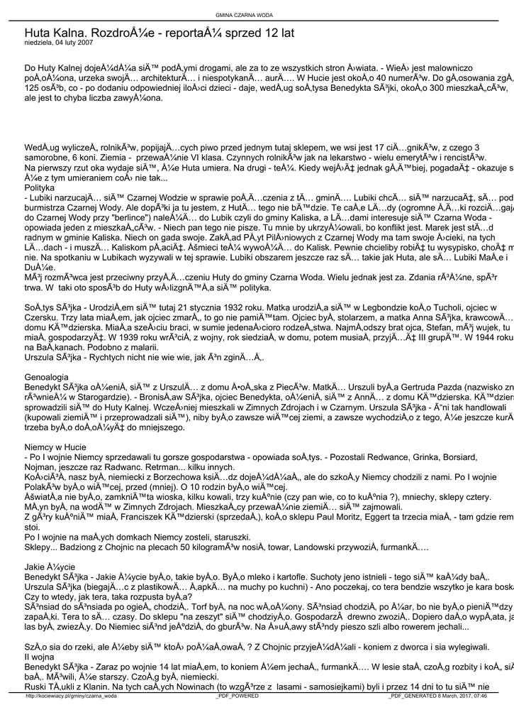 GMINA CZARNA WODA Huta Kalna. Rozdroże - reportaż sprzed 12 lat niedziela, 04 luty 2007 Do Huty Kalnej dojeżdża siÄ™ podÅ‚ymi drogami, ale za to ze wszystkich stron Å›wiata. - WieÅ› jest malowniczo poÅ‚ożona, urzeka swojÄ… architekturÄ… i niespotykanÄ… aurÄ…. W Hucie jest okoÅ‚o 40 numerów. Do gÅ‚osowania zgÅ‚ 125 osób, co - po dodaniu odpowiedniej iloÅ›ci dzieci - daje, wedÅ‚ug soÅ‚tysa Benedykta Sójki, okoÅ‚o 300 mieszkaÅ„ców, ale jest to chyba liczba zawyżona. WedÅ‚ug wyliczeÅ„ rolników, popijajÄ…cych piwo przed jednym tutaj sklepem, we wsi jest 17 ciÄ…gników, z czego 3 samorobne, 6 koni. Ziemia - przeważnie VI klasa. Czynnych rolników jak na lekarstwo - wielu emerytów i rencistów. Na pierwszy rzut oka wydaje siÄ™, że Huta umiera. Na drugi - też. Kiedy wejść jednak głębiej, pogadać - okazuje si że z tym umieraniem coÅ› nie tak... Polityka - Lubiki narzucajÄ… siÄ™ Czarnej Wodzie w sprawie połączenia z tÄ… gminÄ…. Lubiki chcÄ… siÄ™ narzucać, sÄ… podm burmistrza Czarnej Wody. Ale dopóki ja tu jestem, z HutÄ… tego nie bÄ™dzie. Te caÅ‚e LÄ…dy (ogromne łąki rozciÄ…gajÄ do Czarnej Wody przy "berlince") należą do Lubik czyli do gminy Kaliska, a LÄ…dami interesuje siÄ™ Czarna Woda opowiada jeden z mieszkaÅ„ców. - Niech pan tego nie pisze. Tu mnie by ukrzyżowali, bo konflikt jest. Marek jest stÄ…d radnym w gminie Kaliska. Niech on gada swoje. ZakÅ‚ad PÅ‚yt PilÅ›niowych z Czarnej Wody ma tam swoje Å›cieki, na tych LÄ…dach - i muszÄ… Kaliskom pÅ‚acić. Åšmieci też wywożą do Kalisk. Pewnie chcieliby robić tu wysypisko, choć m nie. Na spotkaniu w Lubikach wyzywali w tej sprawie. Lubiki obszarem jeszcze raz sÄ… takie jak Huta, ale sÄ… Lubiki MaÅ‚e i Duże. Mój rozmówca jest przeciwny przyłączeniu Huty do gminy Czarna Woda. Wielu jednak jest za. Zdania różne, spór trwa. W taki oto sposób do Huty wÅ›lizgnęła siÄ™ polityka. SoÅ‚tys Sójka - UrodziÅ‚em siÄ™ tutaj 21 stycznia 1932 roku. Matka urodziÅ‚a siÄ™ w Legbondzie koÅ‚o Tucholi, ojciec w Czersku. Trzy lata miaÅ‚em, jak ojciec zmarÅ‚, to go nie pamiÄ™tam. Ojciec byÅ‚ stolarzem, a matka Anna Sójka, krawcowÄ…, domu KÄ™dzierska. MiaÅ‚a szeÅ›ciu braci, w sumie jedenaÅ›cioro rodzeÅ„stwa. NajmÅ‚odszy brat ojca, Stefan, mój wujek, tu miaÅ‚ gospodarzyć. W 1939 roku wróciÅ‚ z wojny, rok siedziaÅ‚ w domu, potem musiaÅ‚ przyjąć III grupÄ™. W 1944 roku na BaÅ‚kanach. Podobno z malarii. Urszula Sójka - Rychtych nicht nie wie wie, jak ón zginÄ…Å‚. Genoalogia Benedykt Sójka ożeniÅ‚ siÄ™ z UrszulÄ… z domu Å•oÅ„ska z Pieców. MatkÄ… Urszuli byÅ‚a Gertruda Pazda (nazwisko zn również w Starogardzie). - BronisÅ‚aw Sójka, ojciec Benedykta, ożeniÅ‚ siÄ™ z AnnÄ… z domu KÄ™dzierska. KÄ™dziers sprowadzili siÄ™ do Huty Kalnej. WczeÅ›niej mieszkali w Zimnych Zdrojach i w Czarnym. Urszula Sójka - Óni tak handlowali (kupowali ziemiÄ™ i przeprowadzali siÄ™), niby byÅ‚o zawsze wiÄ™cej ziemi, a zawsze wychodziÅ‚o z tego, że jeszcze kurÄ™ trzeba byÅ‚o doÅ‚ożyć do mniejszego. Niemcy w Hucie - Po I wojnie Niemcy sprzedawali tu gorsze gospodarstwa - opowiada soÅ‚tys. - Pozostali Redwance, Grinka, Borsiard, Nojman, jeszcze raz Radwanc. Retrman... kilku innych. KoÅ›ciół nasz byÅ‚ niemiecki z Borzechowa ksiÄ…dz dojeżdżaÅ‚, ale do szkoÅ‚y Niemcy chodzili z nami. Po I wojnie Polaków byÅ‚o wiÄ™cej, przed (mniej). O 10 rodzin byÅ‚o wiÄ™cej. ÅšwiatÅ‚a nie byÅ‚o, zamkniÄ™ta wioska, kilku kowali, trzy kuźnie (czy pan wie, co to kuźnia ?), mniechy, sklepy cztery. MÅ‚yn byÅ‚ na wodÄ™ w Zimnych Zdrojach. MieszkaÅ„cy przeważnie ziemiÄ… siÄ™ zajmowali. Z góry kuźniÄ™ miaÅ‚ Franciszek KÄ™dzierski (sprzedaÅ‚), koÅ‚o sklepu Paul Moritz, Eggert ta trzecia miaÅ‚ - tam gdzie rem stoi. Po I wojnie na maÅ‚ych domkach Niemcy zosteli, staruszki. Sklepy... Badziong z Chojnic na plecach 50 kilogramów nosiÅ‚ towar, Landowski przywoziÅ‚ furmankÄ…. Jakie życie Benedykt Sójka - Jakie życie byÅ‚o, takie byÅ‚o. ByÅ‚o mleko i kartofle. Suchoty jeno istnieli - tego siÄ™ każdy baÅ‚. Urszula Sójka (biegajÄ…c z plastikowÄ… Å‚apkÄ… na muchy po kuchni) - Ano poczekaj, co tera bendzie wszytko je kara boska Czy to wtedy, jak tera, taka rozpusta byÅ‚a? Sónsiad do sónsiada po ogieÅ„ chodziÅ‚. Torf byÅ‚ na noc wÅ‚ożony. Sónsiad chodziÅ‚ po żar, bo nie byÅ‚o pieniÄ™dzy zapaÅ‚ki. Tera to sÄ… czasy. Do sklepu "na zeszyt" siÄ™ chodziyÅ‚o. Gospodarz drewno zwoziÅ‚. Dopiero daÅ‚o wypÅ‚ata, ja las byÅ‚ zwiezÅ‚y. Do Niemiec siónd jeździÅ‚ do gburów. Na Å»uÅ‚awy stóndy pieszo szli albo rowerem jechali... SzÅ‚o sia do rzeki, ale żeby siÄ™ ktoÅ› pożaÅ‚owaÅ‚ ? Z Chojnic przyjeżdżali - koniem z dworca i sia wylegiwali. II wojna Benedykt Sójka - Zaraz po wojnie 14 lat miaÅ‚em, to koniem żem jechaÅ‚, furmankÄ…. W lesie staÅ‚ czoÅ‚g rozbity i koÅ„ siÄ baÅ‚. Mówili, że starszy. CzoÅ‚g byÅ‚ niemiecki. Ruski TÅ‚ukli z Klanin. Na tych caÅ‚ych Nowinach (to wzgórze z lasami - samosiejkami) byli i przez 14 dni to tu siÄ™ nie http://kociewiacy.pl/gminy/czarna_woda _PDF_POWERED _PDF_GENERATED 8 March, 2017, 07:46 GMINA CZARNA WODA żyto. Ile tu byÅ‚o trupów, i cywilów i koni, i krów! Kiedy byÅ‚ front mieszkaÅ„cy wsi siedzieli na cmentarzu - w kierunku na Czarne. To byÅ‚ cmentarz niemiecki, teraz byÅ‚ wyÅ›wiÄ™cony. Na koÅ›ciele obserwator siedziaÅ‚, na wieży. I stÅ‚ukli koÅ›ciół aż do żebrów. Stajnie i gospodarstwa, już nie powróciÅ‚y do życia, ziemia rozebrali ludzie. Domy umierajÄ… ze