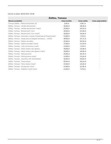 Cennik na dzień: 08-03-2017 10:46 Żółtko, Tomasz Nazwa produktu Tomasz Żółtko - Plakat koncertowy A2 Cena brutto Cena netto Cena poprzednia 1,00 zł 0,81 zł - Żółtko, Tomasz - Atrofia doczesności 35,00 zł 28,46 zł - Żółtko, Tomasz - Atrofia doczesności (mp3) 25,00 zł 20,33 zł - Żółtko, Tomasz - Bezsenność i kurz 29,00 zł 23,58 zł - Żółtko, Tomasz - Bezsenność i kurz (mp3) 20,00 zł 16,26 zł - Żółtko, Tomasz - Dominika z wyspy Poszukiwaczy Prawd (mp3) 12,00 zł 9,76 zł - Żółtko, Tomasz - Kiedy jeszcze biegały dinozaury... (3xCD) 39,00 zł 31,71 zł - Żółtko, Tomasz - Klatka skandalu 25,00 zł 20,33 zł - Żółtko, Tomasz - Klatka skandalu (mp3) 15,00 zł 12,20 zł - Żółtko, Tomasz - Listy do Karoliny (mp3) 12,00 zł 9,76 zł - Żółtko, Tomasz - Może ostatni taki głupiec 29,00 zł 23,58 zł - Żółtko, Tomasz - Może ostatni taki głupiec (mp3) 20,00 zł 16,26 zł - Żółtko, Tomasz - Nienasycenia 25,00 zł 20,33 zł - Żółtko, Tomasz - Nienasycenia (mp3) 15,00 zł 12,20 zł - Żółtko, Tomasz - Samotny wilk (Audiobook) 33,00 zł 26,83 zł - Żółtko, Tomasz - Targ mięsny 25,00 zł 20,33 zł - Żółtko, Tomasz - Targ mięsny (mp3) 15,00 zł 12,20 zł - Żółtko, Tomasz - W poprzek (mp3) 15,00 zł 12,20 zł - Żółtko, Tomasz - Wspólne myśli (mp3) 12,00 zł 9,76 zł - 1/1 Powered by TCPDF (www.tcpdf.org)