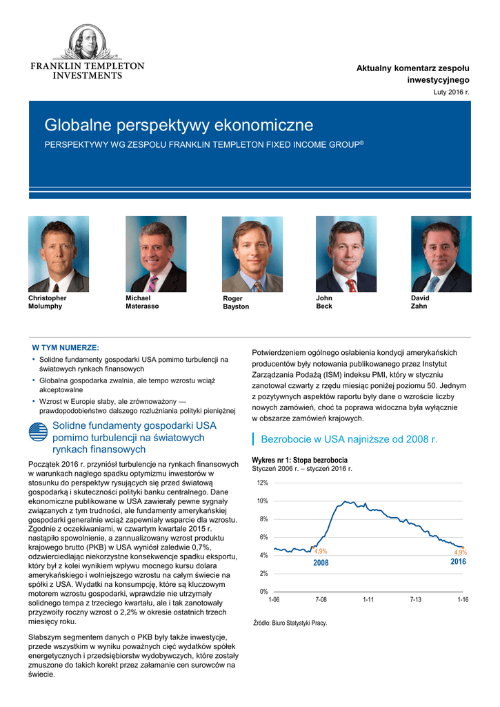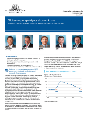 Aktualny komentarz zespołu inwestycyjnego Luty 2016 r. Globalne perspektywy ekonomiczne PERSPEKTYWY WG ZESPOŁU FRANKLIN TEMPLETON FIXED INCOME GROUP® Christopher Molumphy Michael Materasso W TYM NUMERZE: • Solidne fundamenty gospodarki USA pomimo turbulencji na światowych rynkach finansowych • Globalna gospodarka zwalnia, ale tempo wzrostu wciąż akceptowalne • Wzrost w Europie słaby, ale zrównoważony — prawdopodobieństwo dalszego rozluźniania polityki pieniężnej Solidne fundamenty gospodarki USA pomimo turbulencji na światowych rynkach finansowych Początek 2016 r. przyniósł turbulencje na rynkach finansowych w warunkach nagłego spadku optymizmu inwestorów w stosunku do perspektyw rysujących się przed światową gospodarką i skuteczności polityki banku centralnego. Dane ekonomiczne publikowane w USA zawierały pewne sygnały związanych z tym trudności, ale fundamenty amerykańskiej gospodarki generalnie wciąż zapewniały wsparcie dla wzrostu. Zgodnie z oczekiwaniami, w czwartym kwartale 2015 r. nastąpiło spowolnienie, a zannualizowany wzrost produktu krajowego brutto (PKB) w USA wyniósł zaledwie 0,7%, odzwierciedlając niekorzystne konsekwencje spadku eksportu, który był z kolei wynikiem wpływu mocnego kursu dolara amerykańskiego i wolniejszego wzrostu na całym świecie na spółki z USA. Wydatki na konsumpcję, które są kluczowym motorem wzrostu gospodarki, wprawdzie nie utrzymały solidnego tempa z trzeciego kwartału, ale i tak zanotowały przyzwoity roczny wzrost o 2,2% w okresie ostatnich trzech miesięcy roku. Słabszym segmentem danych o PKB były także inwestycje, przede wszystkim w wyniku poważnych cięć wydatków spółek energetycznych i przedsiębiorstw wydobywczych, które zostały zmuszone do takich korekt przez załamanie cen surowców na świecie. David Zahn John Beck Roger Bayston Potwierdzeniem ogólnego osłabienia kondycji amerykańskich producentów były notowania publikowanego przez Instytut Zarządzania Podażą (ISM) indeksu PMI, który w styczniu zanotował czwarty z rzędu miesiąc poniżej poziomu 50. Jednym z pozytywnych aspektów raportu były dane o wzroście liczby nowych zamówień, choć ta poprawa widoczna była wyłącznie w obszarze zamówień krajowych. Bezrobocie w USA najniższe od 2008 r. Wykres nr 1: Stopa bezrobocia Styczeń 2006 r. – styczeń 2016 r. 12% 10% 8% 6% 4,9% 4% 4,9% 2016 2008 2% 0% 1-06 7-08 Źródło: Biuro Statystyki Pracy. 1-11 7-13 1-16 Kolejne negatywne dane znalazły się w opublikowanych przez Rezerwę Federalną USA (Fed) kwartalnych wynikach badań warunków kredytowych w sektorze bankowym, które wskazywały na drugie z rzędu zaostrzenie kryteriów stosowanych przy udzielaniu kredytów w czwartym kwartale. Podczas gdy spółki powiązane z surowcami i producenci znaleźli się pod presją, zaczęły narastać spekulacje na temat możliwych konsekwencji tej sytuacji dla dotychczas prężnych segmentów gospodarki USA, a w szczególności rynku pracy i sektora usług. Dlatego styczniowe dobre dane o zatrudnieniu zostały dobrze przyjęte, choć wzrost liczby miejsc pracy o 151 tysięcy nie dorównał powszechnym oczekiwaniom. Niemniej jednak wzrost zatrudnienia wystarczył, by zepchnąć stopę bezrobocia do najniższego od 2008 r. poziomu 4,9%, natomiast wyjątkowo korzystnie wyglądał wzrost płac — stawki godzinowe zanotowały nadspodziewanie wysoki roczny wzrost na poziomie 2,5%. Rynki były jednak rozczarowane niespodziewanie dużym styczniowym spadkiem indeksu PMI dla sektorów poza produkcją, który wprawdzie wciąż wskazywał na ekspansję sektora usług, ale jednocześnie wykazał spadek dynamiki działalności gospodarczej, zatrudnienia i nowych zamówień. „ Stany Zjednoczone nie są całkowicie odporne na osłabienie innych rynków, ale uważamy, że czynniki fundamentalne sygnalizują solidną kondycję gospodarki USA. ” Inflacja wciąż była stłumiona. Inflacja zasadnicza mierzona indeksem wzrostu cen towarów i usług konsumpcyjnych (CPI) spadła w grudniu o 0,1% miesiąc do miesiąca (m/m), a ekwiwalentna inflacja bazowa (z wyłączeniem cen żywności i energii) zanotowała wzrost o podobnej wartości bezwzględnej. Obydwa wskaźniki nieco przyspieszyły w ujęciu rocznym w porównaniu z listopadowymi wynikami odpowiednio 0,7% i 2,1%. Podobny obraz sytuacji zarysował w tym samym okresie preferowany przez Fed wskaźnik inflacji, czyli wskaźnik wzrostu wydatków na konsumpcję osobistą (PCE); inflacja zasadnicza mierzona indeksem PCE spadła w grudniu o 0,1% m/m, a ekwiwalentna inflacja bazowa pozostała niezmienna, co przełożyło się na roczne wzrosty tych wskaźników o odpowiednio 0,6% i 1,4%. Zawirowania na rynkach światowych jeszcze bardziej skupiły powszechną uwagę na przyszłych krokach Fedu, po grudniowej decyzji o podwyższeniu bazowych stóp procentowych. Podczas tego posiedzenia, Fed oszacował, że stopy bazowe mogą wzrosnąć o kolejnych 100 punktów bazowych do końca 2016 r., ale w związku z nieprzerwanym napływem słabych danych dotyczących gospodarki światowej oraz wzmożoną zmiennością rynkową znacznie wolniejsze tempo podwyżek przewidywane przez powszechne prognozy rynkowe stawało się coraz bardziej realnym scenariuszem. Komentując wydarzenia mające miejsce od grudnia, szefowa Fedu Janet Yellen stwierdziła, że ciągłe wzrosty zatrudnienia i płac powinny zapewniać wsparcie dla gospodarki USA, ale jednocześnie przyznała, że dalsze turbulencje rynkowe mogą mieć destrukcyjny wpływ na wzrost w USA. Nie odrzuciła także prawdopodobieństwa dalszego zaostrzania polityki podkreślając, że decyzje Fedu będą uzależnione od interpretacji publikowanych danych dotyczących perspektyw ekonomicznych, a wszelkie potencjalne zmiany będą stopniowe. Ceny aktywów z USA uległy nagłym zmianom wraz ze znaczącym wzrostem awersji do ryzyka wśród inwestorów. Rentowność papierów skarbowych zbliżyła się 
