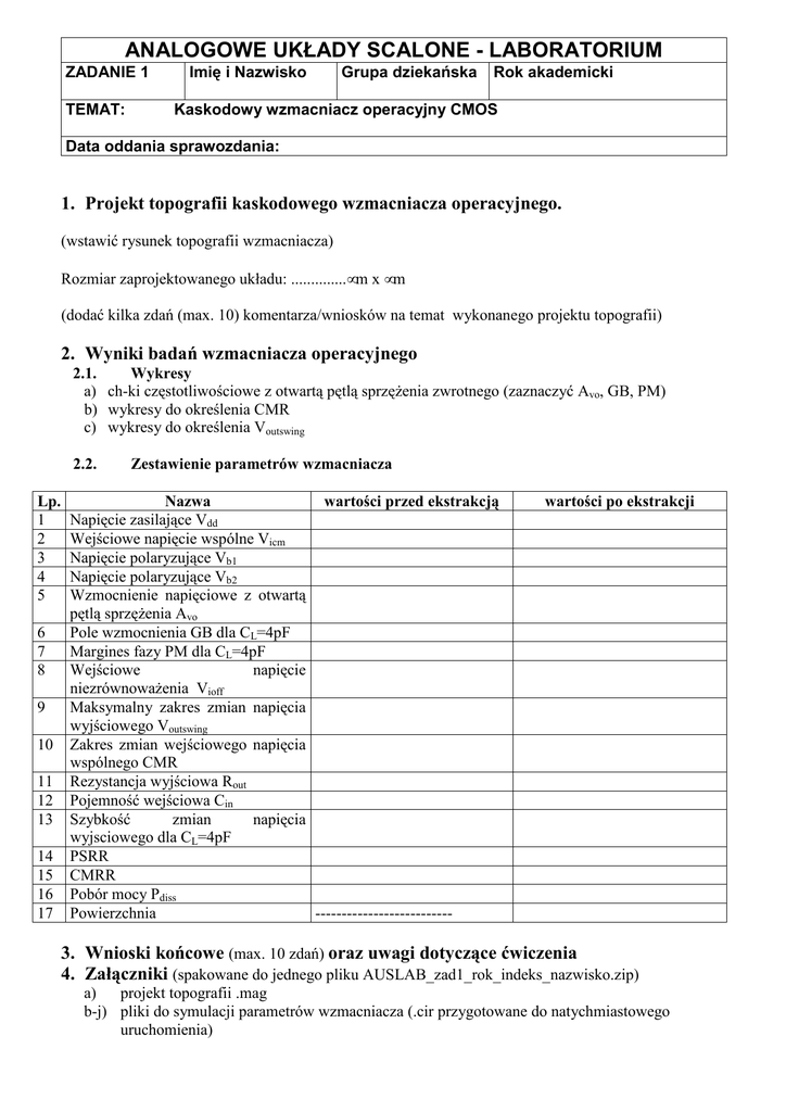 ANALOGOWE UKŁADY SCALONE - LABORATORIUM ZADANIE 1 TEMAT: Imię i Nazwisko Grupa dziekańska Rok akademicki Kaskodowy wzmacniacz operacyjny CMOS Data oddania sprawozdania: 1. Projekt topografii kaskodowego wzmacniacza operacyjnego. (wstawić rysunek topografii wzmacniacza) Rozmiar zaprojektowanego układu: ..............µm x µm (dodać kilka zdań (max. 10) komentarza/wniosków na temat wykonanego projektu topografii) 2. Wyniki badań wzmacniacza operacyjnego 2.1. Wykresy a) ch-ki częstotliwościowe z otwartą pętlą sprzęŜenia zwrotnego (zaznaczyć Avo, GB, PM) b) wykresy do określenia CMR c) wykresy do określenia Voutswing 2.2. Lp. 1 2 3 4 5 6 7 8 9 10 11 12 13 14 15 16 17 Zestawienie parametrów wzmacniacza Nazwa wartości przed ekstrakcją Napięcie zasilające Vdd Wejściowe napięcie wspólne Vicm Napięcie polaryzujące Vb1 Napięcie polaryzujące Vb2 Wzmocnienie napięciowe z otwartą pętlą sprzęŜenia Avo Pole wzmocnienia GB dla CL=4pF Margines fazy PM dla CL=4pF Wejściowe napięcie niezrównowaŜenia Vioff Maksymalny zakres zmian napięcia wyjściowego Voutswing Zakres zmian wejściowego napięcia wspólnego CMR Rezystancja wyjściowa Rout Pojemność wejściowa Cin Szybkość zmian napięcia wyjsciowego dla CL=4pF PSRR CMRR Pobór mocy Pdiss Powierzchnia -------------------------- wartości po ekstrakcji 3. Wnioski końcowe (max. 10 zdań) oraz uwagi dotyczące ćwiczenia 4. Załączniki (spakowane do jednego pliku AUSLAB_zad1_rok_indeks_nazwisko.zip) a) projekt topografii .mag b-j) pliki do symulacji parametrów wzmacniacza (.cir przygotowane do natychmiastowego uruchomienia)