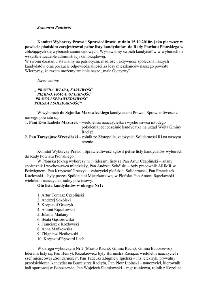 Szanowni Państwo! Komitet Wyborczy Prawo i Sprawiedliwość w dniu 15.10.2010r. jako pierwszy w powiecie płońskim zarejestrował pełne listy kandydatów do Rady Powiatu Płońskiego w zbliżających się wyborach samorządowych. Wystawiamy swoich kandydatów w wyborach na wszystkie szczeble administracji samorządowej. W swoim działaniu stawiamy na patriotyzm, mądrość i aktywność społeczną naszych kandydatów oraz poczucie odpowiedzialności za losy mieszkańców naszego powiatu. Wierzymy, że razem możemy zmienić nasze „małe Ojczyzny”. Nasze motto: „ PRAWDA, WIARA, ŻARLIWOŚĆ PIĘKNO, PRACA, OFIARNOŚĆ PRAWO I SPRAWIEDLIWOŚĆ POLSKA I SOLIDARNOŚĆ” W wyborach do Sejmiku Mazowieckiego kandydatami Prawa i Sprawiedliwości z naszego powiatu są: 1. Pani Ewa Izabela Mazurek – wieloletnia nauczycielka i wychowawca młodego pokolenia,jednocześnie kandydatka na urząd Wójta Gminy Raciąż 2. Pan Tarsycjusz Wrzesiński – rolnik ze Złotopolic, założyciel Solidarności RI na naszym terenie. Komitet Wyborczy Prawo i Sprawiedliwość zgłosił pełne listy kandydatów wyborach do Rady Powiatu Płońskiego. W Płońsku (okręg wyborczy nr1) liderami listy są Pan Artur Czapliński – znany społecznik i wychowawca młodzieży, Pan Andrzej Sokólski – były pracownik ARiMR w Poświętnem, Pan Krzysztof Graczyk – założyciel płońskiej Solidarności, Pan Franciszek Kozłowski – były prezes Spółdzielni Mieszkaniowej w Płońsku Pan Antoni Rączkowski – wieloletni nauczyciel, radny powiatowy. Oto lista kandydatów w okręgu Nr1: 1. Artur Tomasz Czapliński 2. Andrzej Sokólski 3. Krzysztof Graczyk 4. Antoni Rączkowski 5. Jolanta Madany 6. Beata Gąsiorowska 7. Franciszek Kozłowski 8. Anna Mańkowska 9. Zbigniew Pieńkowski 10. Krzysztof Ryszard Lech W okręgu wyborczym Nr 2 (Miasto Raciąż, Gmina Raciąż, Gmina Baboszewo) liderami listy są: Pan Henryk Kozakiewicz były Burmistrz Raciąża, wieloletni nauczyciel i szef miejscowej „Solidarności”, Pan Tadeusz Zbigniew Igielski – inż. elektryk, prywatny przedsiębiorca, kandydat na Burmistrza Raciąża, Pan Piotr Lipiński – nauczyciel, kierownik hali sportowej w Baboszewie, Pan Wojciech Słomkowski – mgr rolnictwa, rolnik z Kozolina. Oto lista kandydatów z okręgu Nr 2: 1. Henryk Kozakiewicz 2. Tadeusz Zbigniew Igielski 3. Wojciech Słodkowski 4. Zenon Liberadzki 5. Wojciech Goszczycki 6. Piotr Rychliński 7. Maciej Rawa 8. Tomasz Klonowski 9. Stefan Pawłowski 10. Piotr Stanisław Lipiński Liderami w okręgu wyborczym nr 3 (Gmina Sochocin, Gmina Joniec, Gmina Nowe Miasto) jest Pani Anna Zwierzchowska – były, wieloletni dyrektor szkoły w Sochocinie oraz Pełnomocnik Powiatowy Prawa i Sprawiedliwości w powiecie płońskim. Pani Anna Zwierzchowska jest również kandydatem w wyborach na urząd Wójta Gminy Sochocin, Pan Zbigniew Dzięgielewski z Nowego Miasta – obecny radny powiatowy, Pan Kazimierz Kowalski – działacz patriotyczny i solidarnościowy, przedsiębiorca z Popielżyna w gminie Joniec. Oto lista kandydatów w okręgu Nr 3: 1. 2. 3. 4. 5. 6. Anna Zwierzchowska Zbigniew Dzięgielewski Kazimierz Kowalski Andrzej Stępień Barbara Gołębiewska Cezary Brzeszkiewicz Listę kandydatów w okręgu wyborczym nr 4 (Gmina Czerwińsk, Gmina Naruszewo) otwiera Pan Artur Gilewski – przedsiębiorca, działacz rolniczy, były szef Samoobrony w powiecie płońskim, Pan Rajmund Okrasa – rolnik, plantator, obecny radny powiatowy. Oto lista kandydatów w okręgu Nr 4: 1. Artur Jacek Gilewski 2. Rajmund Okrasa 3. Tomasz Dłużniewski 4. Stanisław Kania 5. Róża Zielińska 6. Ewa Kruszewska 7. Jacek Paweł Zieliński 8. Krzysztof Wacław Caban W okręgu wyborczym Nr 5 (Gmina Płońsk, Gmina Załuski, Gmina Dzierzążnia) liderami listy są: Pan Krzysztof Wrzesiński – rolnik, członek Zarządu Okręgowego PiS w Płocku, Pan Tadeusz Krawczyk – były Wójt gminy Płońsk, Pan Włodzimierz Czyżewski – rolnik i przedsiębiorca z Dzierzążni. Oto lista kandydatów w okręgu Nr 5: 1. 2. 3. 4. 5. 6. 7. 8. Krzysztof Hieronim Wrzesiński Tadeusz Krawczyk Włodzimierz Czyżewski Wiesława Justat Robert Paradowski Daniel Skwarski Wiesław Błaszkiewicz Arkadiusz Szczeciński Naszymi dotychczas zarejestrowanymi kandydatami w wyborach bezpośrednich wójtów, burmistrzów i prezydentów są: 1. Tadeusz Zbigniew Igielski – kandydat na Burmistrza Raciąża 2. Anna Zwierzchowska - kandydatka na Wójta Gminy Sochocin 3. Ewa Izabela Mazurek – kandydatka na Wójta Gminy Raciąż Pozostałych kandydatów przedstawimy Państwu po zarejestrowaniu kolejnych list, co nastąpi w najbliższych dniach. Wówczas przedstawimy też Państwu założenia programowe dla powiatu płońskiego oraz założenia programowe naszych kandydatów w wyborach bezpośrednich. Z poważaniem Krzysztof Wrzesiński – szef Powiatowego Zespołu samorządowego PiS. w Płońsku Anna Zwierzchowska – Przewodnicząca Zarządu Komitetu Powiatowego PiS wPłońsku