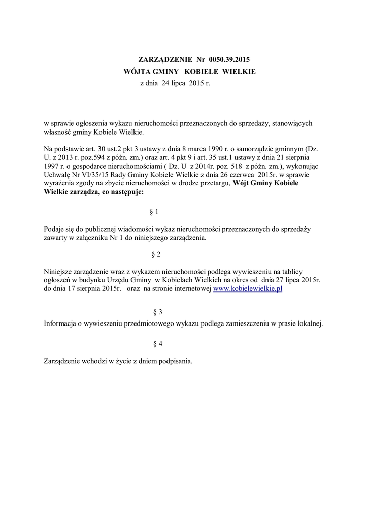 ZARZĄDZENIE Nr 0050.39.2015 WÓJTA GMINY KOBIELE WIELKIE z dnia 24 lipca 2015 r. w sprawie ogłoszenia wykazu nieruchomości przeznaczonych do sprzedaży, stanowiących własność gminy Kobiele Wielkie. Na podstawie art. 30 ust.2 pkt 3 ustawy z dnia 8 marca 1990 r. o samorządzie gminnym (Dz. U. z 2013 r. poz.594 z późn. zm.) oraz art. 4 pkt 9 i art. 35 ust.1 ustawy z dnia 21 sierpnia 1997 r. o gospodarce nieruchomościami ( Dz. U z 2014r. poz. 518 z późn. zm.), wykonując Uchwałę Nr VI/35/15 Rady Gminy Kobiele Wielkie z dnia 26 czerwca 2015r. w sprawie wyrażenia zgody na zbycie nieruchomości w drodze przetargu, Wójt Gminy Kobiele Wielkie zarządza, co następuje: §1 Podaje się do publicznej wiadomości wykaz nieruchomości przeznaczonych do sprzedaży zawarty w załączniku Nr 1 do niniejszego zarządzenia. §2 Niniejsze zarządzenie wraz z wykazem nieruchomości podlega wywieszeniu na tablicy ogłoszeń w budynku Urzędu Gminy w Kobielach Wielkich na okres od dnia 27 lipca 2015r. do dnia 17 sierpnia 2015r. oraz na stronie internetowej www.kobielewielkie.pl §3 Informacja o wywieszeniu przedmiotowego wykazu podlega zamieszczeniu w prasie lokalnej. §4 Zarządzenie wchodzi w życie z dniem podpisania.