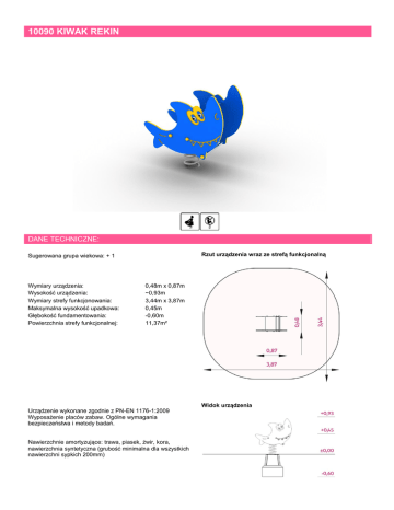 10090 KIWAK REKIN DANE TECHNICZNE: Rzut urządzenia wraz ze strefą funkcjonalną Sugerowana grupa wiekowa: + 1 Wymiary urządzenia: Wysokość urządzenia: Wymiary strefy funkcjonowania: Maksymalna wysokość upadkowa: Głębokość fundamentowania: Powierzchnia strefy funkcjonalnej: 0,48m x 0,87m ~0,93m 3,44m x 3,87m 0,45m -0,60m 11,37m² Urządzenie wykonane zgodnie z PN-EN 1176-1:2009 Wyposażenie placów zabaw. Ogólne wymagania bezpieczeństwa i metody badań. Nawierzchnie amortyzujące: trawa, piasek, żwir, kora, nawierzchnia syntetyczna (grubość minimalna dla wszystkich nawierzchni sypkich 200mm) Widok urządzenia MATERIAŁY: Całość urządzenia: płyty HDPE Uchwyty, podpory na nogi: stal nierdzewna Elementy stalowe: stal ocynkowana kąpielowo, malowana proszkowo Sprężyna: stal ocynkowana kąpielowo, malowana proszkowo Zaślepki: tworzywo sztuczne Podstawa fundamentowa: ażurowa konstrukcja stalowa Fundamenty: beton klasy min. B-15 SATERNUS DISTRIBUTION Sp. z o.o. sp. k. ul. Nowa 32 41-500 Chorzów SATERNUS DISTRIBUTION Sp. z o.o. sp. k. zastrzega sobie wszelkie prawa do ochrony praw autorskich na podstawie Ustawy z dnia 04.02.1994 r. o prawie autorskim i prawach pokrewnych ( DZ. U. Nr 28 poz. 83) a zwłaszcza art. 78 i 79 tejże ustawy. Właściciel certyfikatu: Producent: Dystrybutor: GRUPA SATERNUS Sp. z o.o. S. K. A. (następca prawny Place Zabaw Saternus Sp. z o.o.) Saternus Production Sp. z o.o. sp. k. Saternus Distribution Sp. z o.o. sp. k.