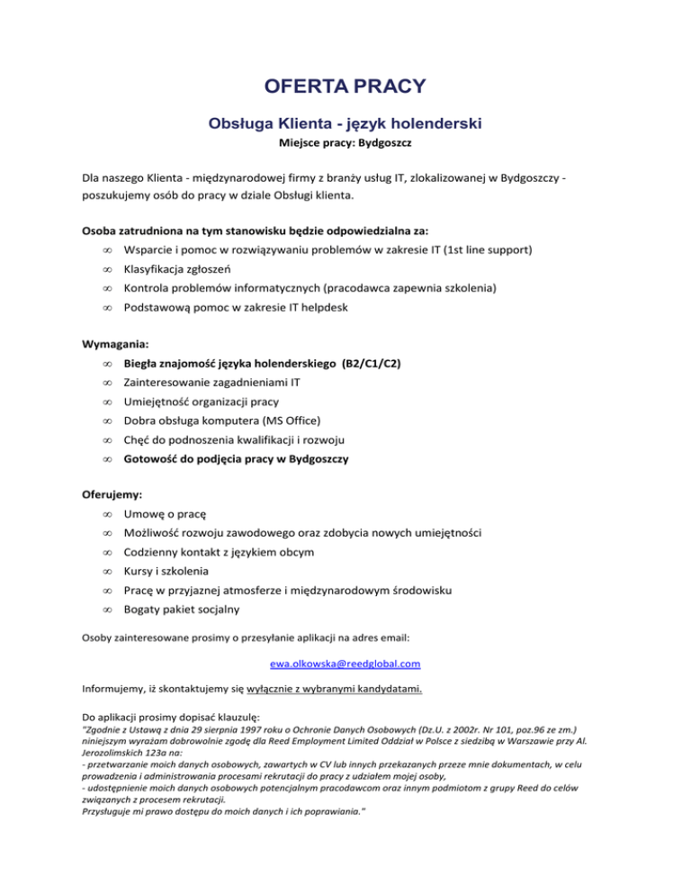 OFERTA PRACY Obsługa Klienta - język holenderski Miejsce pracy: Bydgoszcz Dla naszego Klienta - międzynarodowej firmy z branży usług IT, zlokalizowanej w Bydgoszczy poszukujemy osób do pracy w dziale Obsługi klienta. Osoba zatrudniona na tym stanowisku będzie odpowiedzialna za: • Wsparcie i pomoc w rozwiązywaniu problemów w zakresie IT (1st line support) • Klasyfikacja zgłoszeń • Kontrola problemów informatycznych (pracodawca zapewnia szkolenia) • Podstawową pomoc w zakresie IT helpdesk Wymagania: • Biegła znajomość języka holenderskiego (B2/C1/C2) • Zainteresowanie zagadnieniami IT • Umiejętność organizacji pracy • Dobra obsługa komputera (MS Office) • Chęć do podnoszenia kwalifikacji i rozwoju • Gotowość do podjęcia pracy w Bydgoszczy Oferujemy: • Umowę o pracę • Możliwość rozwoju zawodowego oraz zdobycia nowych umiejętności • Codzienny kontakt z językiem obcym • Kursy i szkolenia • Pracę w przyjaznej atmosferze i międzynarodowym środowisku • Bogaty pakiet socjalny Osoby zainteresowane prosimy o przesyłanie aplikacji na adres email: [email protected] Informujemy, iż skontaktujemy się wyłącznie z wybranymi kandydatami. Do aplikacji prosimy dopisać klauzulę: "Zgodnie z Ustawą z dnia 29 sierpnia 1997 roku o Ochronie Danych Osobowych (Dz.U. z 2002r. Nr 101, poz.96 ze zm.) niniejszym wyrażam dobrowolnie zgodę dla Reed Employment Limited Oddział w Polsce z siedzibą w Warszawie przy Al. Jerozolimskich 123a na: - przetwarzanie moich danych osobowych, zawartych w CV lub innych przekazanych przeze mnie dokumentach, w celu prowadzenia i administrowania procesami rekrutacji do pracy z udziałem mojej osoby, - udostępnienie moich danych osobowych potencjalnym pracodawcom oraz innym podmiotom z grupy Reed do celów związanych z procesem rekrutacji. Przysługuje mi prawo dostępu do moich danych i ich poprawiania."