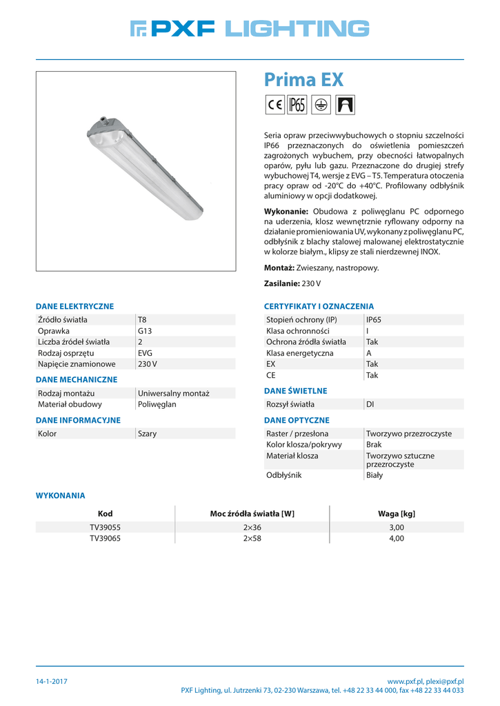Prima EX Seria opraw przeciwwybuchowych o stopniu szczelności IP66 przeznaczonych do oświetlenia pomieszczeń zagrożonych wybuchem, przy obecności łatwopalnych oparów, pyłu lub gazu. Przeznaczone do drugiej strefy wybuchowej T4, wersje z EVG – T5. Temperatura otoczenia pracy opraw od -20°C do +40°C. Profilowany odbłyśnik aluminiowy w opcji dodatkowej. Wykonanie: Obudowa z poliwęglanu PC odpornego na uderzenia, klosz wewnętrznie ryflowany odporny na działanie promieniowania UV, wykonany z poliwęglanu PC, odbłyśnik z blachy stalowej malowanej elektrostatycznie w kolorze białym., klipsy ze stali nierdzewnej INOX. Montaż: Zwieszany, nastropowy. Zasilanie: 230 V DANE ELEKTRYCZNE Źródło światła Oprawka Liczba źródeł światła Rodzaj osprzętu Napięcie znamionowe CERTYFIKATY I OZNACZENIA T8 G13 2 EVG 230 V Stopień ochrony (IP) Klasa ochronności Ochrona źródła światła Klasa energetyczna EX CE Uniwersalny montaż Poliwęglan DANE ŚWIETLNE DANE MECHANICZNE Rodzaj montażu Materiał obudowy Rozsył światła DANE INFORMACYJNE Kolor IP65 I Tak A Tak Tak DI DANE OPTYCZNE Szary Raster / przesłona Kolor klosza/pokrywy Materiał klosza Odbłyśnik Tworzywo przezroczyste Brak Tworzywo sztuczne przezroczyste Biały WYKONANIA 14-1-2017 Kod Moc źródła światła [W] Waga [kg] TV39055 TV39065 2×36 2×58 3,00 4,00 www.pxf.pl, [email protected] PXF Lighting, ul. Jutrzenki 73, 02-230 Warszawa, tel. +48 22 33 44 000, fax +48 22 33 44 033 WYMIARY W W H L B Kod L [mm] W [mm] H [mm] TV39055 1272 145 111 TV39065 1572 145 111 L = Długość | W = Szerokość | H = Wysokość / głębokość OTWORY MONTAŻOWE Kod A [mm] TV39055 700 TV39065 940 A = Długość rozstawu 14-1-2017 www.pxf.pl, [email protected] PXF Lighting, ul. Jutrzenki 73, 02-230 Warszawa, tel. +48 22 33 44 000, fax +48 22 33 44 033